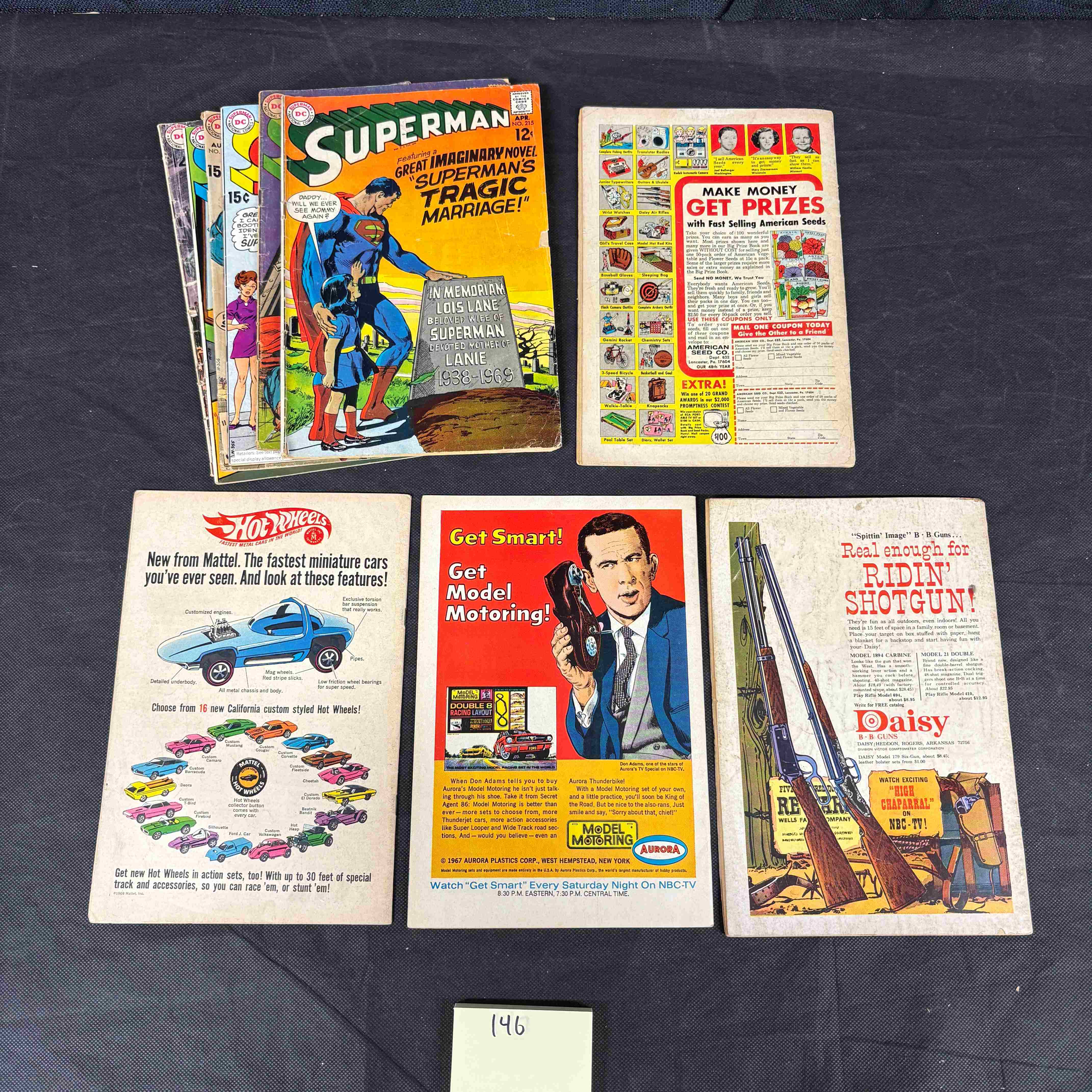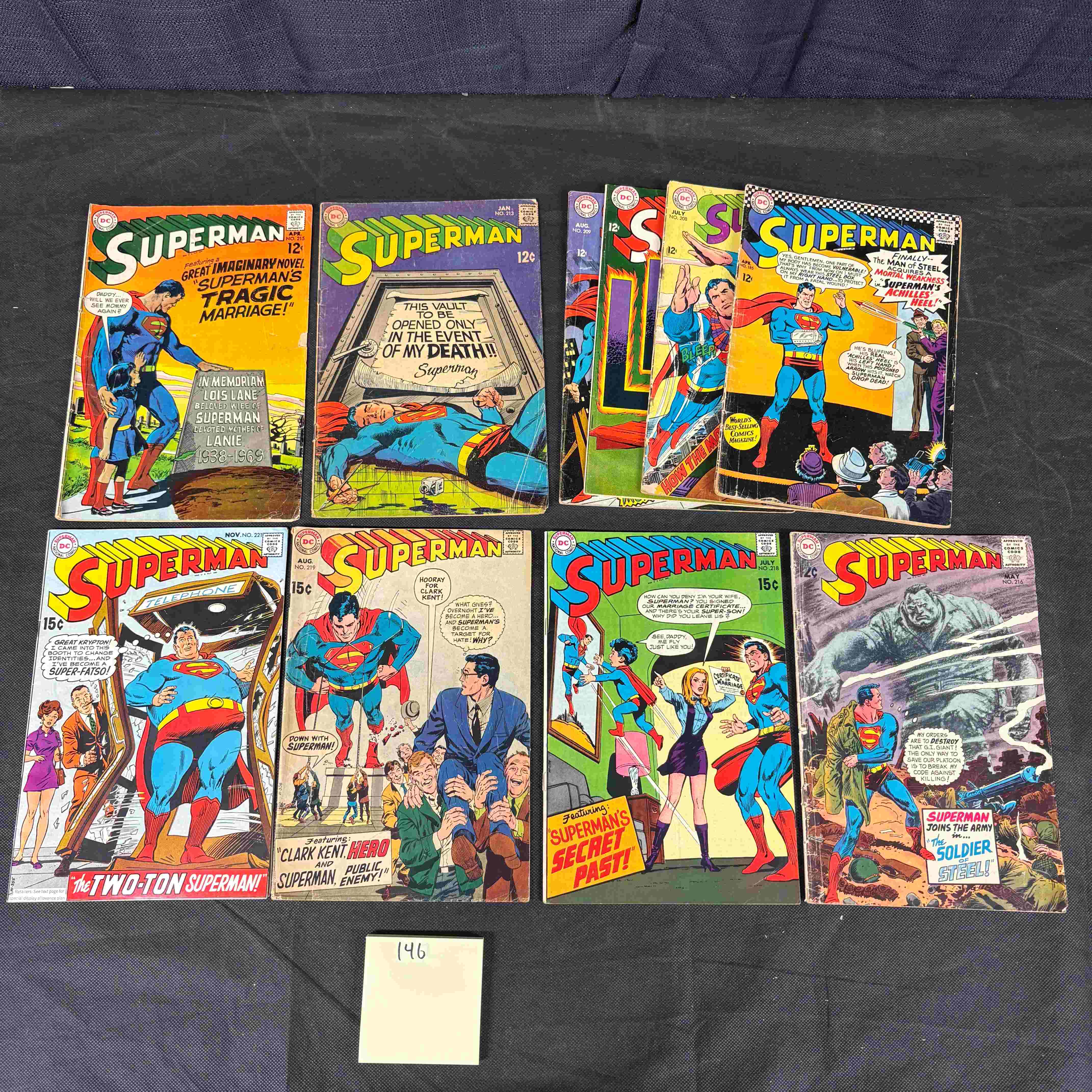 This lot presents a collection of approximately ten to twelve vintage American comic books, predominantly featuring “Superman” from DC Comics. The issues date from the mid-to-late 1960s to early 1970s, indicated by visible 12¢ and 15¢ price points and specific dates such as “1968” and “NOV 30.” The paper comics showcase classic Silver Age superhero artwork with prominent titles including “GREAT IMAGINARY NOVEL SUPERMAN’S TRAGIC MARRIAGE!”, “WHY DO THESE INITIALS MEAN DEATH?”, “THE TWO-TON SUPERMAN!”, and “SUPERMAN JOINS THE ARMY!”. Among the collection is Superman #204, dated 1968.