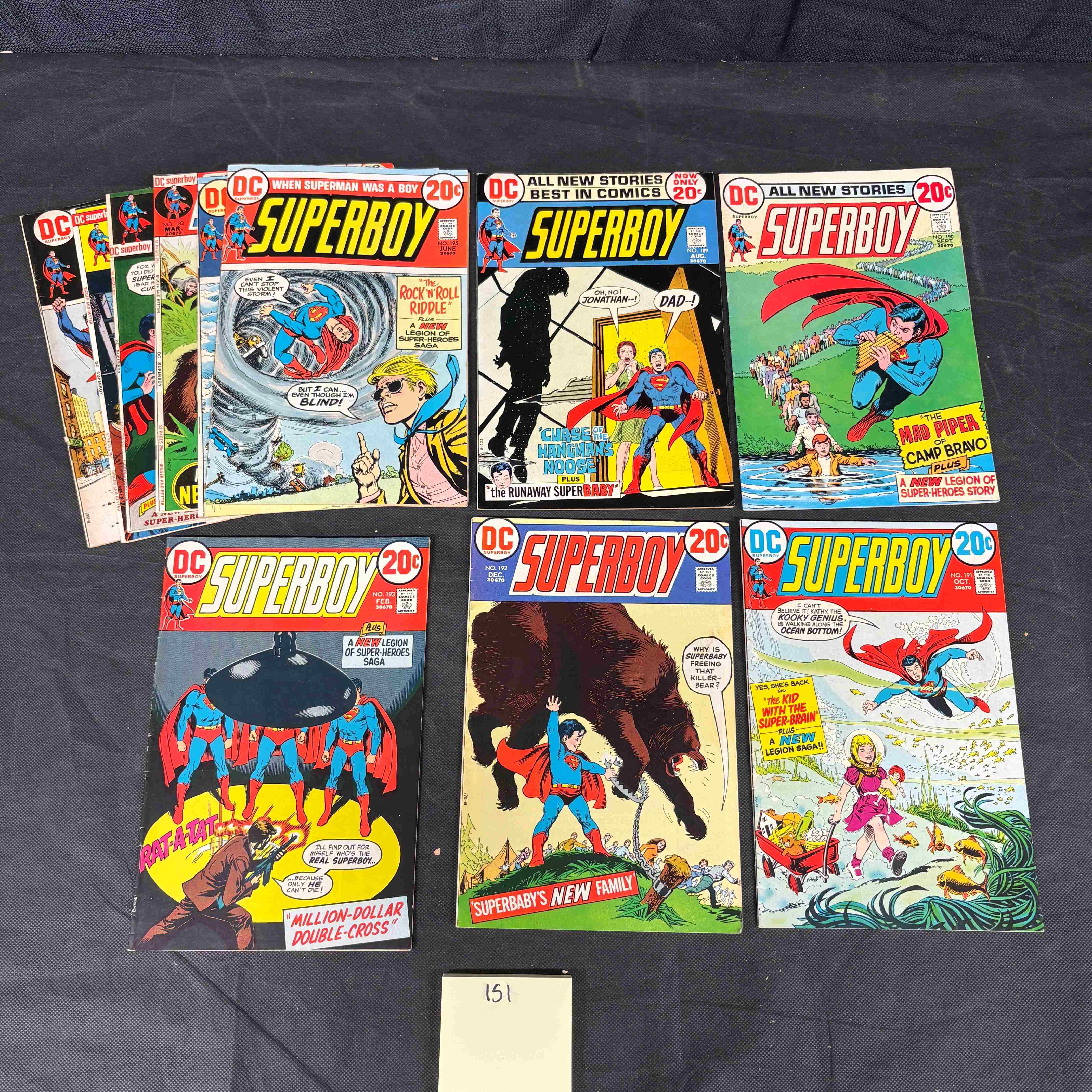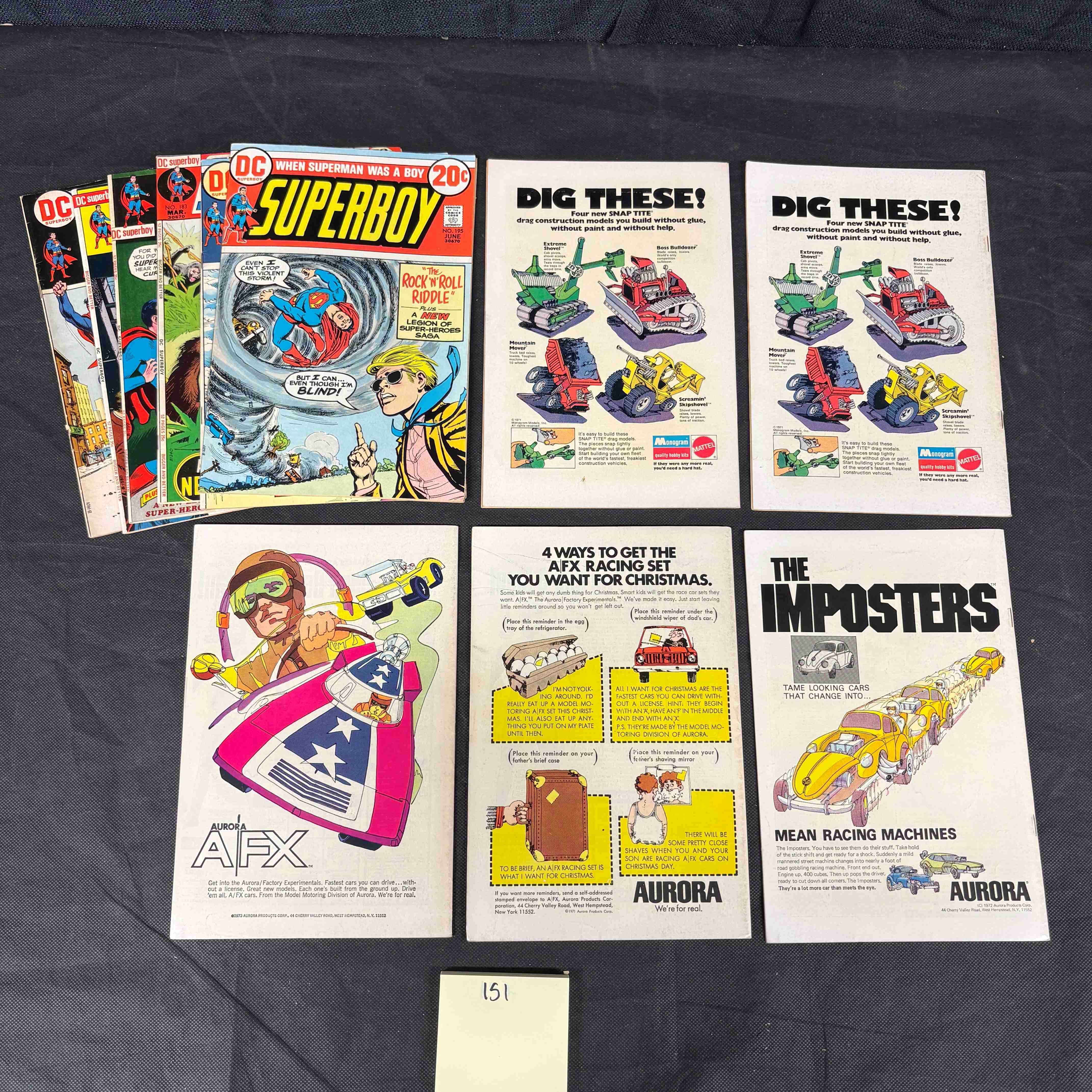 A group of 11 vintage DC Comics ‘Superboy’ comic books, dating from the Bronze Age of comics, specifically the early 1970s. The lot includes issues #201, #202, #203, #204, #205, #206, and one partially obscured issue, likely #193. Each comic is marked with a 20¢ price and features dynamic comic book artwork. Cover stories include “When Superman Was a Boy, ” “Rock’n’Roll Riddle, ” “The Runaway Superbaby, ” and several “Legion of Super-Heroes” narratives. The reverse sides prominently display full-page advertisements for Aurora brand model kits and AFX racing sets. A small white block marked “151” accompanies the lot, likely indicating an inventory or lot number.