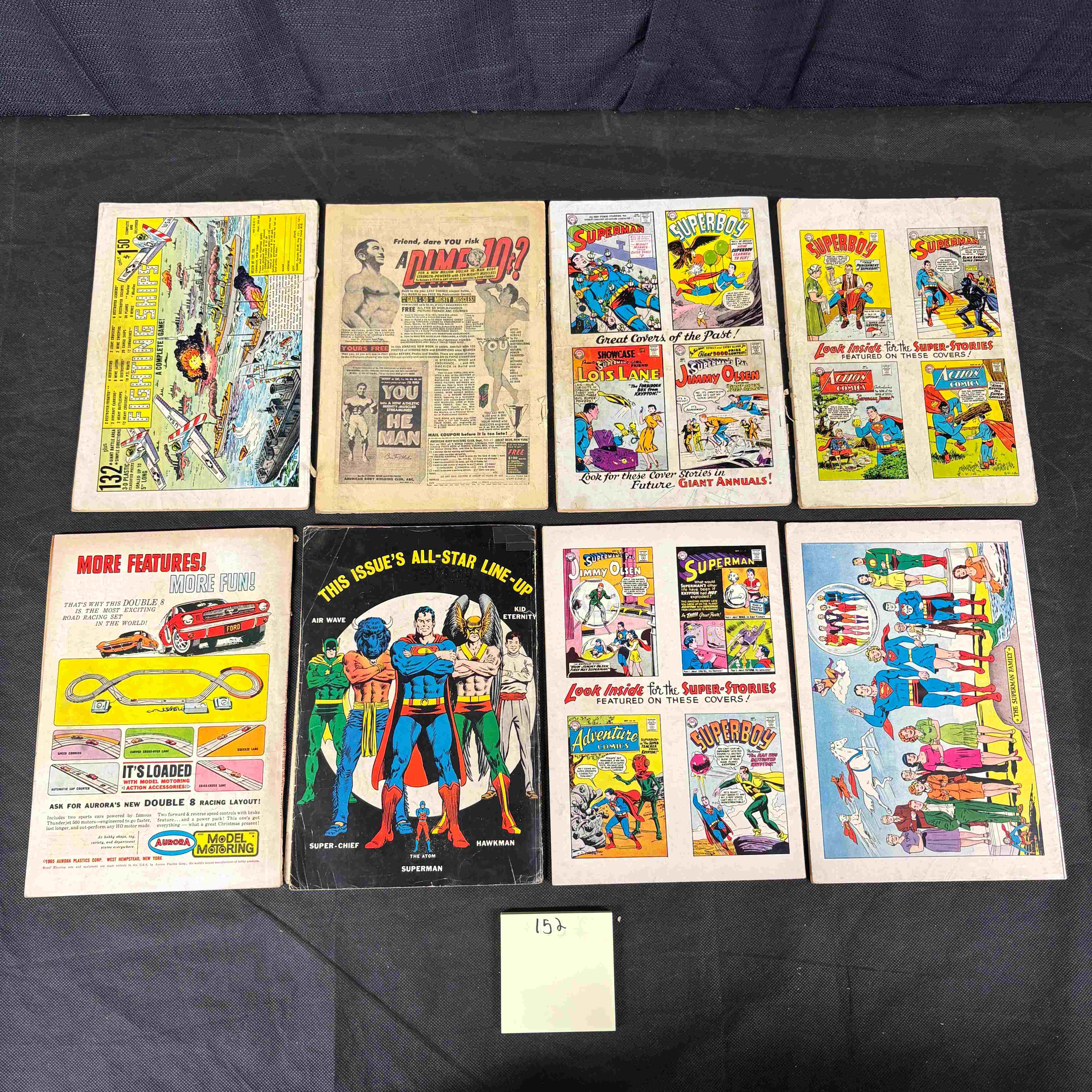 A collection of eight vintage American comic books, primarily from the “Superman Annual” and “Giant Superman” series, alongside one “DC 100 Page Super-Heroes” issue. These paper comics feature the colorful, dynamic superhero art style characteristic of the Silver Age. Cover prices of 25¢ and 80¢ indicate a publication period likely spanning the 1960s to early 1970s. Visible text on the covers highlights various storylines and characters such as Superman, Supergirl, and Jimmy Olsen, with titles including “The Superman Revenge Squad” and “Super-Anniversary Issue!”. The reverse sides and interior pages display period advertisements for toys such as Aurora Model Motoring and G.I. Joe, as well as cross-promotions for other DC Comics titles.