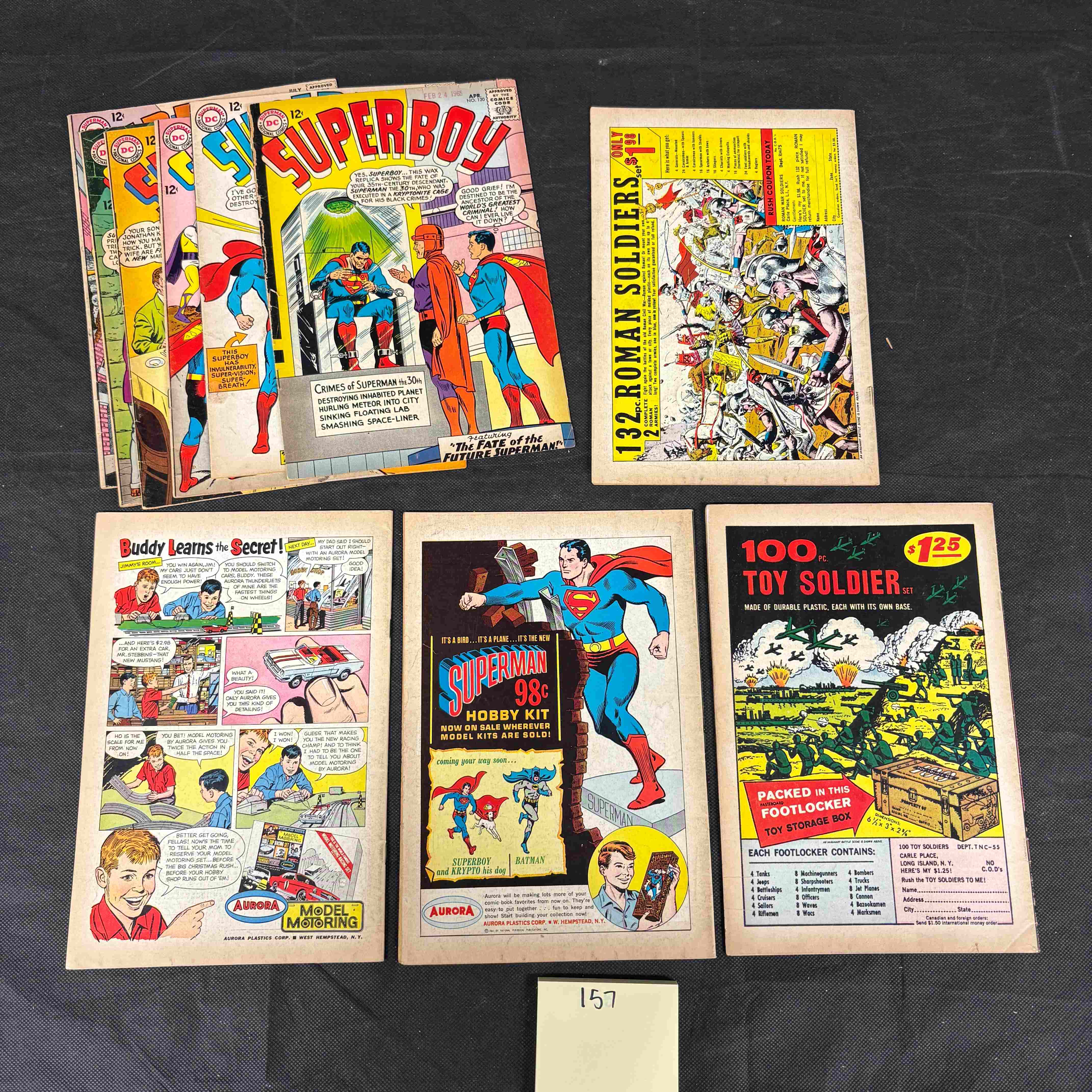 A group of six vintage American comic books from the Superboy (1949-1979 1st Series DC) run, published by DC Comics. Each comic features the prominent “SUPERBOY” title and a “12c” cover price, characteristic of the Silver Age period. They are made of printed paper and display classic mid-20th century superhero artwork, all bearing the “APPROVED BY THE COMICS CODE AUTHORITY” seal. Visible story titles across the collection include “The Atomic Superboy,” “The Fate of the Future Superman!”, “The War Between Superboy And Krypto!”, “SUPERBOY and his Five Fathers!”, and “The Wolf-Boy of Smallville!”. The reverse sides showcase contemporary advertisements for products such as “132 ROMAN SOLDIERS” and “100 Pc. TOY SOLDIERS” (made of durable plastic), “AURORA MODEL MOTORING” sets, and “SUPERMAN 98c HOBBY KIT” plastic model kits for Superman, Superboy, and Batman.