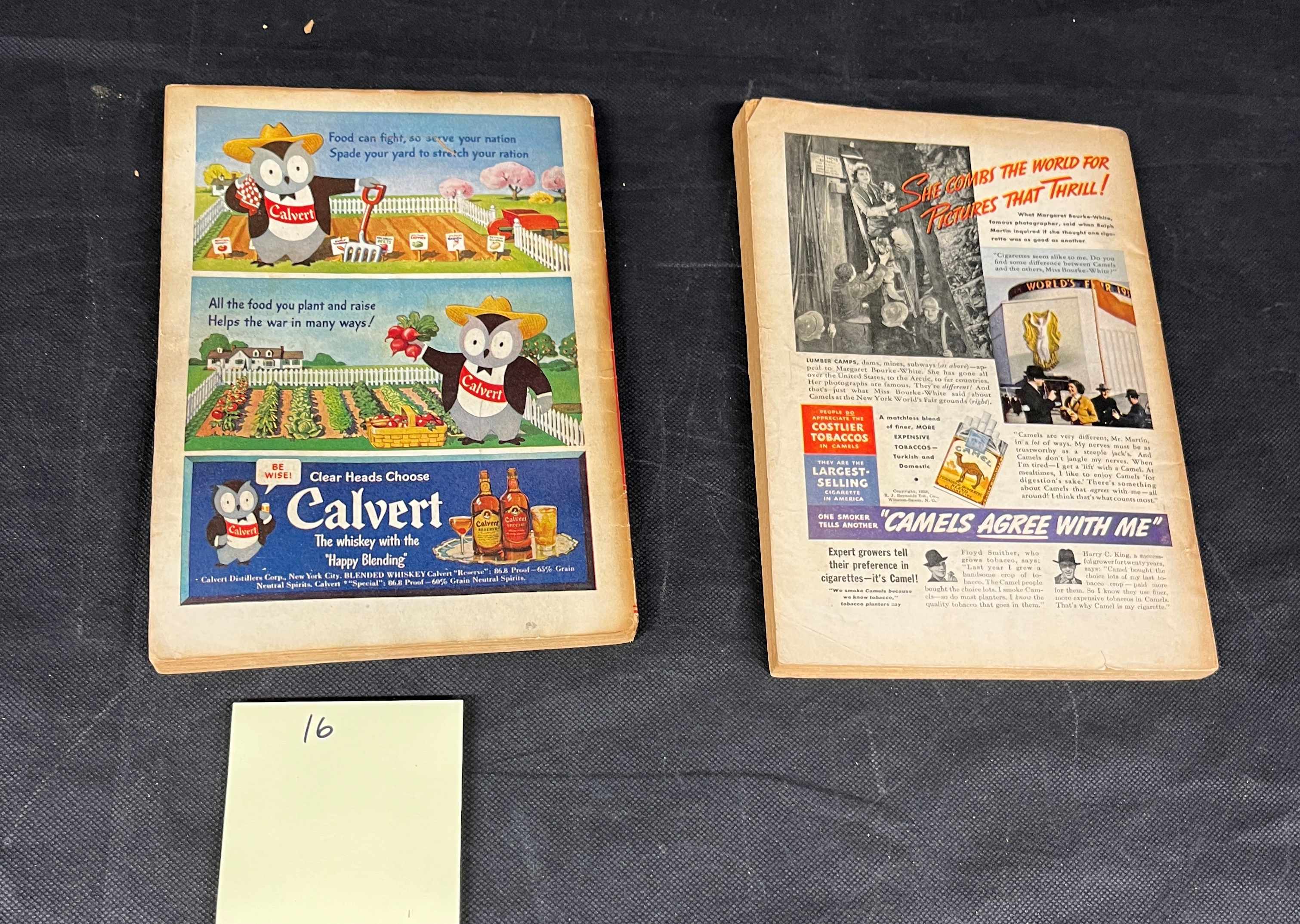Both paper-bound issues exhibit typical age-related wear including creasing, discoloration, and edge fraying. The June 1938 issue is in notably poorer condition with more significant spine and cover damage. The July 1943 issue shows general wear consistent with its age.