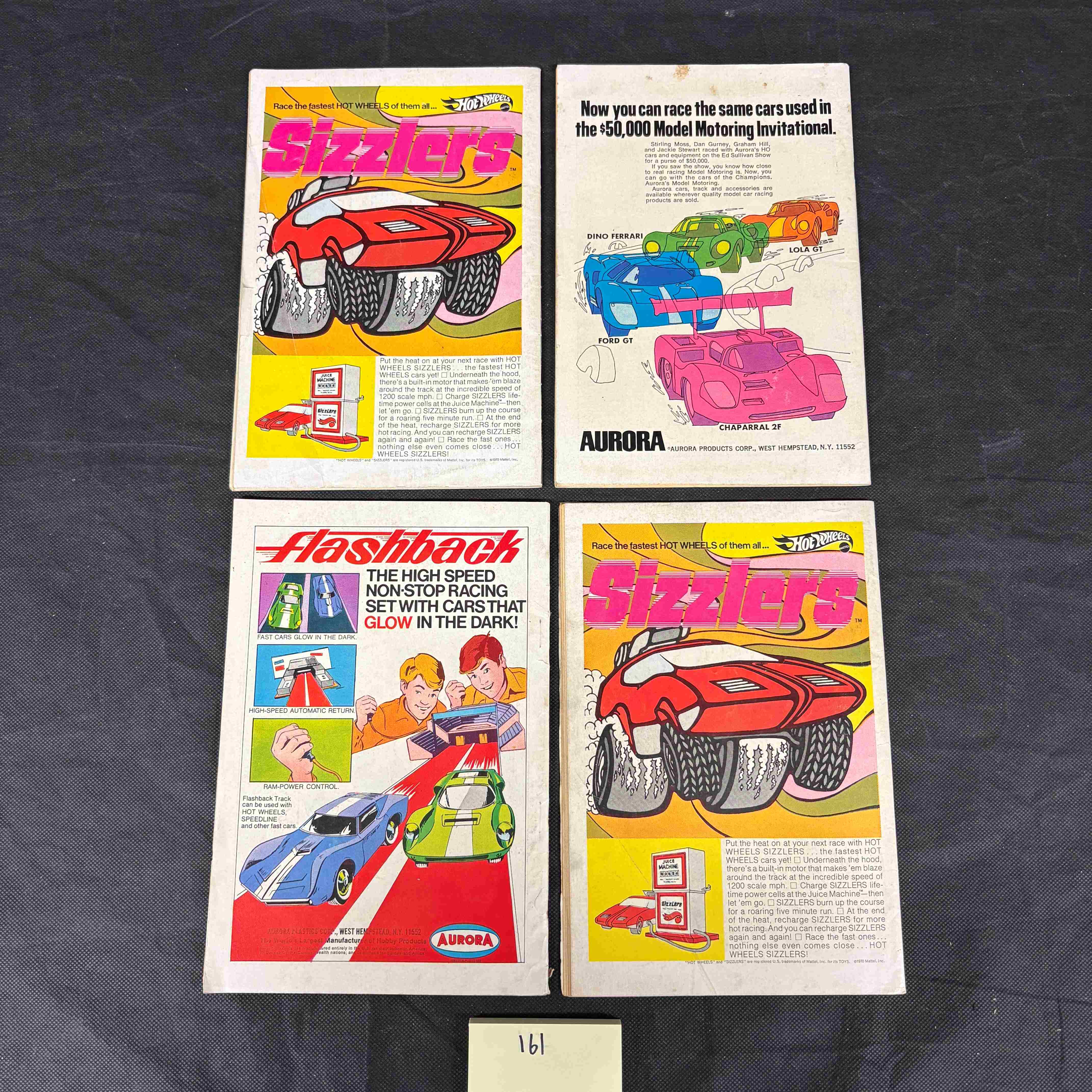 This lot comprises a group of four vintage American comic books. The group includes one issue of DC Special (1968) #4, May No. 4, titled “The Wild Frontier!”, which depicts a cowboy on a tiger-like creature. The remaining three issues are titled “Super Giant Top Guns of the West,” with two marked “OCT” and one “MAR,” featuring Western genre characters and storylines such as “Johnny Thunder,” “Red-Eye,” and “Black Star Gang.” All comics bear a 25-cent cover price, consistent with a late 1960s to early 1970s printing period. The reverse sides feature period advertisements for “Aurora” brand model racing sets, including “Hot Wheels Sizzlers” and a “Flashback” glow-in-the-dark set. A small paper tag with the handwritten number “161” is visible beneath the items.