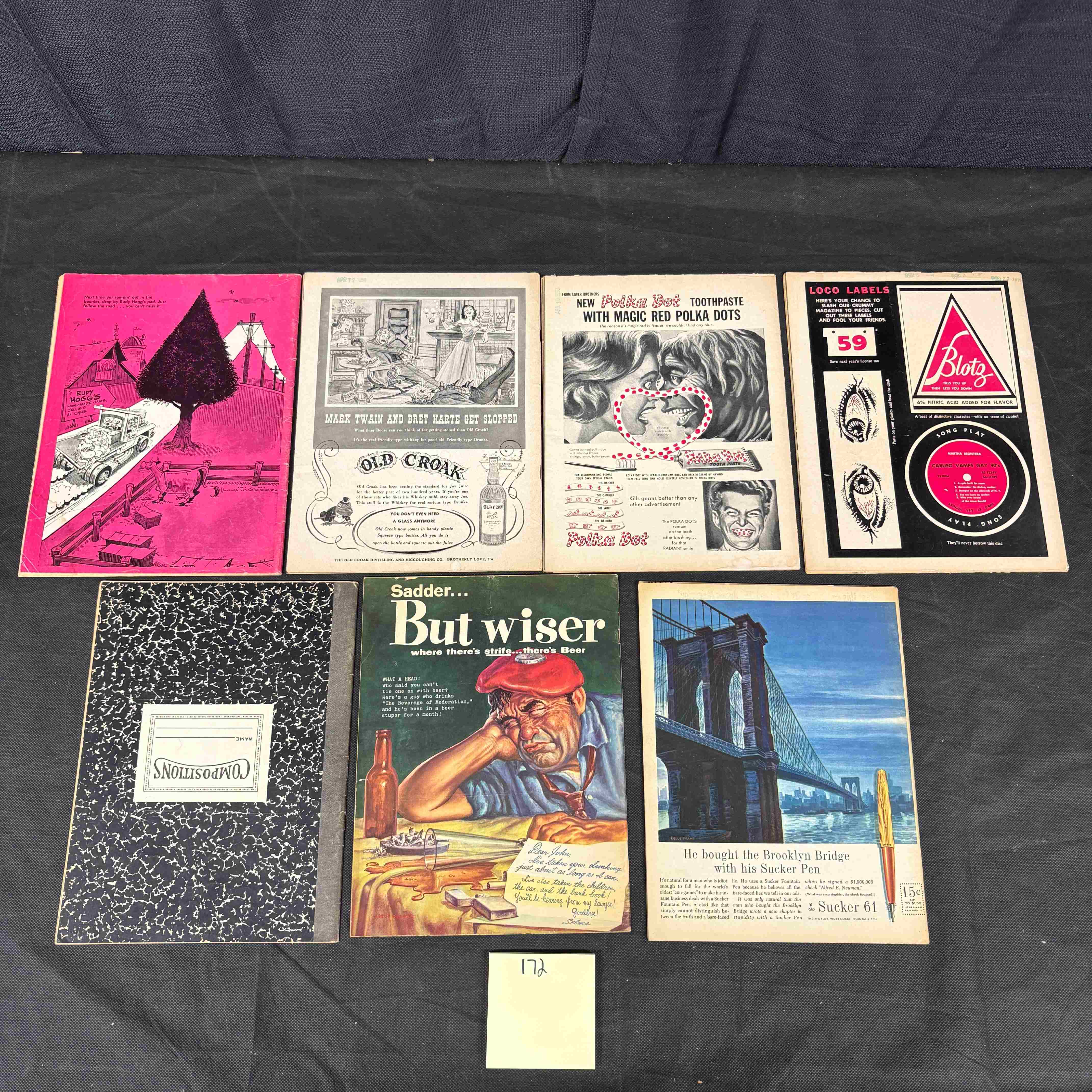 A group of vintage American satirical and humor magazines, primarily featuring multiple issues of *MAD Magazine*, dating from the mid-20th century, circa 1950s-1960s. The lot includes eight magazines with titles such as “CAR TOONS,” “FRENZY,” “Cracked,” and “LOCO,” alongside several issues of “MAD” magazine. Visible cover details include a “25c” price point on some issues, and specific themes such as “SPECIAL JACKPOT ISSUE” and “SPECIAL APRIL SHOWERS ISSUE” for *MAD*. Other notable cover text includes “SPECIAL ISSUE, WRITTEN BY 10 CHIMPANZEES” on “CAR TOONS” and “FIGHT SANITY, THREE WAYS” on “FRENZY.” Accompanying the magazines are five assorted vintage paper items, comprising a black-and-white speckled composition notebook and four miscellaneous magazine pages or advertisements. These additional paper items feature period illustrations and text, advertising products like “OLD CROAK” and “Podker Dot Toothpaste,” or showcasing humorous content such as “Sadder… But wiser where there’s girls… there’s liquor” and “LOCO LABELS” alongside an image of the Brooklyn Bridge and the text “He bought the Brooklyn Bridge with his Sucker Pen.” All items are made of paper.