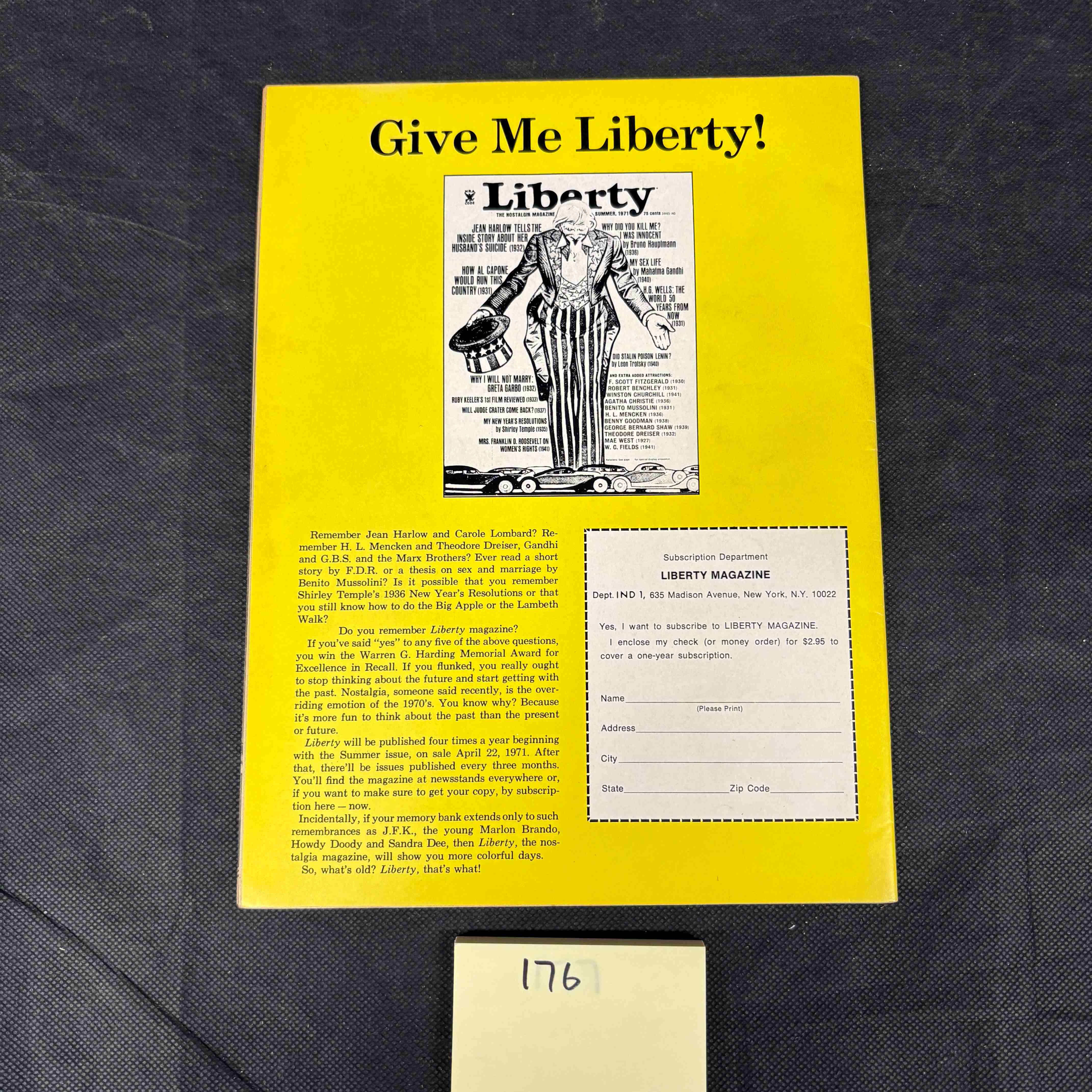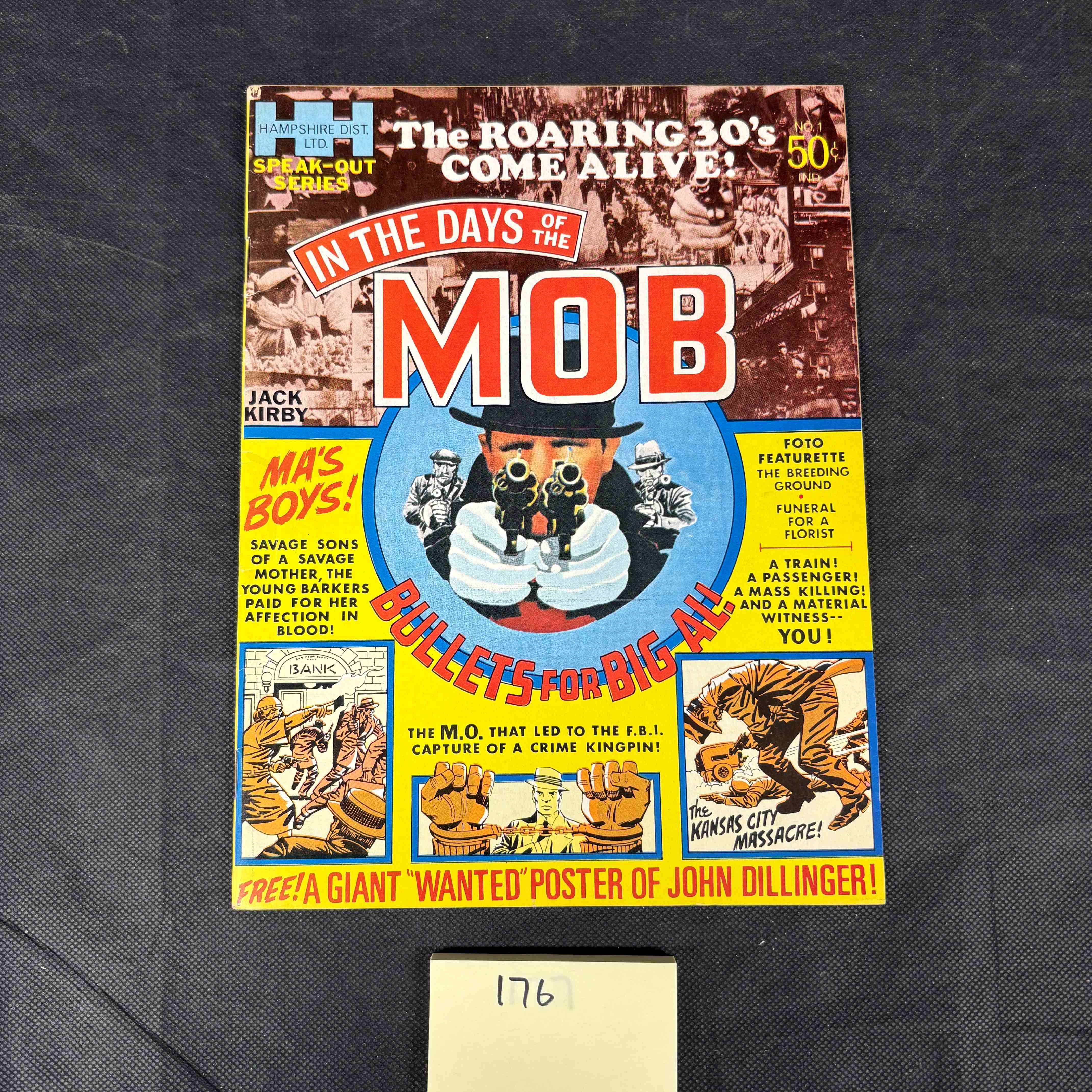 A 1971 issue of Harvey Comics’ ‘In The Days Of The Mob’ #1, featuring artwork and story contributions by Jack Kirby. The front cover, titled ‘The ROARING 30’s COME ALIVE!’, depicts a central figure in a fedora aiming two pistols, surrounded by vignettes of mobsters, bank robberies, and a tiger-like creature, rendered in bold primary colors. Key textual elements include ‘HAMPSHIRE DIST. LTD.’, ’50 CENTS’, and references to ‘MA’S BOYS!’, ‘BULLETS FOR BIG-AL’, ‘THE KANSAS CITY MASSACRE!’, and ‘JOHN DILLINGER’. The reverse side features an advertisement for ‘Liberty Magazine’ with a subscription offer, listing ‘635 Madison Avenue, New York, N.Y. 10022’ as the address. An external white label with the number ‘176’ is visible at the bottom of the item.