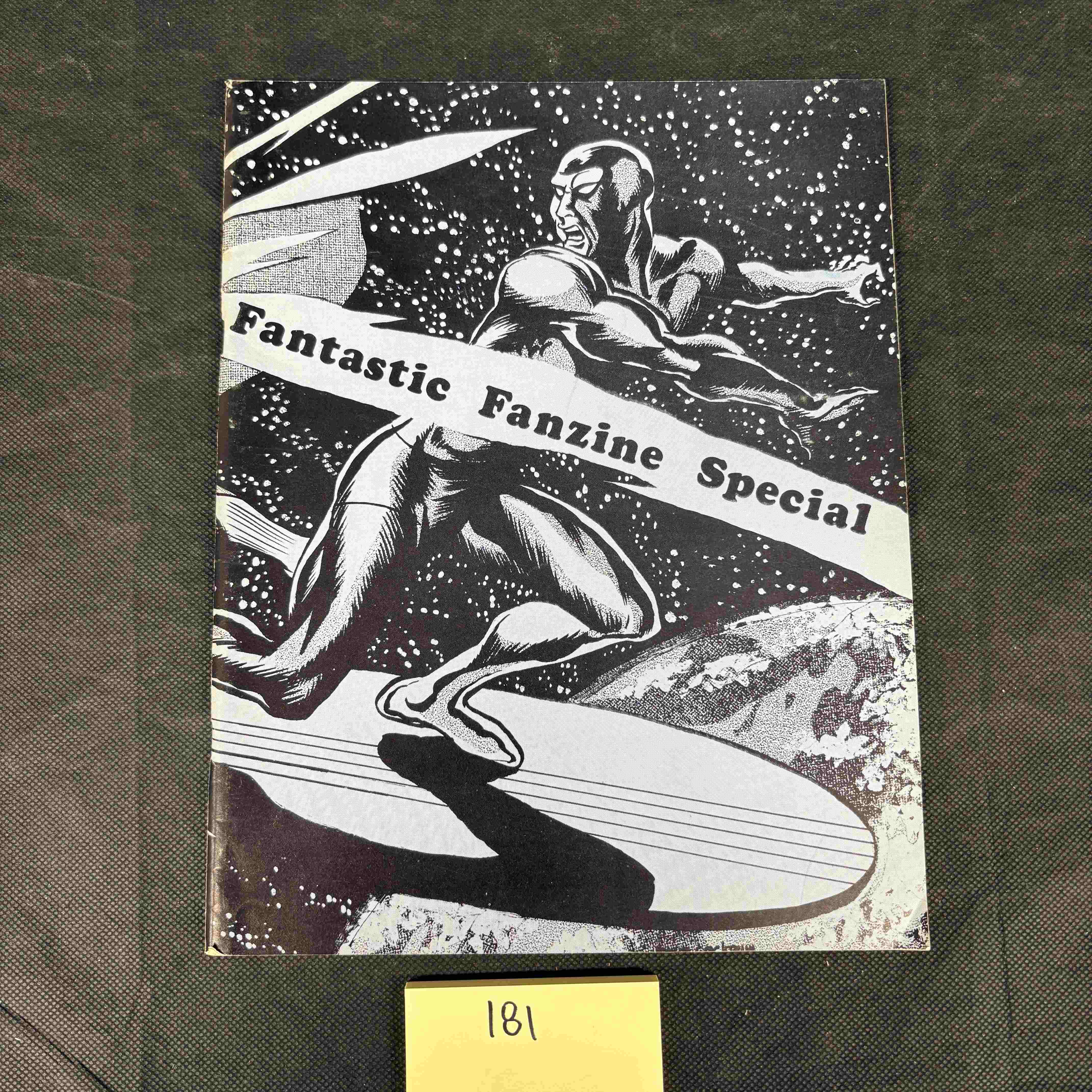 A copy of Fantastic Fanzine Special Volume 1, #2, published in February 1972, featuring the Silver Surfer. This black and white paper fanzine features comic book style illustrations of a superhero resembling the Silver Surfer against a starry cosmic background on the front cover. The front cover prominently displays the text ‘Fantastic Fanzine Special’ in a diagonal banner. The back cover continues the cosmic theme with a similar character engaged in an action pose. The fanzine contains 82 pages.