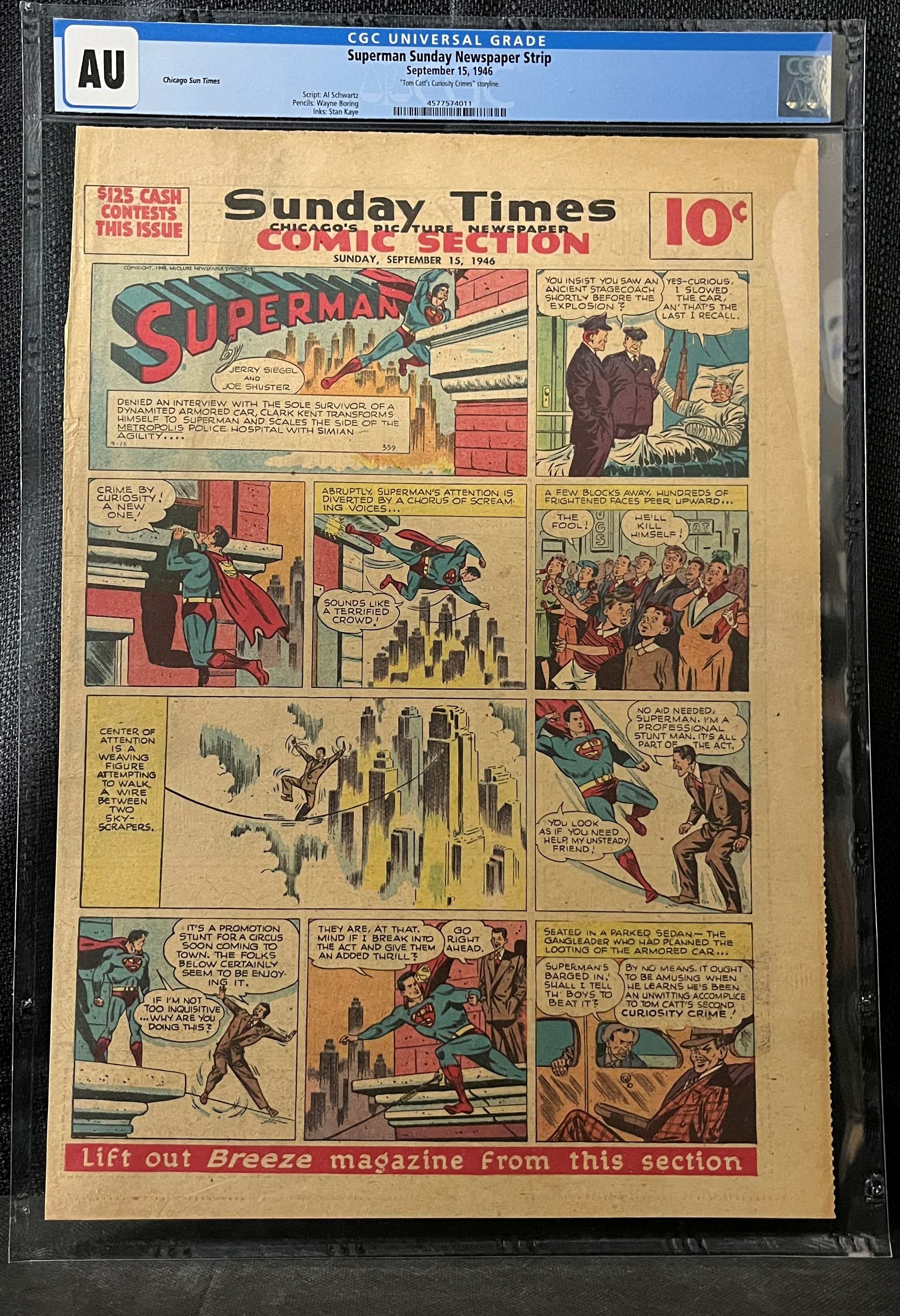 A vintage American Superman Sunday Newspaper Strip from the “Chicago Sun Times” “Sunday Times Comic Section,” dated September 15, 1946. This Golden Age comic strip is encapsulated in a professional CGC Universal Grade slab marked “AU.” The strip features the story “Tom Catt’s Curiosity Crimes,” with visible credits to Jerry Siegel, Joe Shuster, Al Schwartz, Wayne Boring, and Stan Kaye. Key markings include the original “10¢” price, an advertisement for “$125 CASH CONTESTS THIS ISSUE,” and the instruction “Lift out Breeze magazine from this section.”