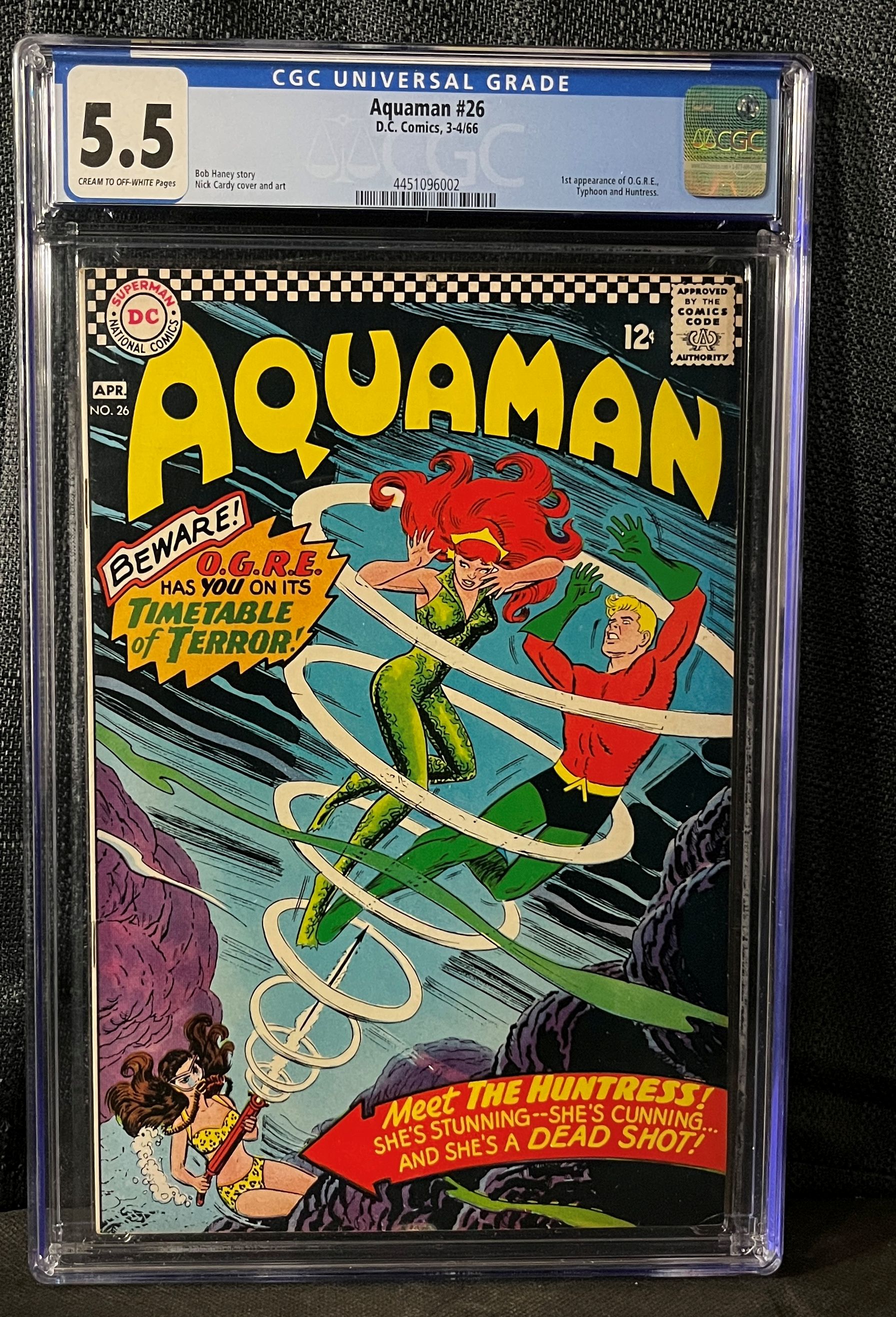A professionally graded Silver Age comic book, Aquaman #26 from D.C. Comics, dated March-April 1966, encapsulated in a CGC Universal Grade slab with a stated grade of 5.5 and “CREAM TO OFF-WHITE Pages”. The comic features the first appearance of O.G.R.E., Typhoon, and Huntress, with story by Bob Haney and cover and art by Nick Cardy. The paper cover displays colorful illustrations of Aquaman and Mera caught in swirling tendrils, alongside a third female character, Huntress, in a leopard-print bikini holding a speargun. Prominent text blurbs read “BEWARE! O.G.R.E. HAS YOU ON ITS TIMETABLE of TERROR!” and “Meet THE HUNTRESS! SHE’S STUNNING—SHE’S CUNNING… AND SHE’S A DEAD SHOT!”. Visible markings include the “DC NATIONAL COMICS” logo, “12¢” price, and the “APPROVED BY THE COMICS CODE AUTHORITY” seal.