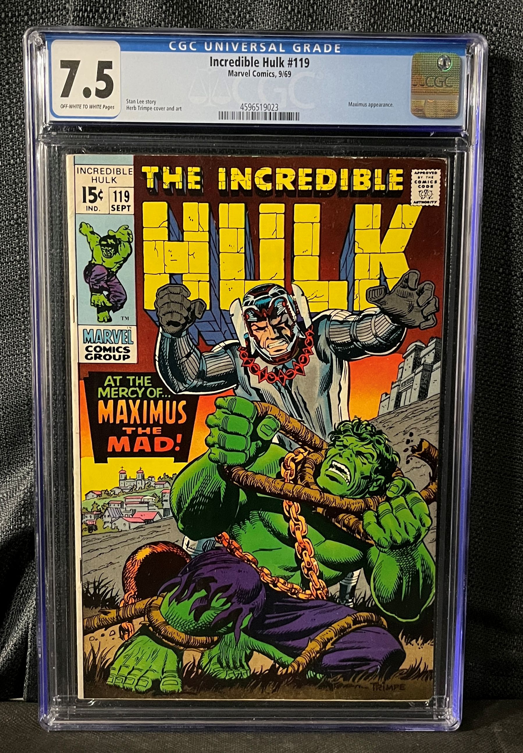 A copy of Marvel Comics’ ‘Incredible Hulk #119’, dated September 1969, with an original cover price of 15 cents. The comic features a Stan Lee story and cover art by Herb Trimpe, depicting the green-skinned Hulk restrained by chains and menaced by the masked figure of Maximus the Mad. This issue is professionally graded and encased in a clear protective plastic slab from CGC, designated with a ‘Universal Grade’ of 7.5 and noting ‘OFF-WHITE TO WHITE Pages’.