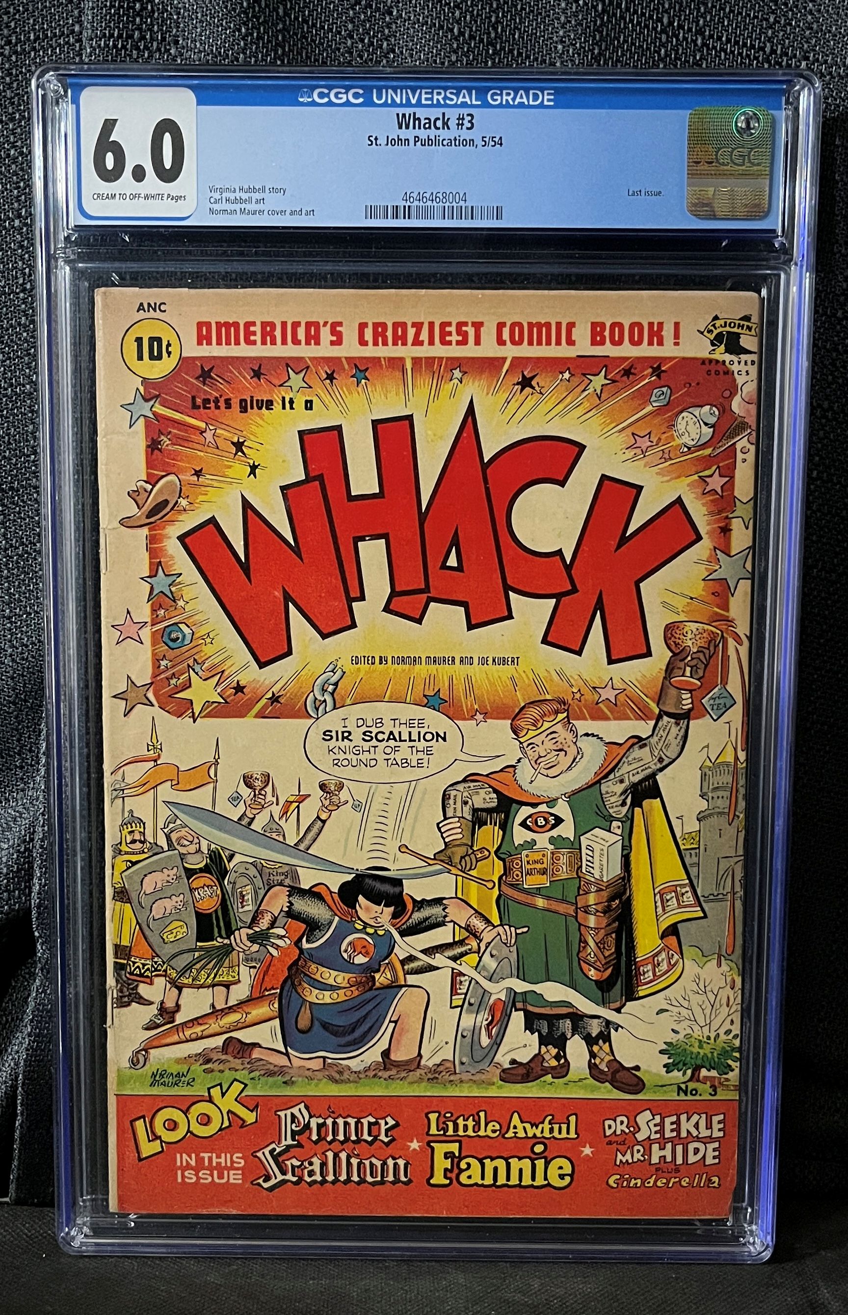 A vintage American comic book, “Whack #3,” published by St. John Publication in May 1954, noted as its “Last issue.” The item is professionally encapsulated and graded 6.0 by CGC Universal Grade, with “CREAM TO OFF-WHITE Pages.” The colorful, cartoonish cover depicts a medieval scene featuring a king-like figure knighting “Sir Scallion” amidst other knights, with the large, explosive title “WHACK.” Visible text on the cover includes a “10¢” price, “ANC” marking, “St. John Approved Comics” seal, and editor credits for Norman Maurer and Joe Kubert. Contents listed on the cover include “Prince Scallion,” “Little Awful Fannie,” “Dr. Seekle and Mr. Hyde,” and “Cinderella,” with story and art credits to Virginia Hubbell, Carl Hubbell, and Norman Maurer.