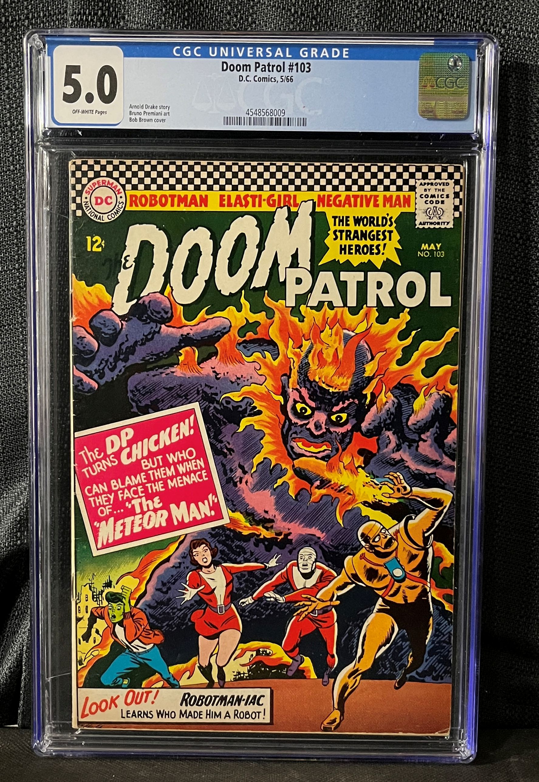 A D.C. Comics ‘Doom Patrol’ #103 comic book, published May 1966. This Silver Age issue is professionally graded and encapsulated by CGC with a Universal Grade of 5.0, noting OFF-WHITE Pages. The colorful cover art by Bob Brown depicts the Doom Patrol (Robotman, Elasti-Girl, and Negative Man) reacting with alarm to the menacing, fiery purple monster referred to as ‘The Meteor Man!’. The story is credited to Arnold Drake, with interior art by Bruno Premiani. Additional visible markings include “NATIONAL COMICS,” “DC,” “12¢,” “THE WORLD’S STRANGEST HEROES!”, and the “APPROVED BY THE COMICS CODE AUTHORITY” seal.