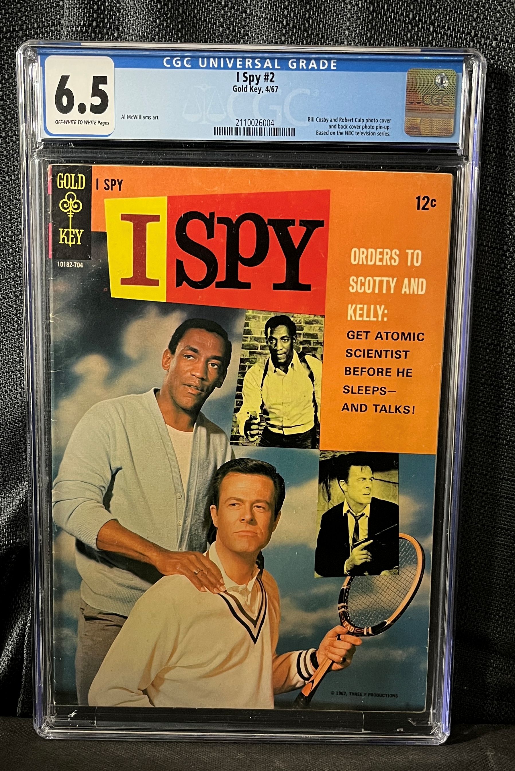 A professionally graded and encapsulated American comic book, ‘I Spy #2,’ published by Gold Key in April 1967. The cover features a photo-realistic style with images of actors Bill Cosby and Robert Culp, directly referencing its origin as “Based on the NBC television series.” Key visible markings include the large “I SPY” title and a “12c” price. The tagline reads “ORDERS TO SCOTTY AND KELLY: GET ATOMIC SCIENTIST BEFORE HE SLEEPS—AND TALKS!” The comic is preserved within a transparent CGC Universal Grade slab, which attributes “Al McWilliams art” and notes “OFF-WHITE TO WHITE Pages.” All visible text is in English.