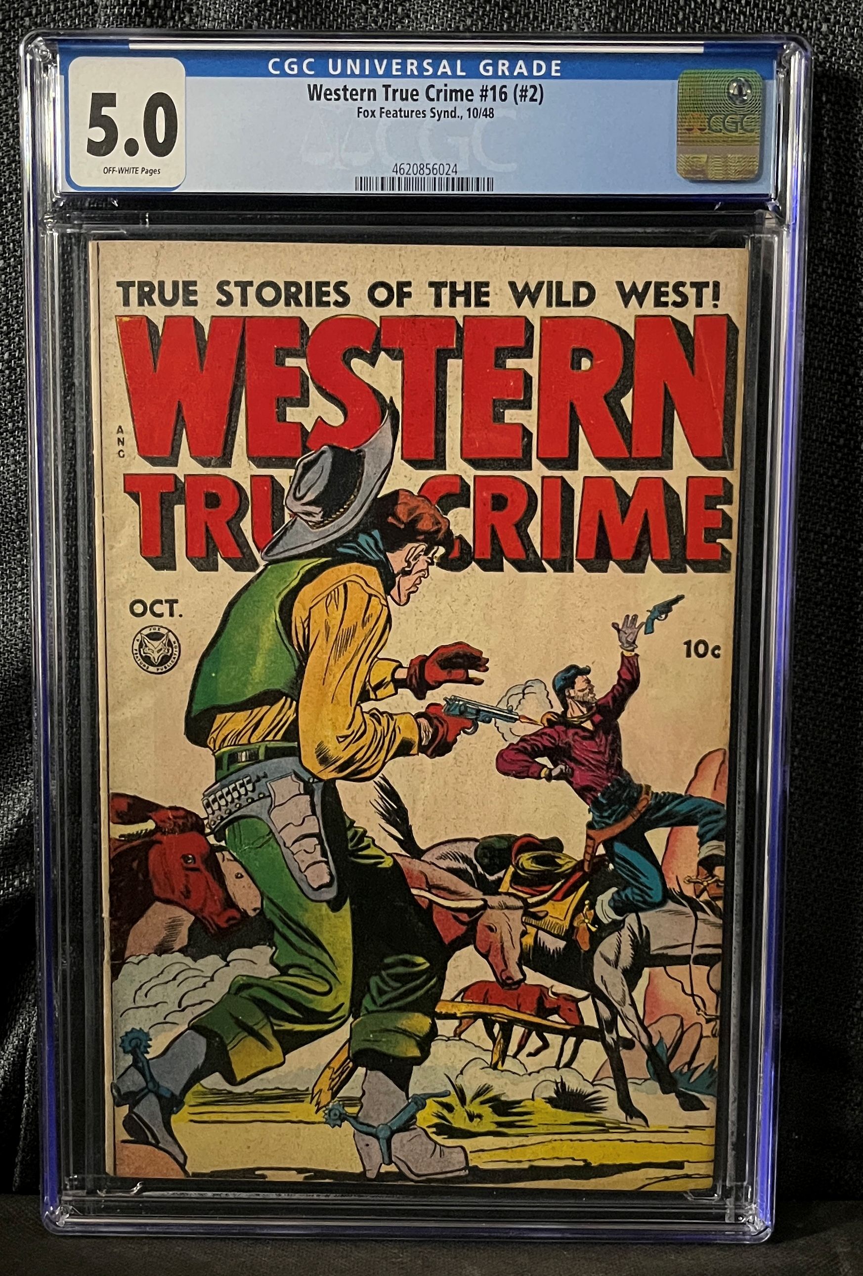 A Golden Age comic book, “Western True Crime #16 (#2),” published by Fox Features Syndicate in October 1948. The comic is professionally graded by CGC with a Universal Grade of 5.0 and features “OFF-WHITE Pages.” The cover, titled “TRUE STORIES OF THE WILD WEST!”, depicts a dynamic scene of two cowboys engaged in a shootout, one on horseback, with cattle visible in the background. The original cover price is 10 cents. The comic is encapsulated in a rigid plastic slab, authenticated with a CGC hologram and serial number 4620856024.