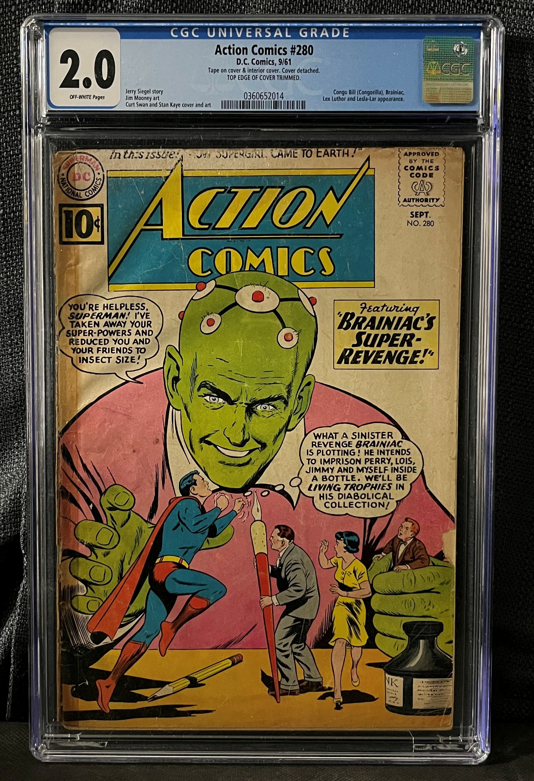 An original copy of Action Comics #280 from D.C. Comics, dated September 1961, presented in a CGC Universal Grade slab. The comic is graded 2.0 with OFF-WHITE Pages. The cover, by Curt Swan and Stan Kaye, depicts Superman battling a giant Brainiac, who threatens to reduce Superman and his friends (Perry, Lois, Jimmy) to insect size and imprison them. The cover displays an “APPROVED BY THE COMICS CODE AUTHORITY” stamp and an original price of “10¢.”