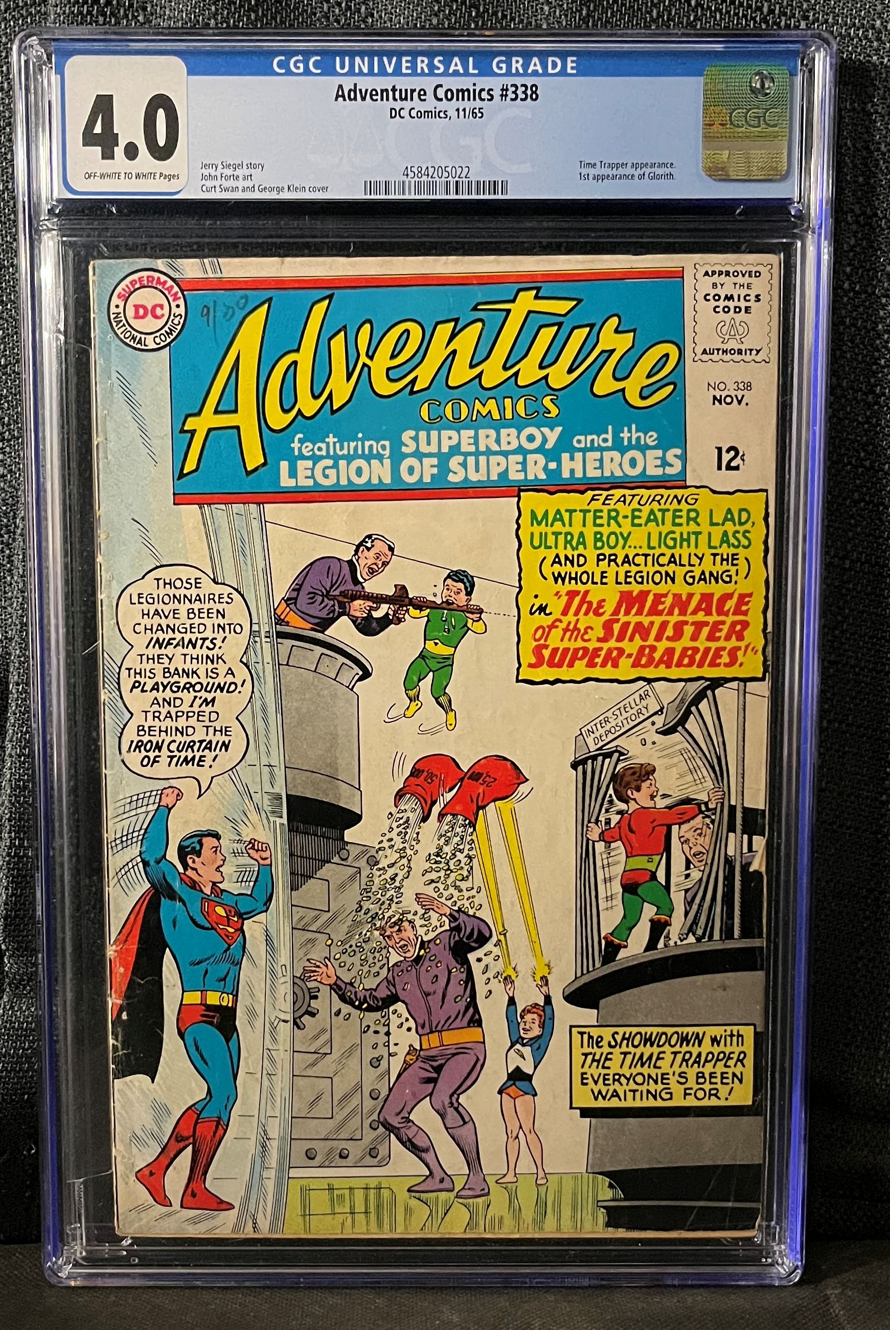 Adventure Comics #338, published by DC Comics in November 1965. This comic book is professionally encapsulated and graded CGC Universal Grade 4.0 with Off-White to White pages. The full-color cover features Superboy and the Legion of Super-Heroes battling characters including the prominent villain “The Time Trapper” and mentions “The Menace of the Sinister Super-Babies!”, featuring Matter-Eater Lad, Ultra Boy, and Light Lass. The CGC label further notes Jerry Siegel as the story writer, John Forte as the artist, and Curt Swan and George Klein for the cover. Key appearances noted include the Time Trapper and the first appearance of Glorith. Visible cover markings include a 12-cent price, the Comics Code Authority seal, a “Superman DC National Comics” logo, and a faint handwritten “9/50” near the logo.