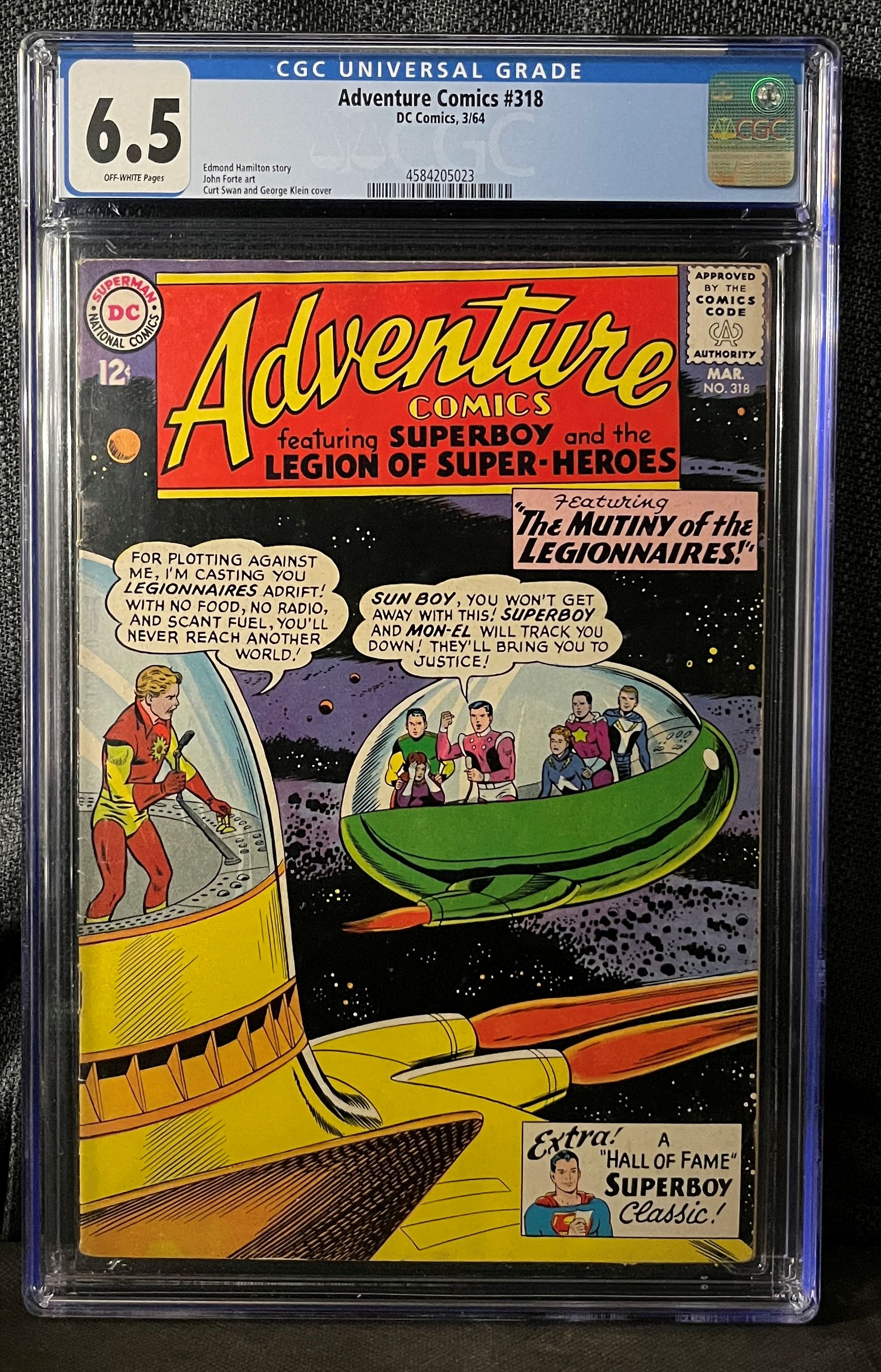 Adventure Comics #318, published by DC Comics in March 1964. This Silver Age comic book is encapsulated by CGC Universal Grade at 6.5 with OFF-WHITE Pages, bearing the serial number 4584205023. The cover, attributed to Curt Swan and George Klein, features Superboy and the Legion of Super-Heroes in a cosmic setting, depicting characters in two separate futuristic spacecraft, surrounded by stars and planets. Visible text includes the main title, “Adventure Comics featuring SUPERBOY and the LEGION OF SUPER-HEROES,” a subtitle “Featuring ‘The Mutiny of the Legionnaires!’,” and a “Superman DC National Comics 12¢” logo. An “Approved by the Comics Code Authority” stamp is present. The cover also includes two speech bubbles: “FOR PLOTTING AGAINST ME, I’M CASTING YOU LEGIONNAIRES ADRIFT! WITH NO FOOD, NO RADIO, AND SCANT FUEL, YOU’LL NEVER REACH ANOTHER WORLD!” and “SUN BOY, YOU WON’T GET AWAY WITH THIS! SUPERBOY AND MON-EL WILL TRACK YOU DOWN! THEY’LL BRING YOU TO JUSTICE!”. The bottom right corner features a small box stating “Extra! A ‘HALL OF FAME’ SUPERBOY Classic!”.