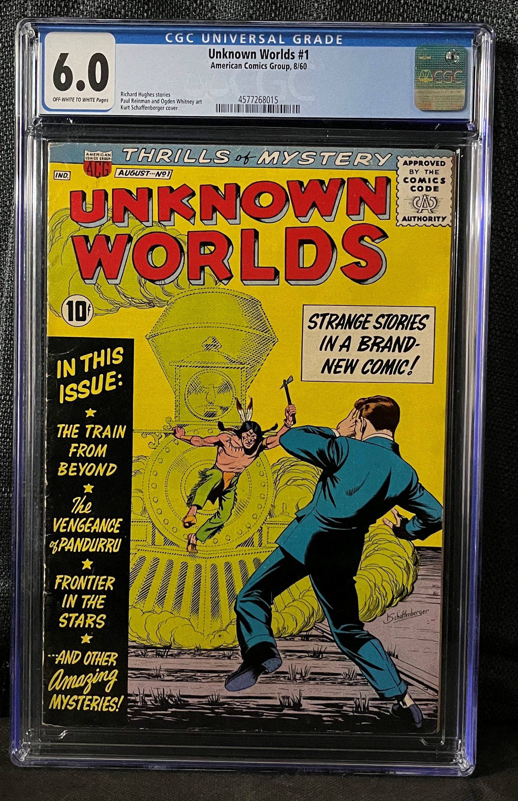 A professionally graded comic book, “Unknown Worlds #1,” published by American Comics Group (ACG) in August 1960, securely encased within a clear CGC Universal Grade protective slab. The cover, rendered in an early Silver Age style and attributed to Kurt Schaffenberger, visually presents a dramatic encounter where a man in a suit recoils from a Native American figure armed with a tomahawk, seemingly leaping from a stylized train engine. Visible markings on the comic cover include “10¢” for pricing and the “APPROVED BY THE COMICS CODE AUTHORITY” stamp. Story titles featured in this issue include “THE TRAIN FROM BEYOND,” “The VENGEANCE of PANDURRU,” “Frontier in the Stars,” and “Other Amazing Mysteries!” The CGC label specifies a grade of 6.0 with “OFF-WHITE TO WHITE Pages,” credits Richard Hughes for stories, Paul Reinman and Ogden Whitney for art, and bears the unique serial number 4577268015.