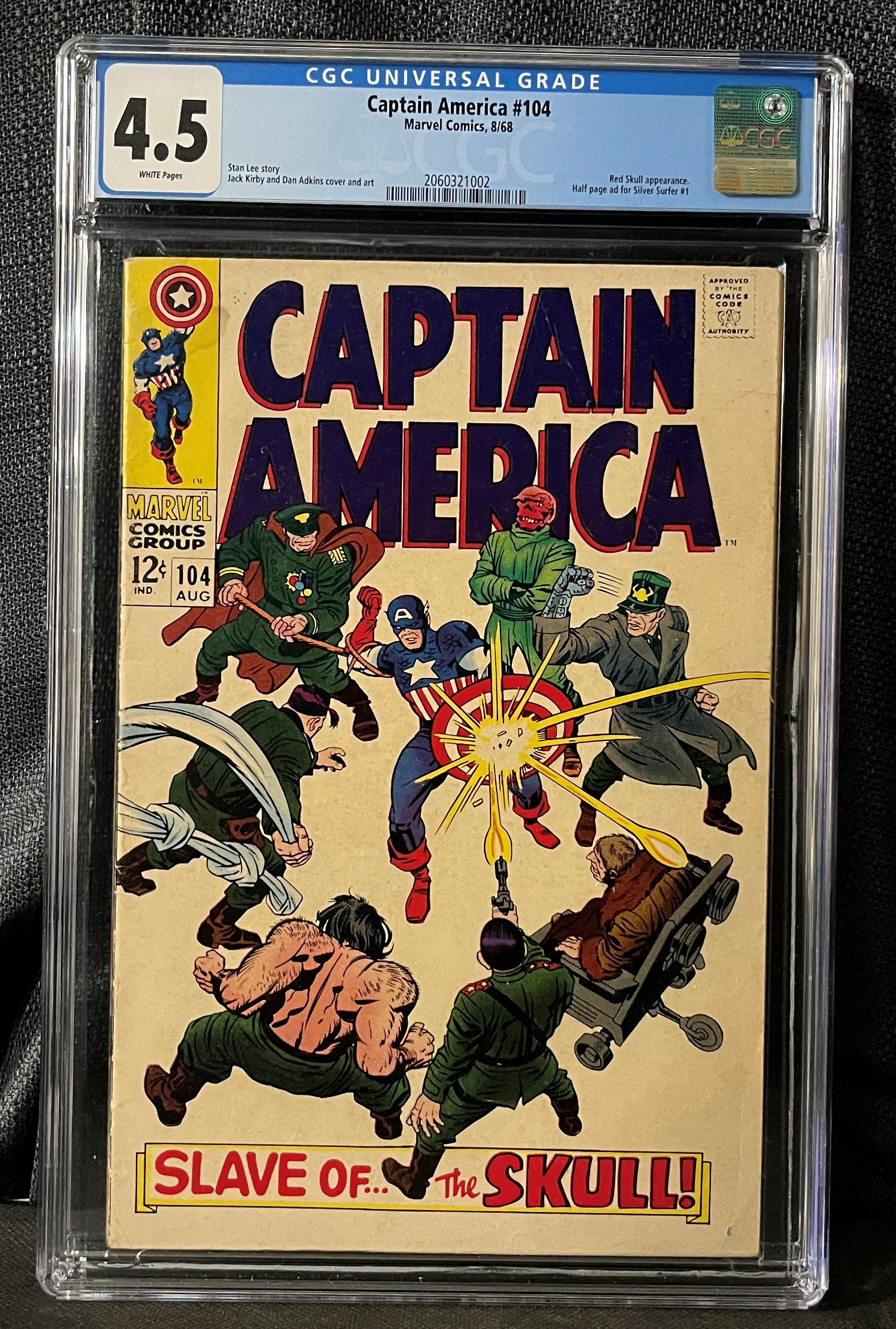 This item is a professionally encapsulated and graded Silver Age American comic book, Marvel Comics’ *Captain America* #104, dated August 1968. It has been assigned a CGC Universal Grade of 4.5 with WHITE Pages. The story is credited to Stan Lee, with cover and interior art by Jack Kirby and Dan Adkins. Key features noted on the CGC label include a Red Skull appearance and a half-page advertisement for *Silver Surfer* #1. The colorful cover art, typical of the period, dramatically depicts Captain America in battle against the Red Skull and several henchmen, with the prominent title “CAPTAIN AMERICA” and a tagline “SLAVE OF… The SKULL!”. The comic is preserved within a clear, rigid plastic slab.