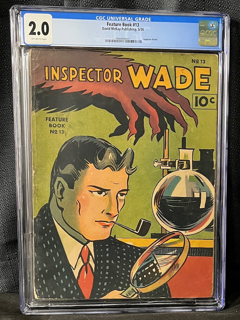 An encapsulated Golden Age comic book, “Feature Book #13,” featuring the character “Inspector Wade,” published by David McKay Publishing in May 1938. The comic is professionally graded by CGC Universal Grade at 2.0 with “Off-White Pages.” The cover displays a distinct pulp art style, depicting the titular character with a pipe and magnifying glass observing a laboratory flask, while a large, red, clawed hand looms above him. The cover also notes “No 13” and “10 C” for its original price.