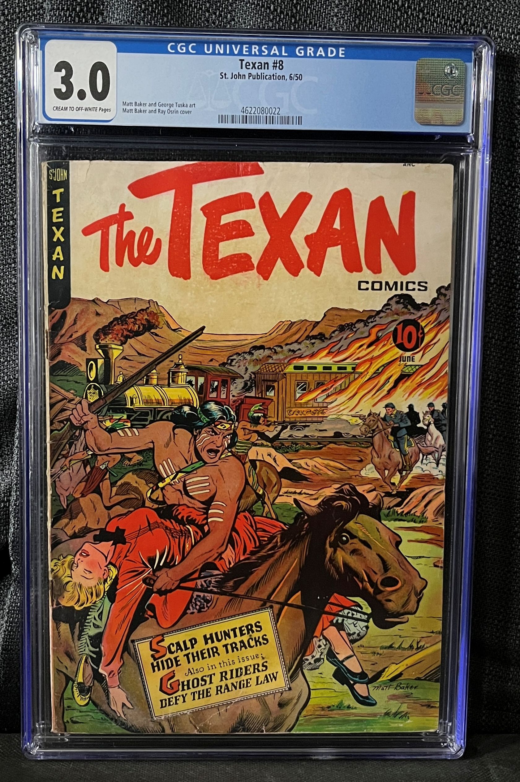 A professionally graded and encapsulated copy of Texan #8, published by St. John Publication in June 1950. Certified by CGC with a Universal Grade of 3.0 and noted as having Cream to Off-White Pages. Featuring art by Matt Baker and George Tuska, with the dynamic cover illustration attributed to Matt Baker and Ray Osrin. The Western-themed cover depicts a Native American figure on horseback holding a captive woman, set against a backdrop of a burning train and building, with soldiers on horseback in pursuit. Visible cover text includes “The Texan Comics,” “10¢” price, “JUNE,” and issue headlines: “Scalp Hunters Hide Their Tracks” and “Also in this issue: Ghost Riders Defy The Range Law.” The spine also reads “St. John Texan.”