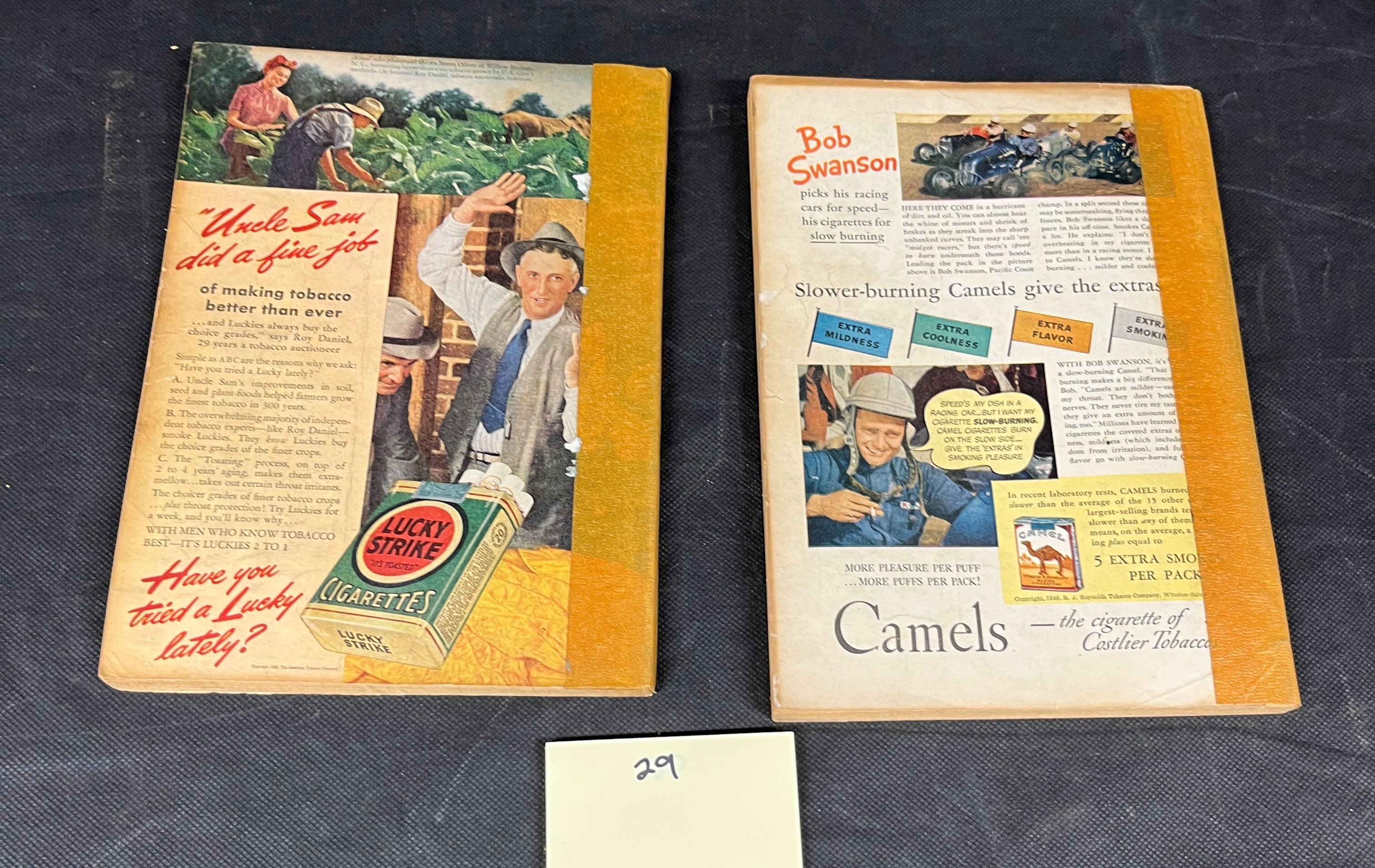 This lot comprises two vintage American pulp magazines from “Street & Smith’s Unknown Fantasy Fiction” series, printed on paper. The May 1940 issue features a colorful cover depicting a blue dragon, a fiery figure, and a small boat, advertising “THE ROARING TRUMPET” by L. Sprague de Camp and Fletcher Pratt. The June 1940 issue, with cover art signed “EDO. CARTIER,” portrays a robed figure with a yellow, elongated face surrounded by disembodied heads, highlighting the story “But without HORNS” by Norvell W. Page. Both issues were originally priced at 20 cents. Their reverse sides display full-page cigarette advertisements: Lucky Strike for the May issue, and Camel for the June issue, the latter featuring “Bob Swanson picks his racing cars for speed – his cigarettes for slow-burning.”