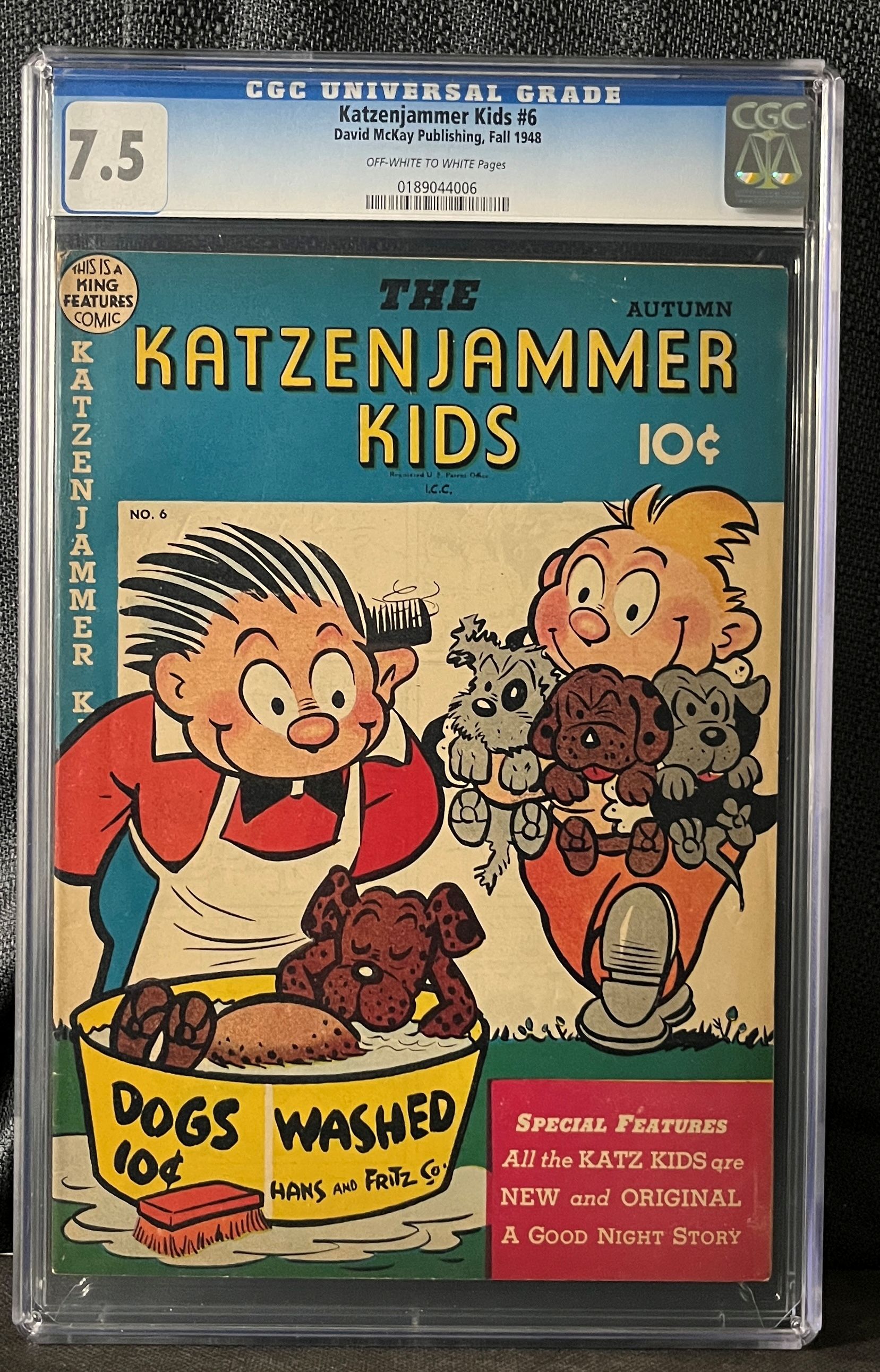 A professionally graded and encapsulated comic book, “Katzenjammer Kids #6” from David McKay Publishing, dated Fall 1948. The comic is certified by CGC Universal Grade at 7.5 with “OFF-WHITE TO WHITE Pages.” The cover features a classic mid-20th century cartoon illustration depicting two boys, identified as “Hans and Fritz Co.” on a sign, washing dogs for 10¢, while another boy holds several puppies. Prominent text includes “THE KATZENJAMMER KIDS,” “AUTUMN,” “10¢,” and “NO. 6.” Additional markings indicate “THIS IS A KING FEATURES COMIC” and “SPECIAL FEATURES / All the KATZ KIDS are / NEW and ORIGINAL / A Good Night Story.” The German word “Katzenjammer” in the title translates to “cat’s wail,” often used to describe a hangover or commotion, providing context for the comic’s mischievous characters.
