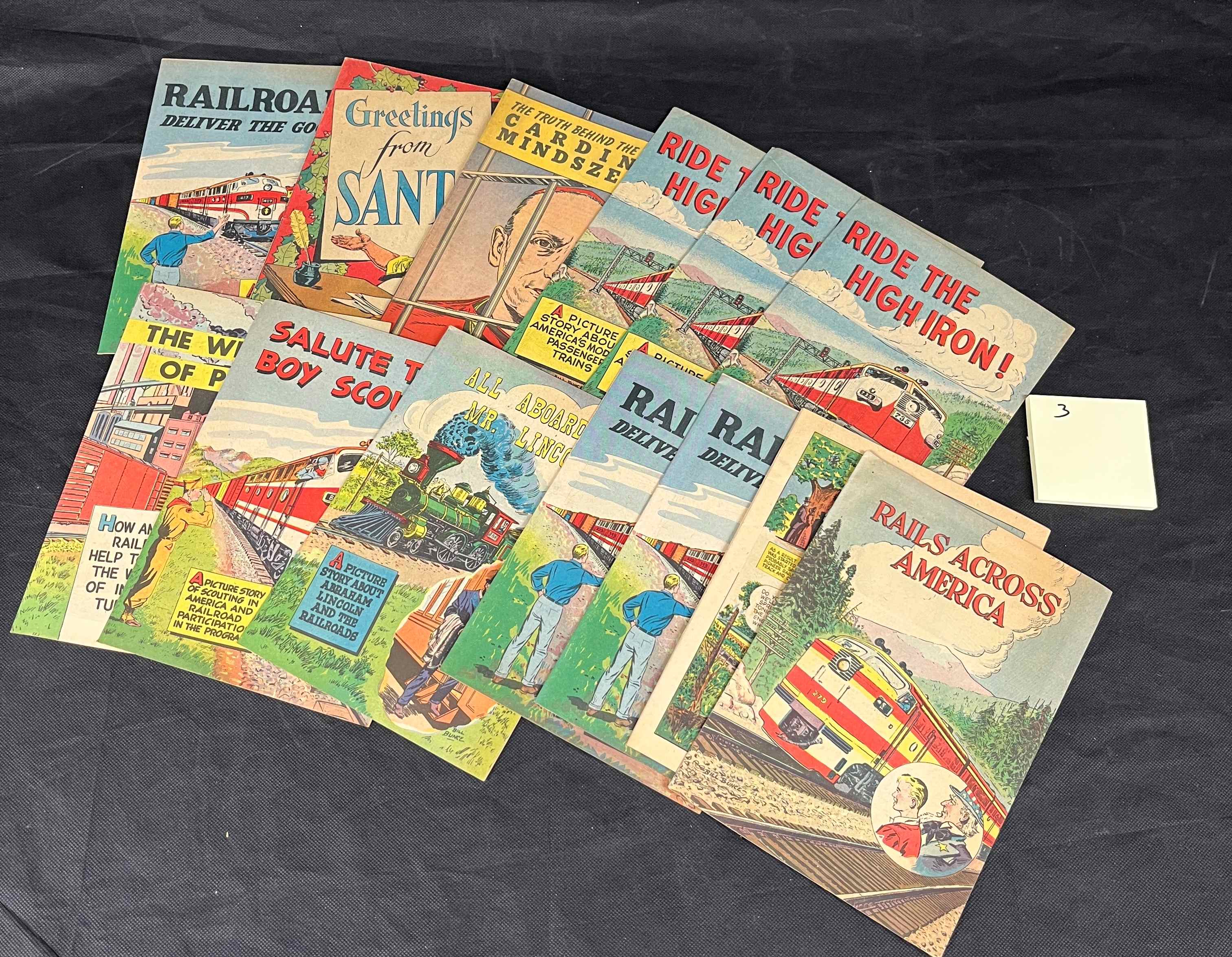 A collection of approximately fifteen vintage paper booklets or comic-style publications, primarily issued by the Association of American Railroads. These promotional comic books feature vibrant, colorful illustrations and predominantly railroad themes, dating from the mid-20th century, likely 1940s-1960s. Several covers bear the printed signature “BILL BUNCE.” Titles include “RAILROAD: DELIVER THE GOODS,” “Greetings from Santa,” “THE TRUTH BEHIND THE CARDINAL MINDSZENTY,” “RIDE THE HIGH IRON!”, “SALUTE TO BOY SCOUTS,” “ALL ABOARD MR. LINCOLN,” and “RAILS ACROSS AMERICA.” Additional legible text refers to “A PICTURE STORY ABOUT AMERICA’S MODERN PASSENGER TRAINS” and “A PICTURE STORY ABOUT ABRAHAM LINCOLN AND THE RAILROADS.” The items are constructed from paper.