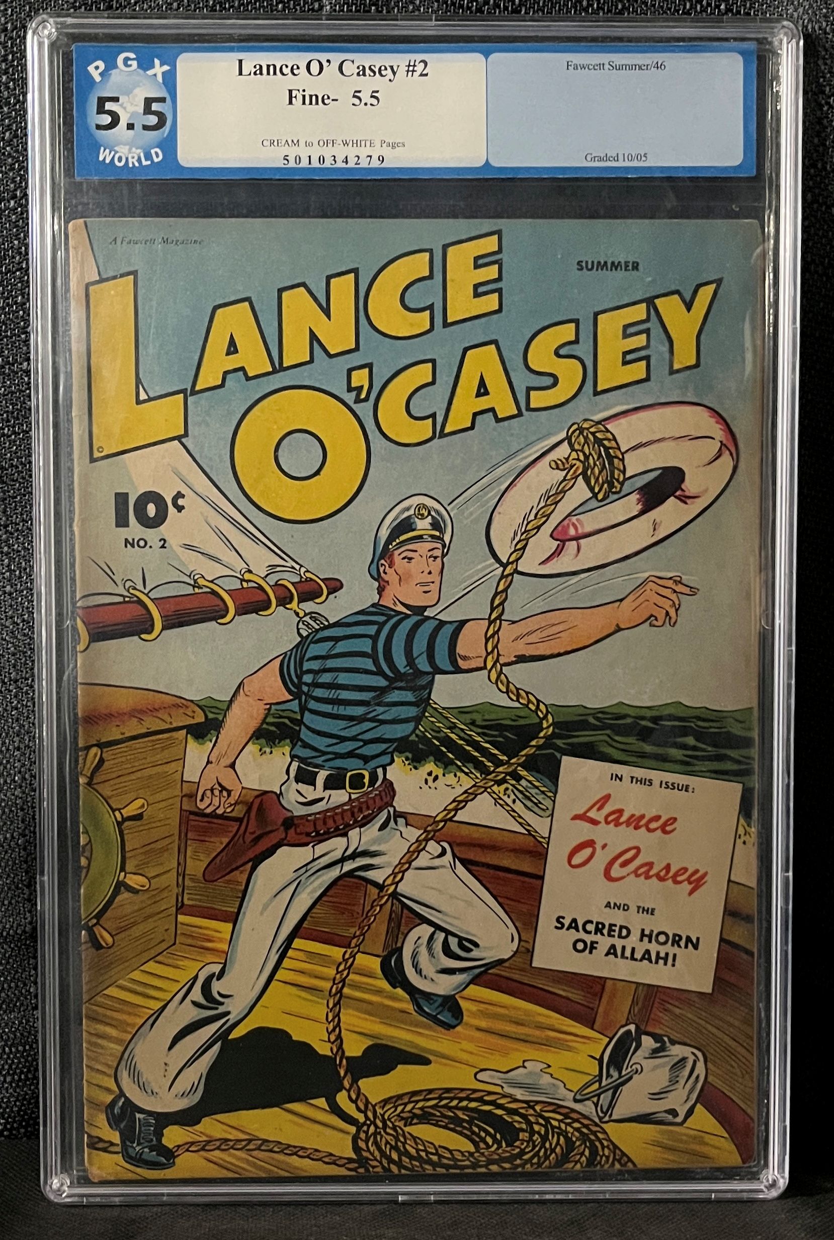A Golden Age comic book, “Lance O’ Casey #2,” published by Fawcett in Summer 1946. The comic is professionally graded by PGX World as Fine- 5.5 with Cream to Off-White pages, and was graded in October 2005. It is encased in a rigid plastic slab. The colorful cover, rendered in a classic adventure style, depicts a male character in a sailor’s cap and striped shirt, holding a rope and lifebuoy on a ship’s deck. The cover prominently displays “10¢” and “NO. 2,” along with the title “LANCE O’ CASEY” and a blurb stating “IN THIS ISSUE: Lance O’ Casey AND THE SACRED HORN OF ALLAH!”. The comic appears well-preserved within its protective casing, consistent with its assigned vintage grade.