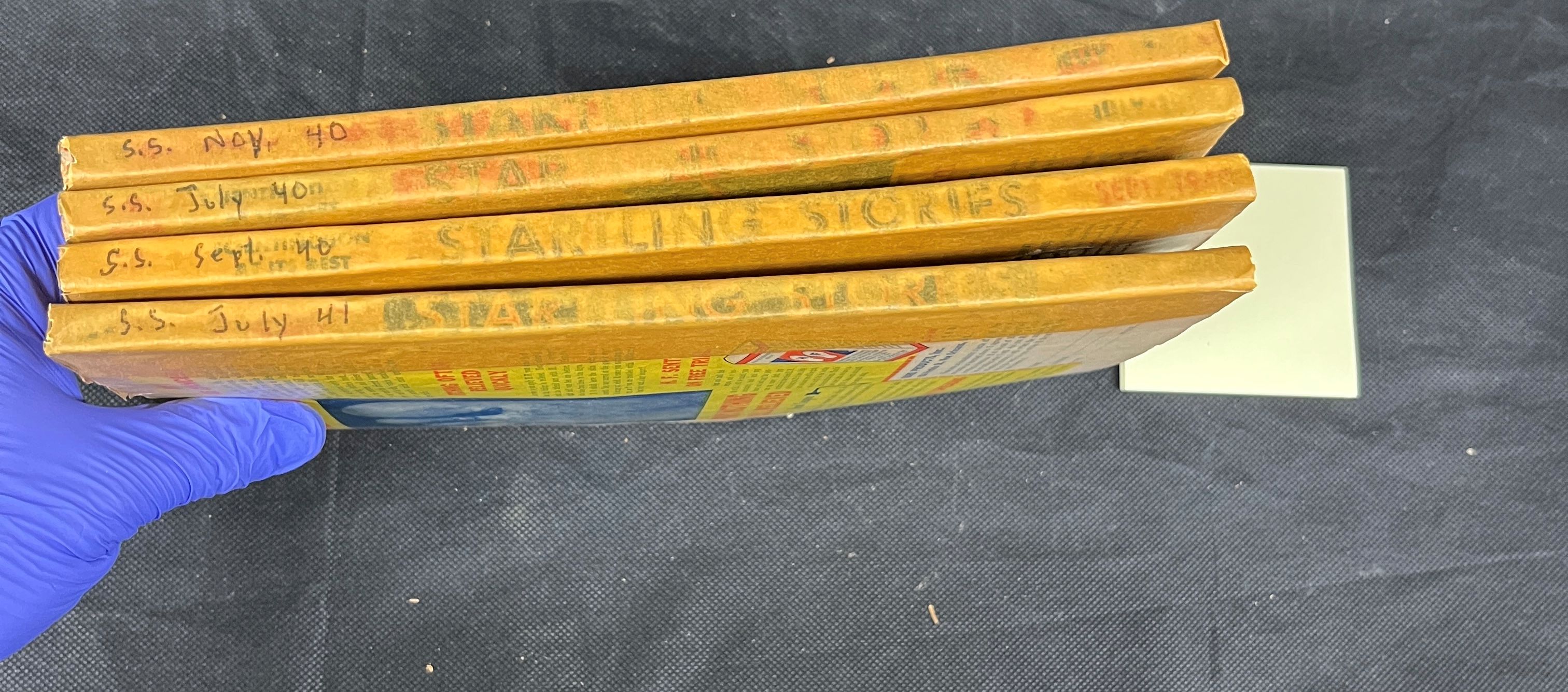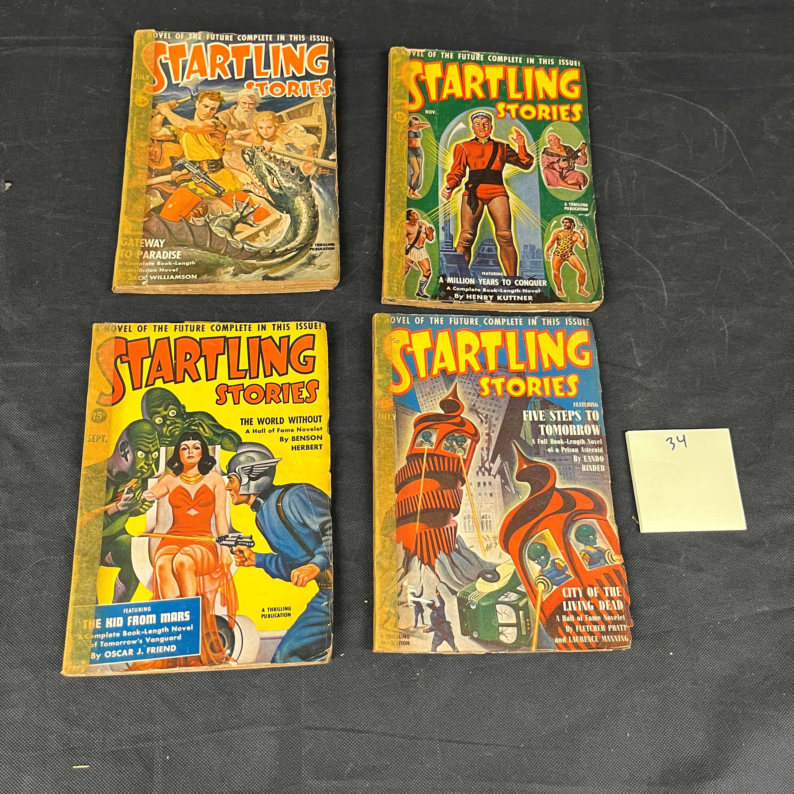A group of four vintage American pulp science fiction magazines, all titled “Startling Stories,” dating from the early 1940s, specifically July 1940, September 1940, November 1940, and July 1941. Each magazine features vibrant, stylized illustrations characteristic of the pulp art genre, depicting various science fiction themes including astronauts, aliens, and futuristic cityscapes. Prominent text notes “NOVEL OF THE FUTURE COMPLETE IN THIS ISSUE!” and credits authors such as E.E. Smith, Henry Kuttner, Benson Herbert, Oscar J. Friend, and Edmond Hamilton for featured stories. Constructed from printed paper, the reverse sides display period advertisements for consumer products such as “Foot Itch,” “Group Life Policy,” and “Lucky Strike Cigarettes.”