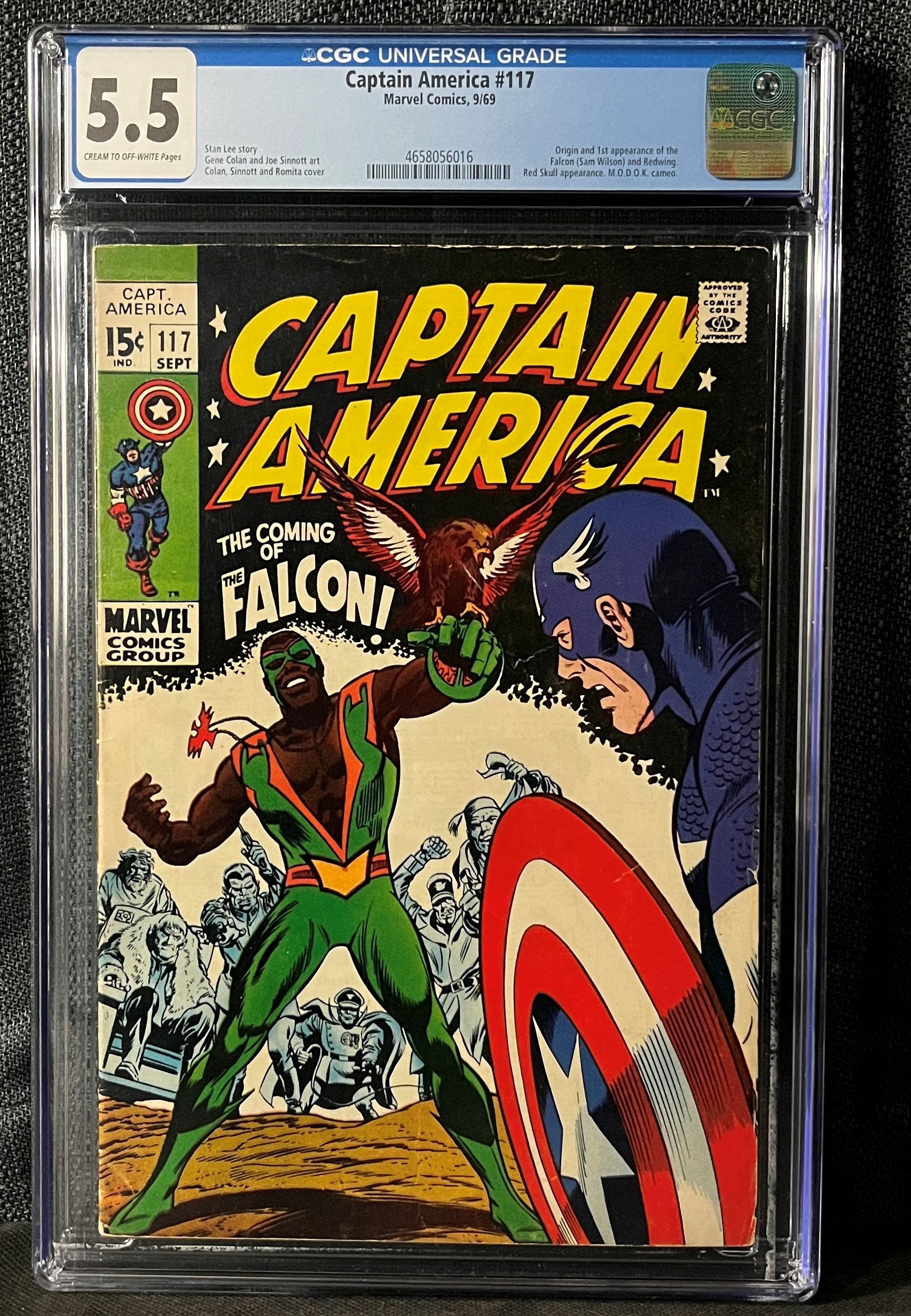 A CGC-graded copy of *Captain America #117*, published by Marvel Comics in September 1969. The comic is encapsulated in a clear, rigid plastic slab and bears a CGC Universal Grade of 5.5 with “CREAM TO OFF-WHITE Pages.” The cover art prominently features Captain America and the debut of The Falcon (Sam Wilson) in green and orange attire, alongside an eagle. The large yellow title reads “CAPTAIN AMERICA” with a banner proclaiming “THE COMING OF THE FALCON!”. Other visible markings on the comic include a 15¢ price, the Marvel Comics Group logo, and the “APPROVED BY THE COMICS CODE AUTHORITY” stamp. The CGC label notes the creative team as Stan Lee (story), Gene Colan & Joe Sinnott (art), and Colan, Sinnott & Romita (cover). Key appearances highlighted on the label include the “Origin and 1st appearance of the Falcon (Sam Wilson) and Redwing,” as well as a “Red Skull appearance” and “M.O.D.O.K. cameo.”