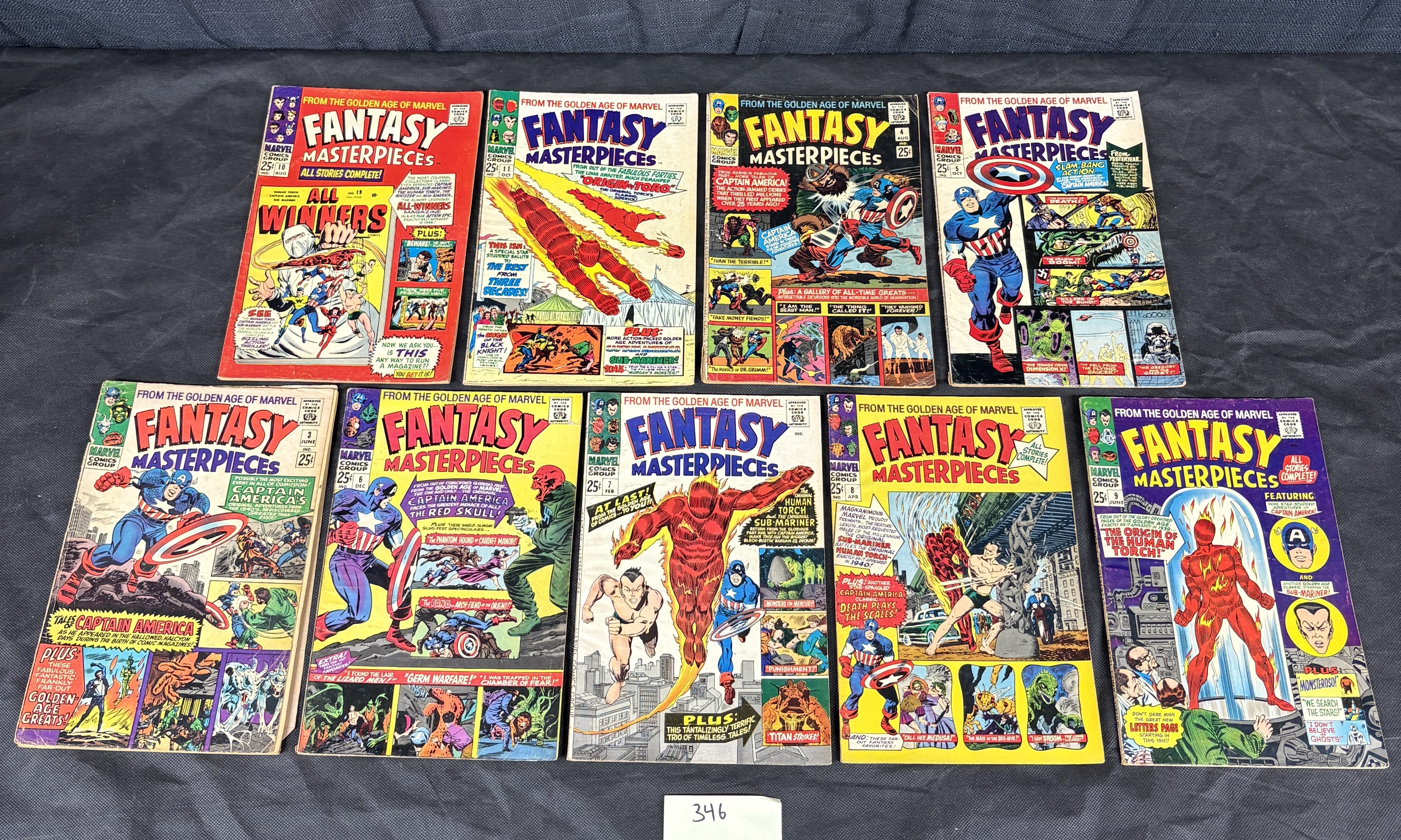A group of 9 vintage comic books from the Marvel Comics Group series ‘Fantasy Masterpieces.’ Each issue prominently displays ‘FROM THE GOLDEN AGE OF MARVEL, ‘ indicating they contain reprints of earlier Golden Age stories. Visible issue numbers span from 3 to 11, with months of publication including June, August, October, December, February, and April. All issues are priced at 25 cents and bear the ‘APPROVED BY THE COMICS CODE AUTHORITY’ seal. Cover art consistently features classic Marvel characters such as Captain America, the Human Torch, Sub-Mariner, the Red Skull, and Toro.