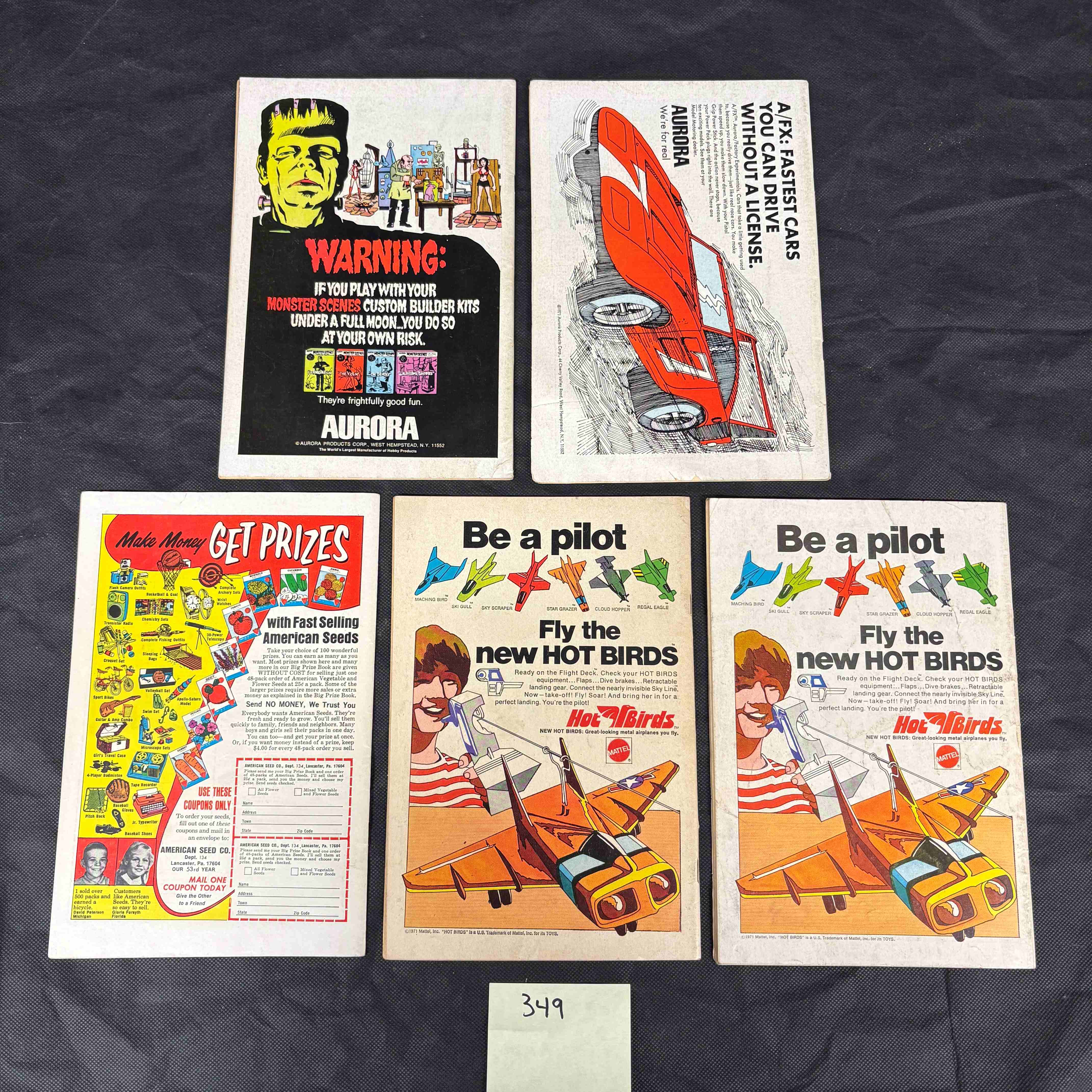 The reverse sides feature various period advertisements, including Aurora Monster Kits, Aurora race cars, American Seeds, and Hot Birds model planes. A handwritten number "349" is visible at the bottom of the lot.