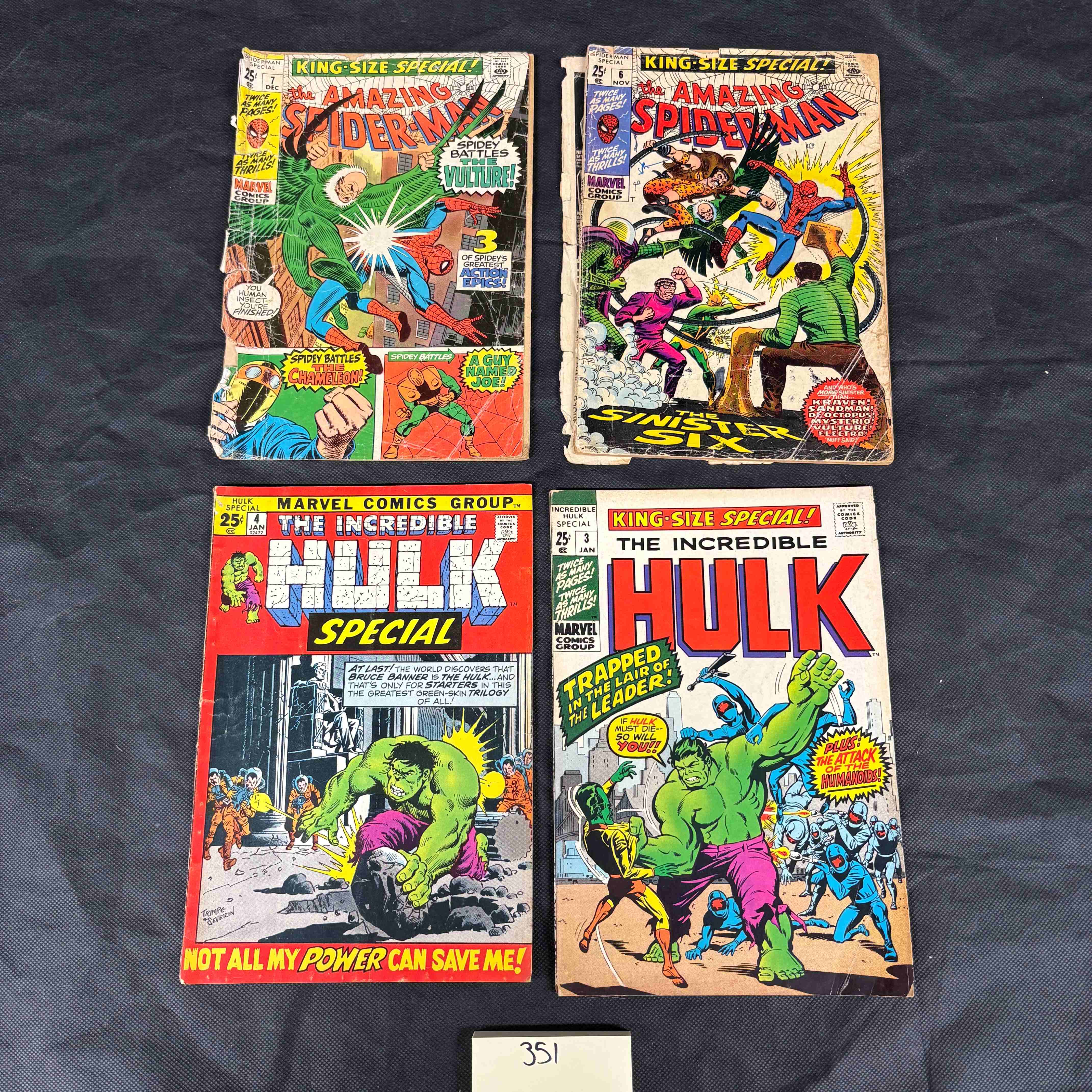 A group of four vintage Marvel Comics Group special issue comic books, comprising two ‘The Amazing Spider-Man’ King-Size Special issues and two ‘The Incredible Hulk’ Annual/Special issues. Specifically, ‘The Amazing Spider-Man’ issues #6 (November) and #7 (December), and ‘The Incredible Hulk’ issues #3 and #4 (January). All issues bear a 25¢ cover price. The Spider-Man issues and Hulk #3 are identified as ‘King-Size Special’ editions, while Hulk #4 is a ‘Hulk Special’. These color-illustrated paper comics feature iconic Silver Age superhero artwork. Spider-Man battles The Vulture, Chameleon, and the Sinister Six (Kraven, Sandman, Dr. Octopus, Mysterio, Vulture, Electro). The Hulk confronts The Leader and Humanoids; issue #4 also credits Trimpe & Severin. Each comic includes the ‘Approved by the Comics Code Authority’ seal. An inventory tag numbered ‘351’ is present.