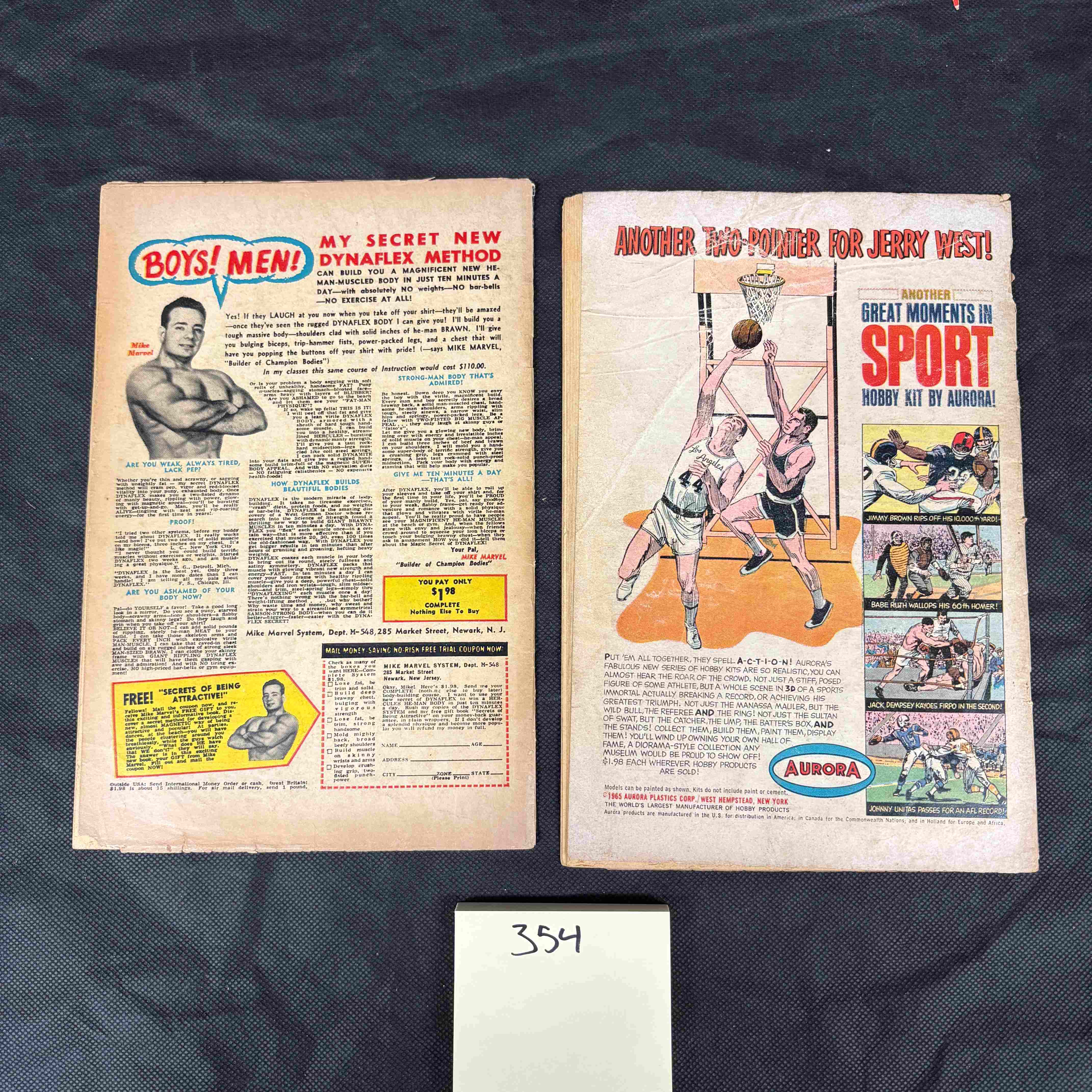 Used condition. Both comics exhibit creasing, edge wear, and spine stress. Discoloration and staining are present on covers and pages, consistent with age and handling. No significant tears or missing pages observed, but general wear is evident.