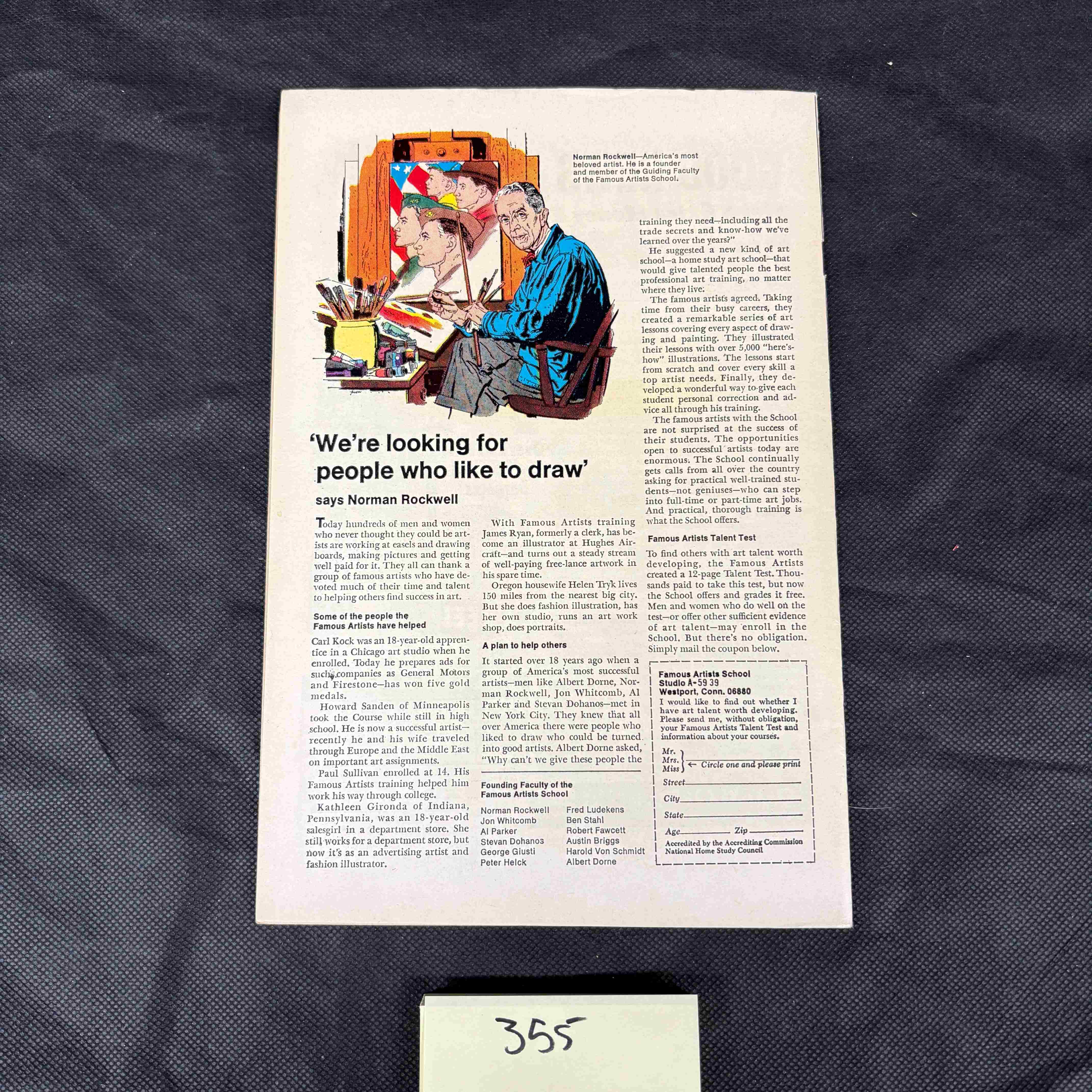A vintage American comic book, ‘NICK FURY, AGENT OF S.H.I.E.L.D.’ Issue #7, published by the MARVEL COMICS GROUP in 1968. Priced at 12¢, dated December. The dynamic full-color cover art, signed ‘STERANKO,’ depicts Nick Fury amidst surreal elements like melting platforms, numerous clocks, a skull, and fragmented textual blurbs such as ‘Secret,’ ‘Nowhere,’ and ‘Accused killer,’ characteristic of late 1960s superhero comic styling. The back cover features a full-page advertisement for the ‘Famous Artists School,’ with an illustration of artists and text referencing Norman Rockwell, alongside a coupon. Constructed from printed paper.