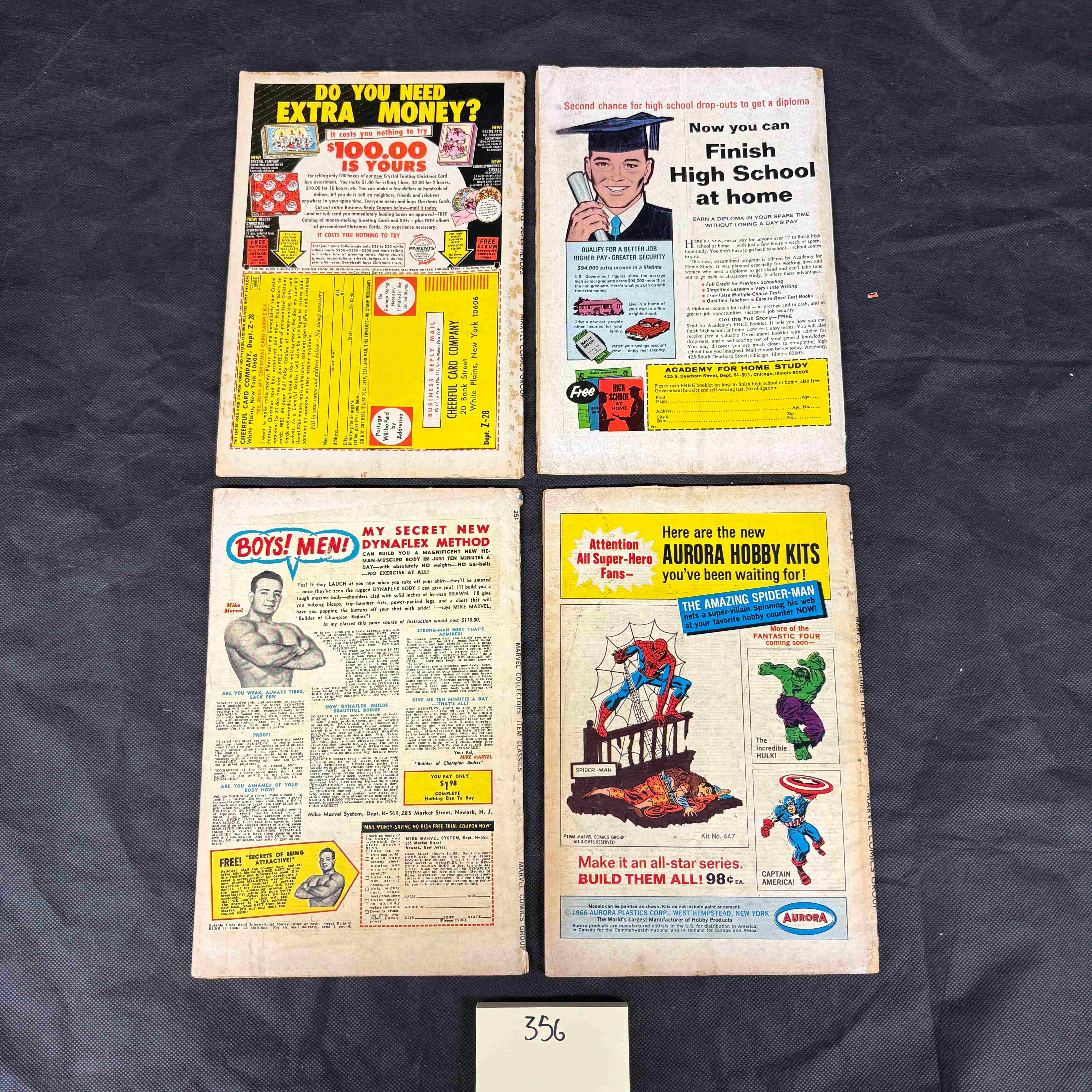 A collection of four American comic books published by the Marvel Comics Group, characteristic of the Silver to early Bronze Age. Each comic features a 25¢ cover price. The lot includes two issues of “Marvel Super-Heroes” (#2 featuring Daredevil and Iron Man, and #7 featuring Hulk and the Leader), and two issues of “Marvel Collectors’ Item Classics” (#2 and #7). The “Marvel Collectors’ Item Classics” issues are noted as reprinting stories from 1966 and feature a variety of prominent Marvel characters such as the Fantastic Four, Spider-Man, Doctor Strange, and the Hulk. All covers are printed in color on paper, displaying dynamic illustrations of the featured superheroes and villains, with visible titles, issue numbers, publisher details, and period taglines such as “Alone, Against the Underworld!” and “Hulk Fights Alone Against The Leader! To The Death!”. The back covers feature an array of period-specific advertisements for items including home study courses, muscle-building programs, mail-order products, and Aurora Super-Hero Hobby Kits.