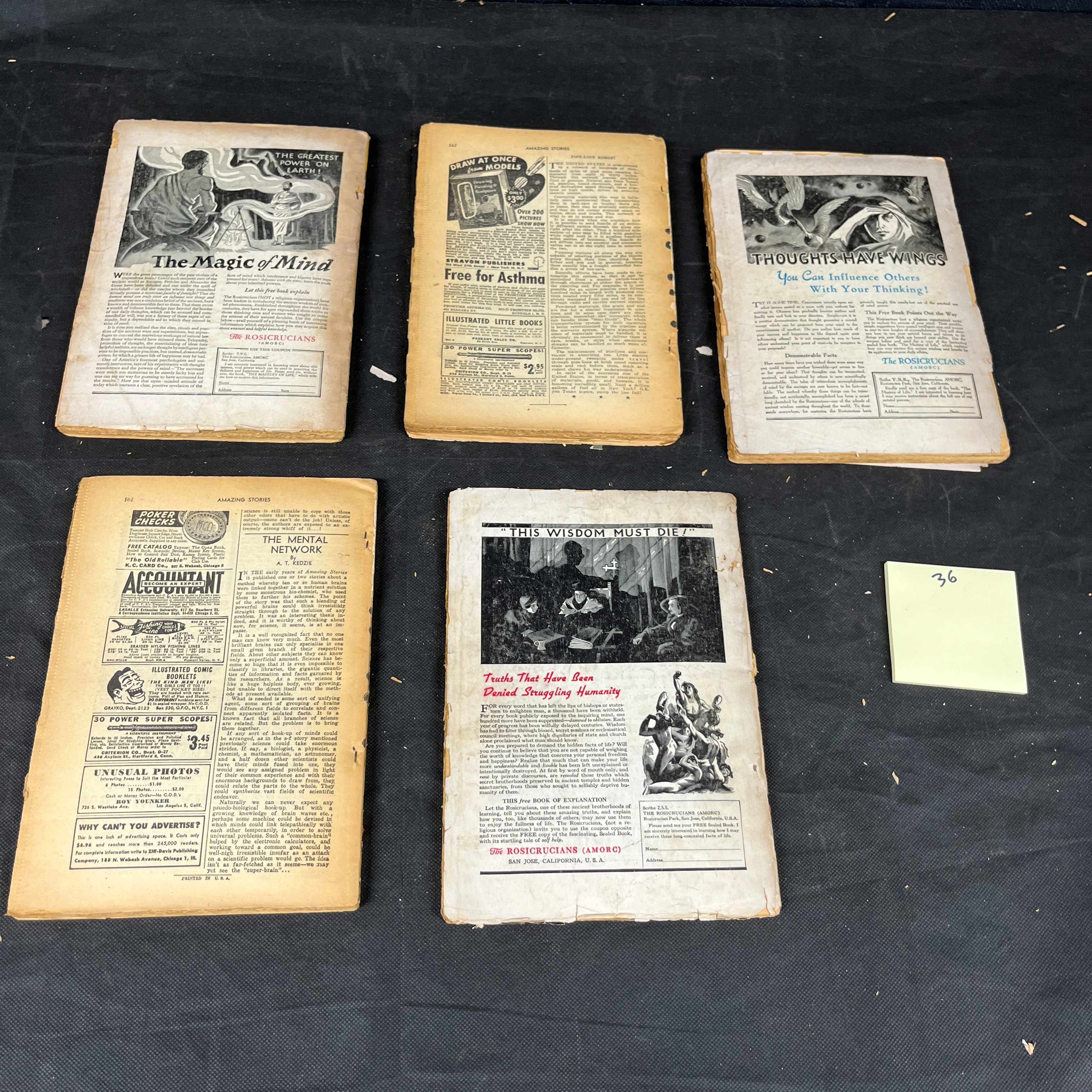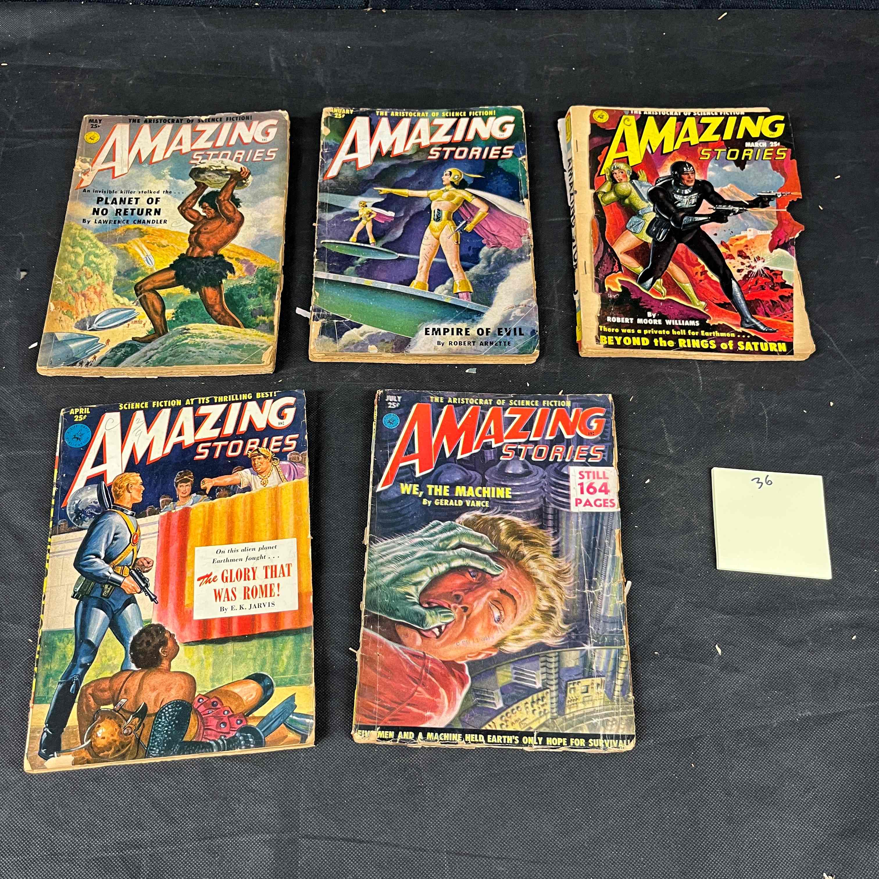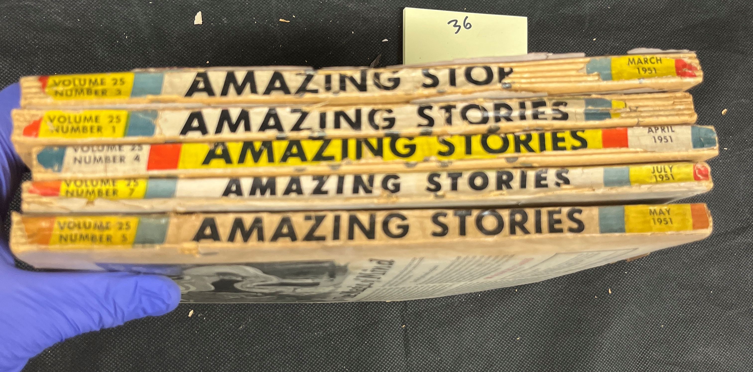 Five vintage American ‘Amazing Stories’ science fiction pulp magazines, comprising issues from Volume 25, dated March, April, May (two copies), and July 1951. Each magazine features a distinct, vibrantly illustrated cover depicting classic 1950s science fiction themes, often involving space, futuristic characters, or fantastical scenarios. Visible text includes the masthead “Amazing Stories,” specific story titles such as “The Giant of No Return,” “Empire of Evil,” “Devil’s Planet,” “The Glory That Was Rome!”, and “We, The Machine,” along with author credits and advertising slogans like “The Aristocrat of Science Fiction.” The back covers predominantly feature period advertisements, notably for “The Rosicrucians (AMORC)” and various mail-order products.