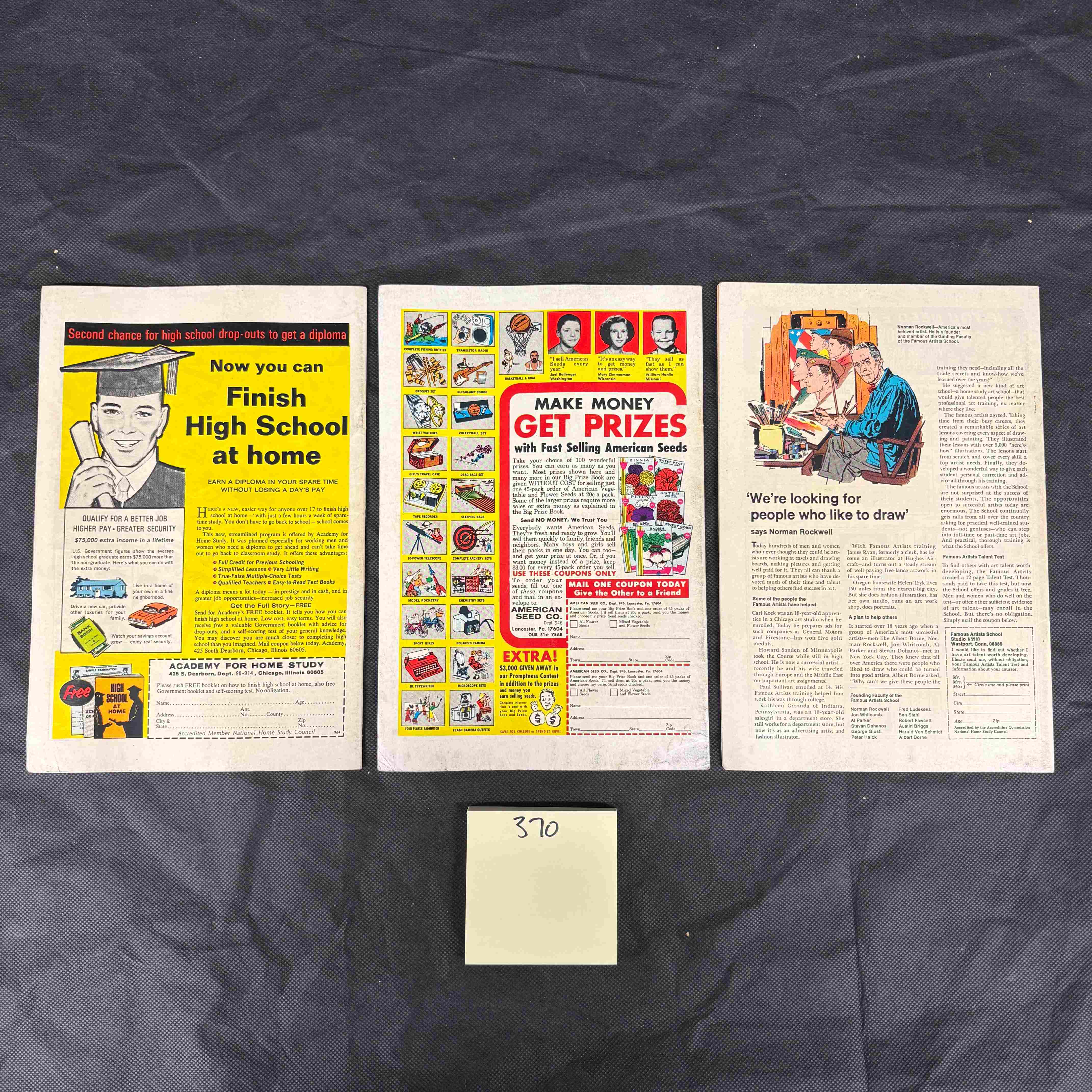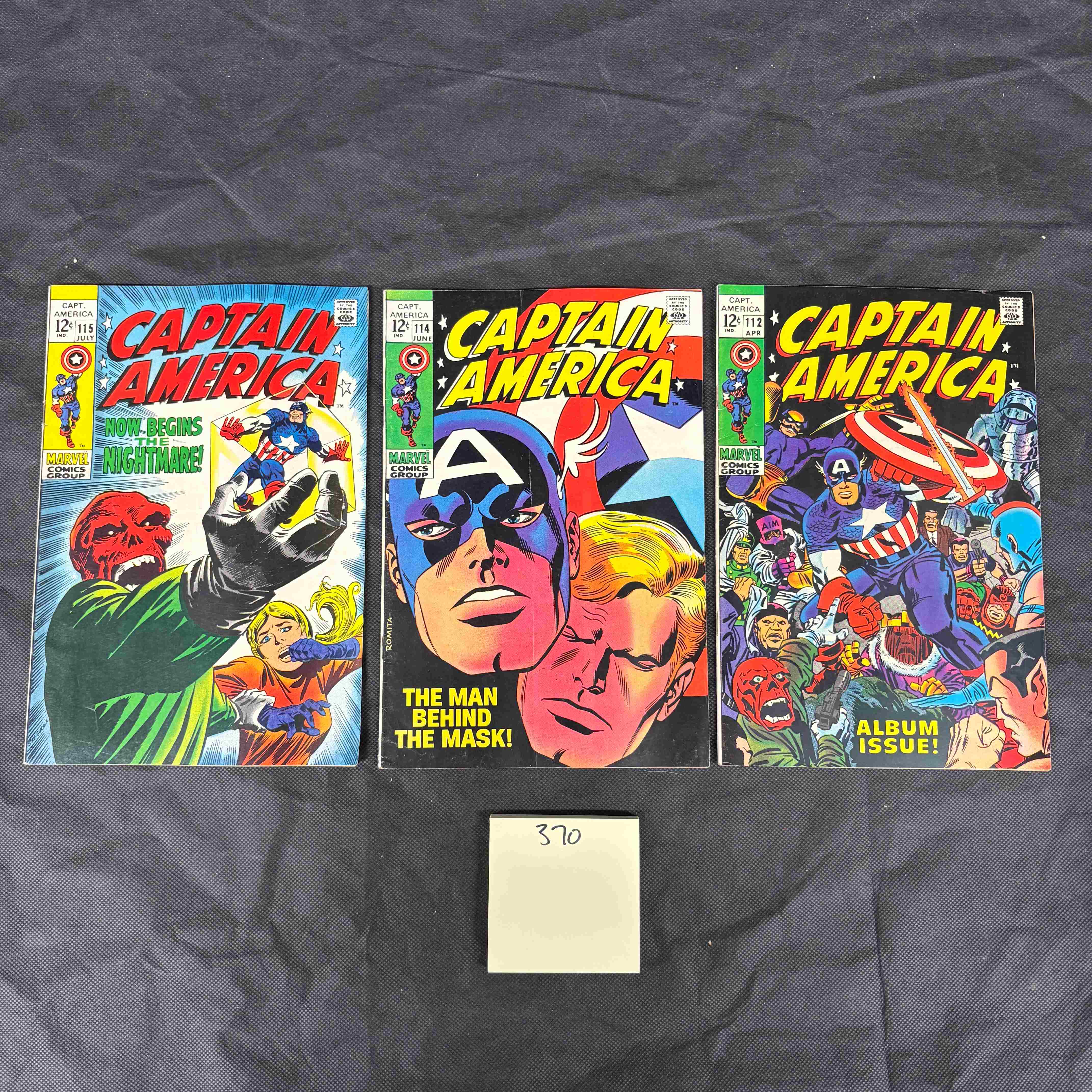 This lot comprises three vintage Marvel Comics Captain America issues, specifically numbers 115, 114, and 112, all featuring the original 12-cent cover price. These paper comic books display colorful superhero artwork indicative of the late 1960s. Each cover prominently features the “CAPTAIN AMERICA” title and the “MARVEL COMICS GROUP” logo. Issue-specific taglines include “NOW BEGINS THE NIGHTMARE!” (issue #115), “THE MAN BEHIND THE MASK!” (issue #114), and “ALBUM ISSUE!” (issue #112). The reverse sides feature various period advertisements, such as calls to “Finish High School at home,” “MAKE MONEY GET PRIZES with FAST SELLING American Seeds,” and an advertisement for the “Famous Artists School” showcasing a Norman Rockwell illustration. A small white note with “370” handwritten on it is present below the items.