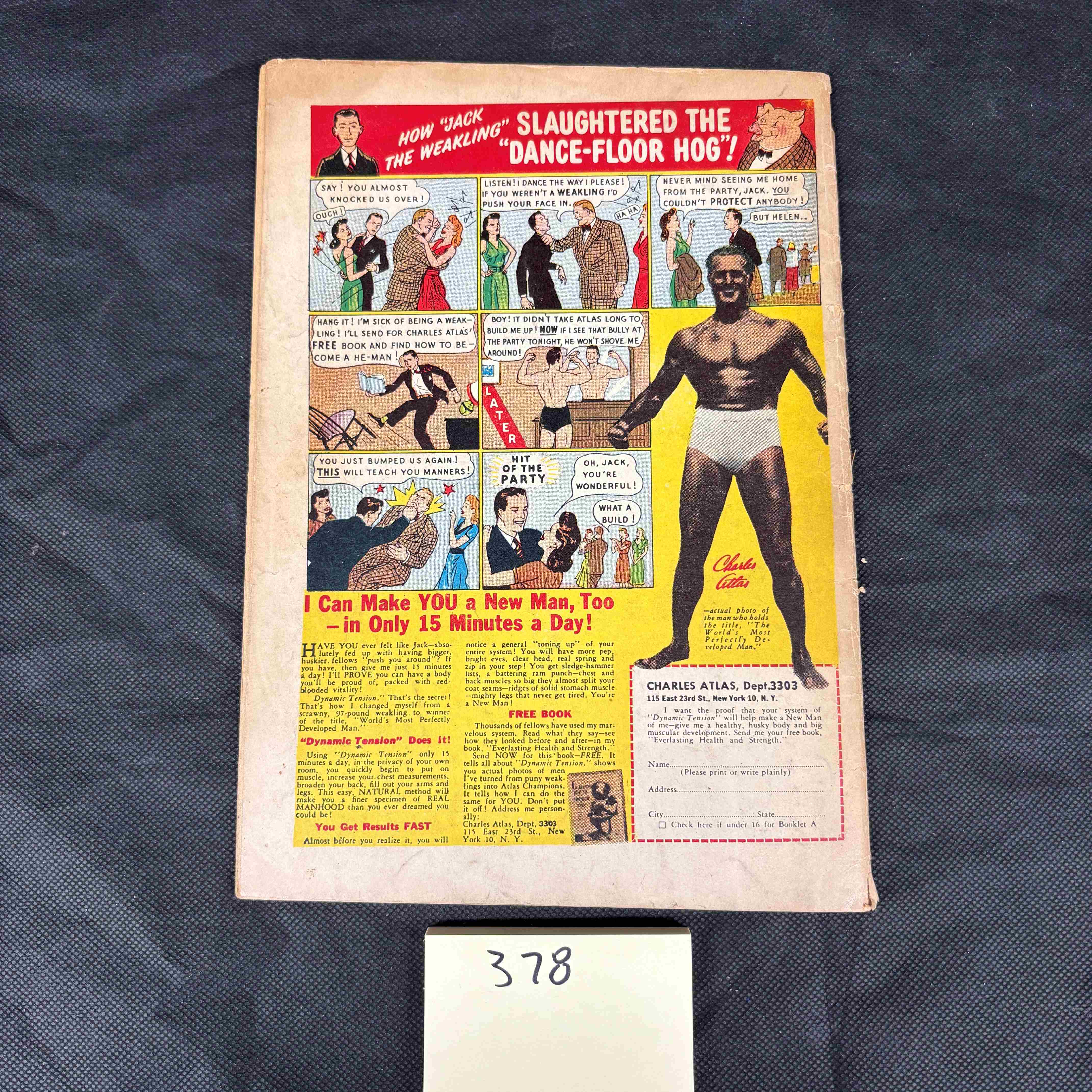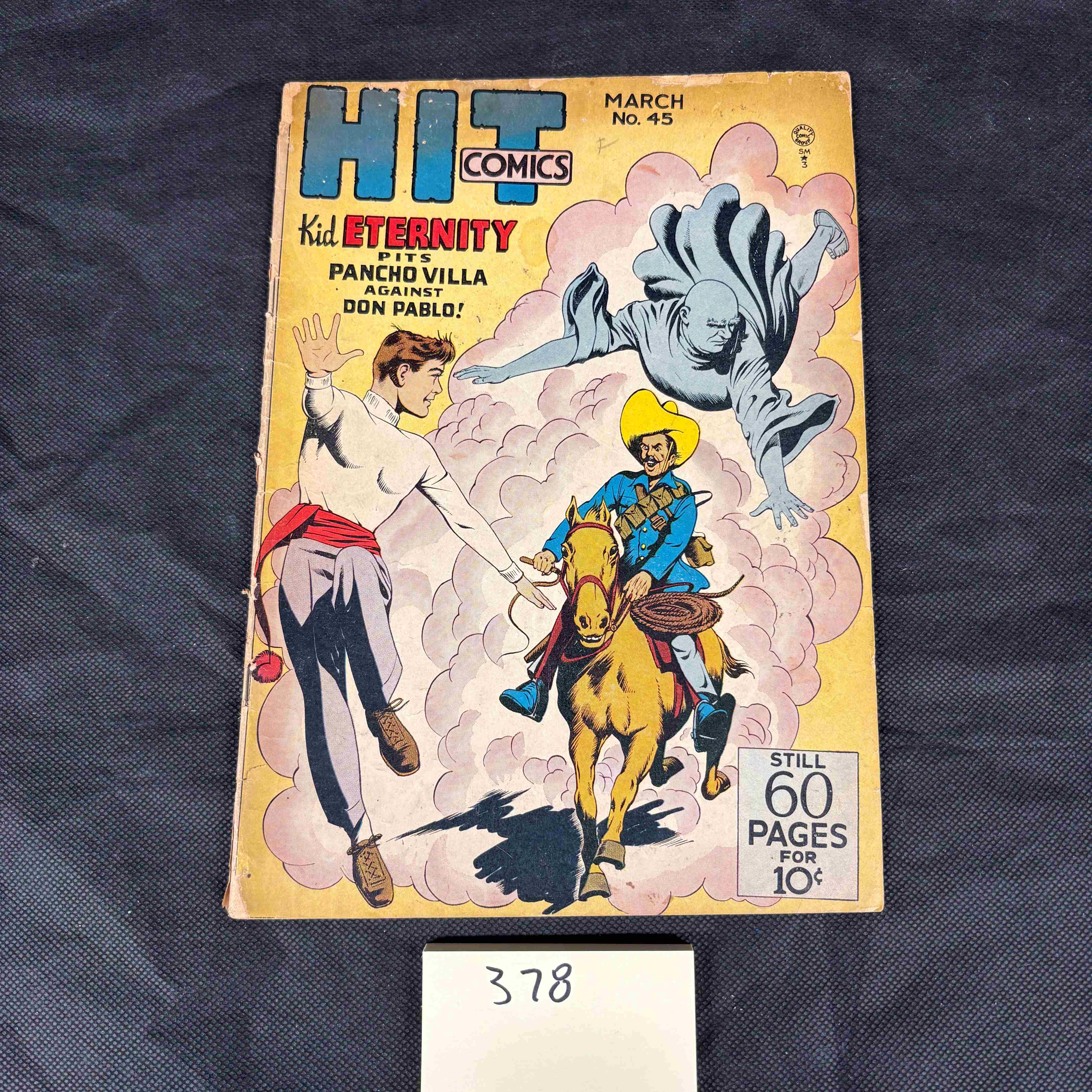 A vintage American comic book, “Hit Comics” No. 45, published by Quality Comics, dated March. The front cover features Golden Age comic art depicting “Kid Eternity” battling “Pancho Villa against Don Pablo,” with “STILL 60 PAGES FOR 10¢” printed below. The reverse side features a full-page advertisement for Charles Atlas, titled “How ‘Jack the Wearling’ Slaughtered the ‘Dance-Floor Hog!'”. Made of paper.