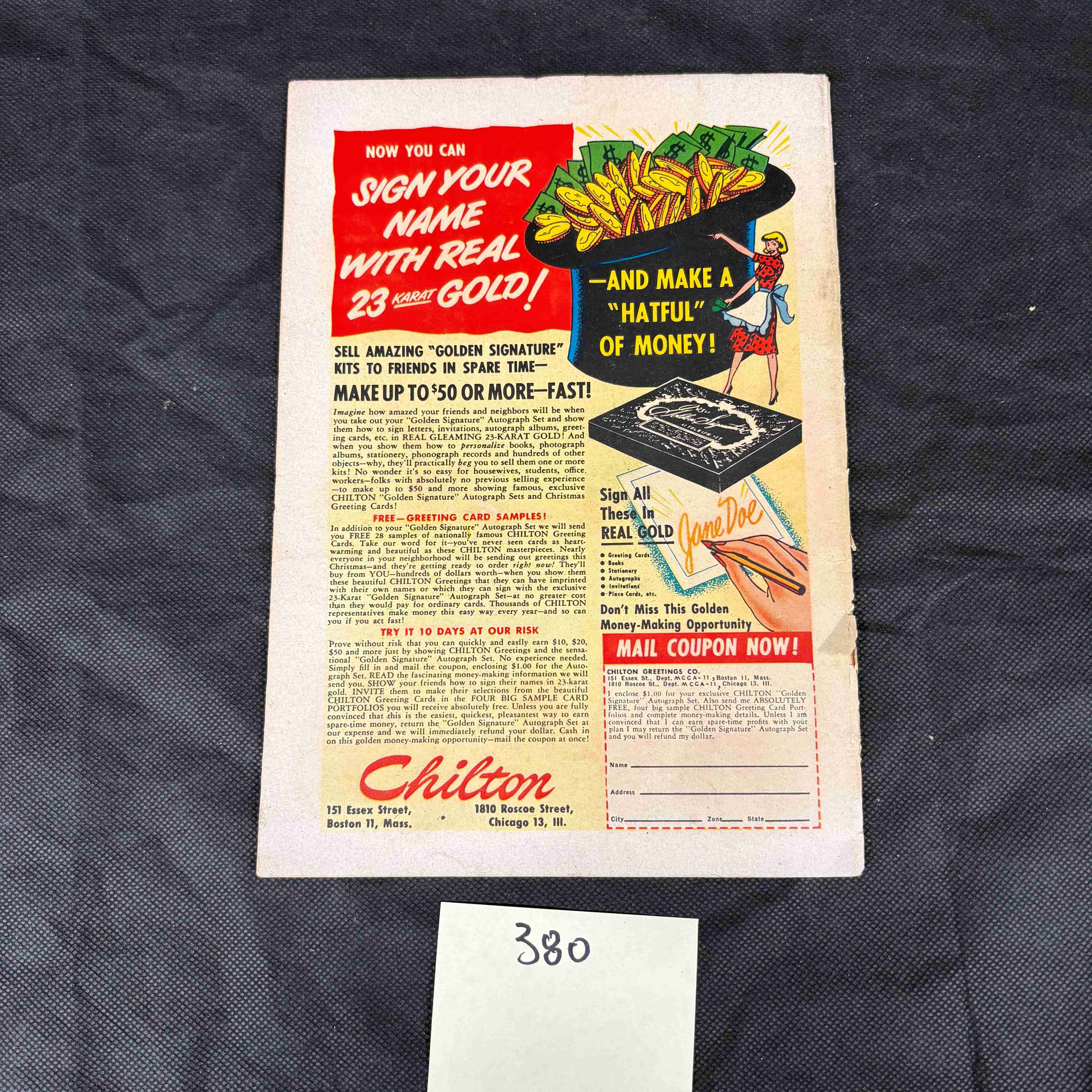A vintage American comic book, Patsy and Hedy No. 5, published by Atlas Comics, from the series launched in 1952. Featuring Patsy Walker and Hedy Wolfe, originally priced at 10¢. The front cover depicts the characters bowling at ‘Pete’s Bowling Palace,’ with visible dialogue ‘HMM…LOOKS LIKE YOU’RE WINNING, HEDY!’ and ‘THAT’S WHAT YOU THINK!’. The back cover features a full-page advertisement for ‘Chilton Greetings Co.’ promoting a ’23 KARAT GOLD!’ signing opportunity, listing addresses for Boston 11, Mass., and Chicago 13, Ill. Constructed from paper.