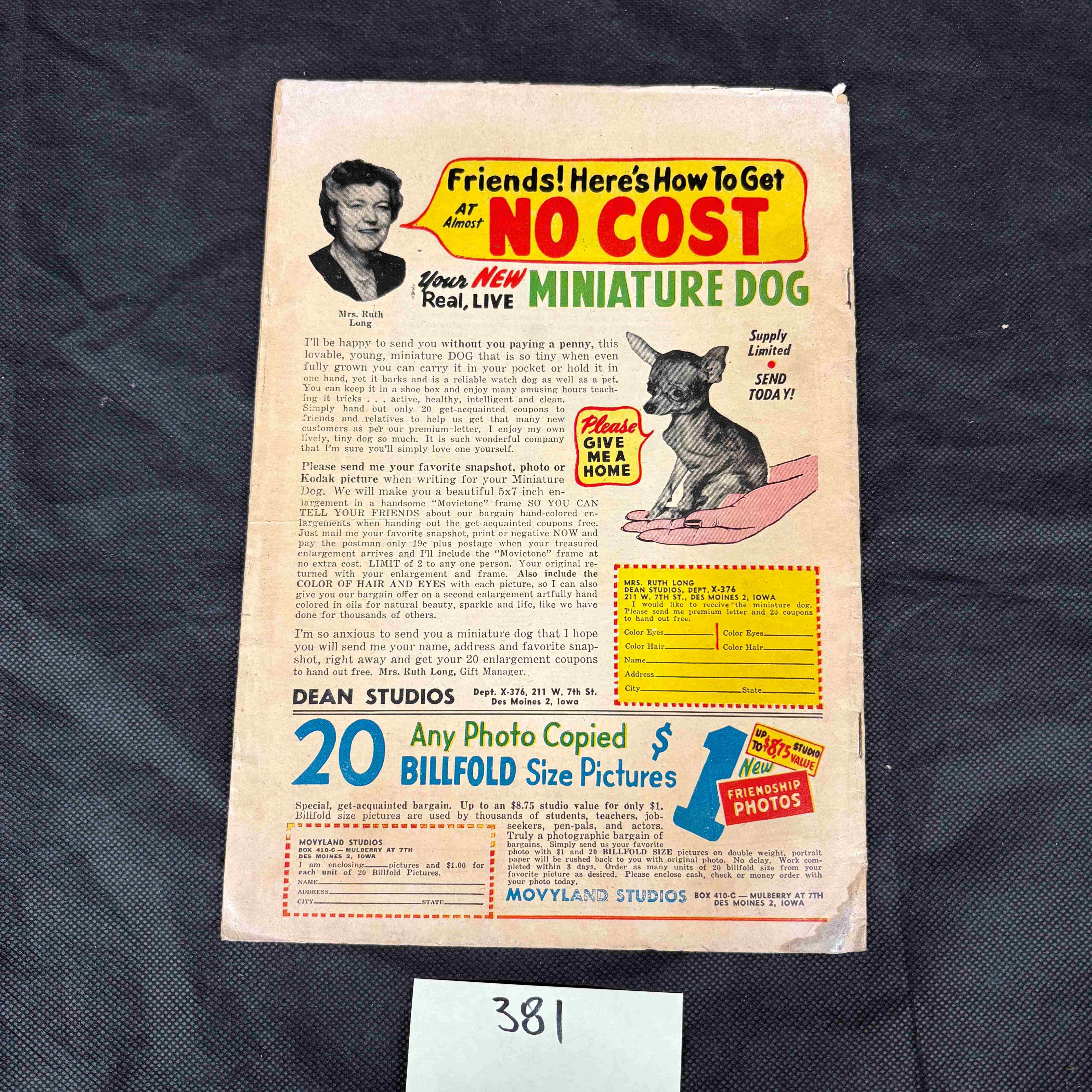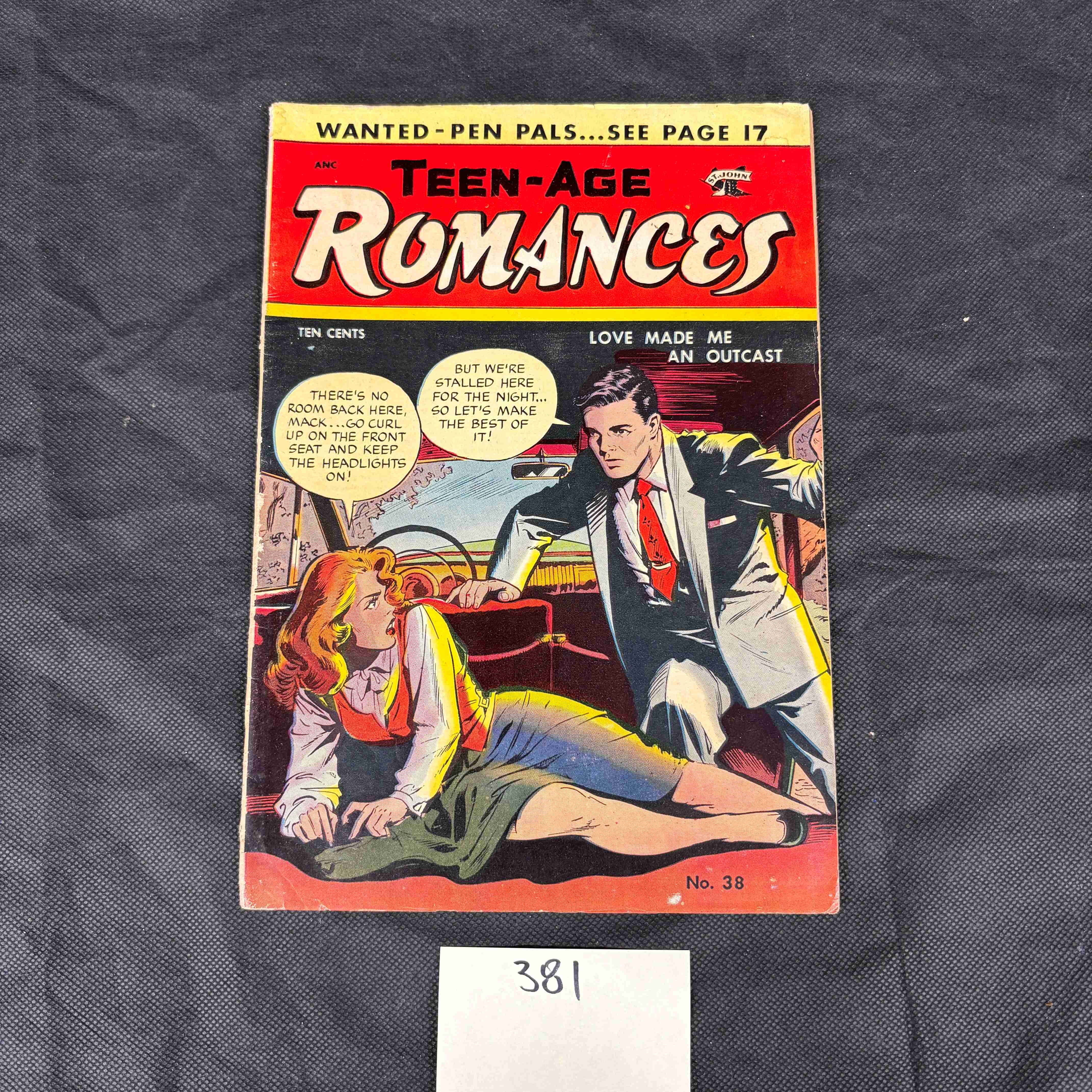 A vintage ‘Teen-Age Romances’ comic book, issue No. 38, published by St. John. Originally priced at Ten Cents, the front cover features classic mid-20th century comic art depicting a man in a suit leaning over a woman in a car, with dialogue such as “HERE’S NO ROOM BACK HERE, MARY…GO CURL UP ON THE FRONT SEAT AND TURN THE HEADLIGHTS ON!” and “BUT WE’RE STALLED HERE FOR THE NIGHT…SO LET’S MAKE THE BEST OF IT!”. It also includes titles like “WANTED – PEN PALS…SEE PAGE 17” and “LOVE MADE ME AN OUTCAST”. The “ANC” and “COMICS” logos are visible on the upper portion. The back cover displays two period advertisements: one for a “NEW Real, LIVE MINIATURE DOG” from Mrs. Ruth Long, and another for “20 Any Photo Copied $1 BILLFOLD Size Pictures” by Dean Studios and Movyland Studios. A white sticker with the number “381” in black text is adhered to the bottom edge of both covers.