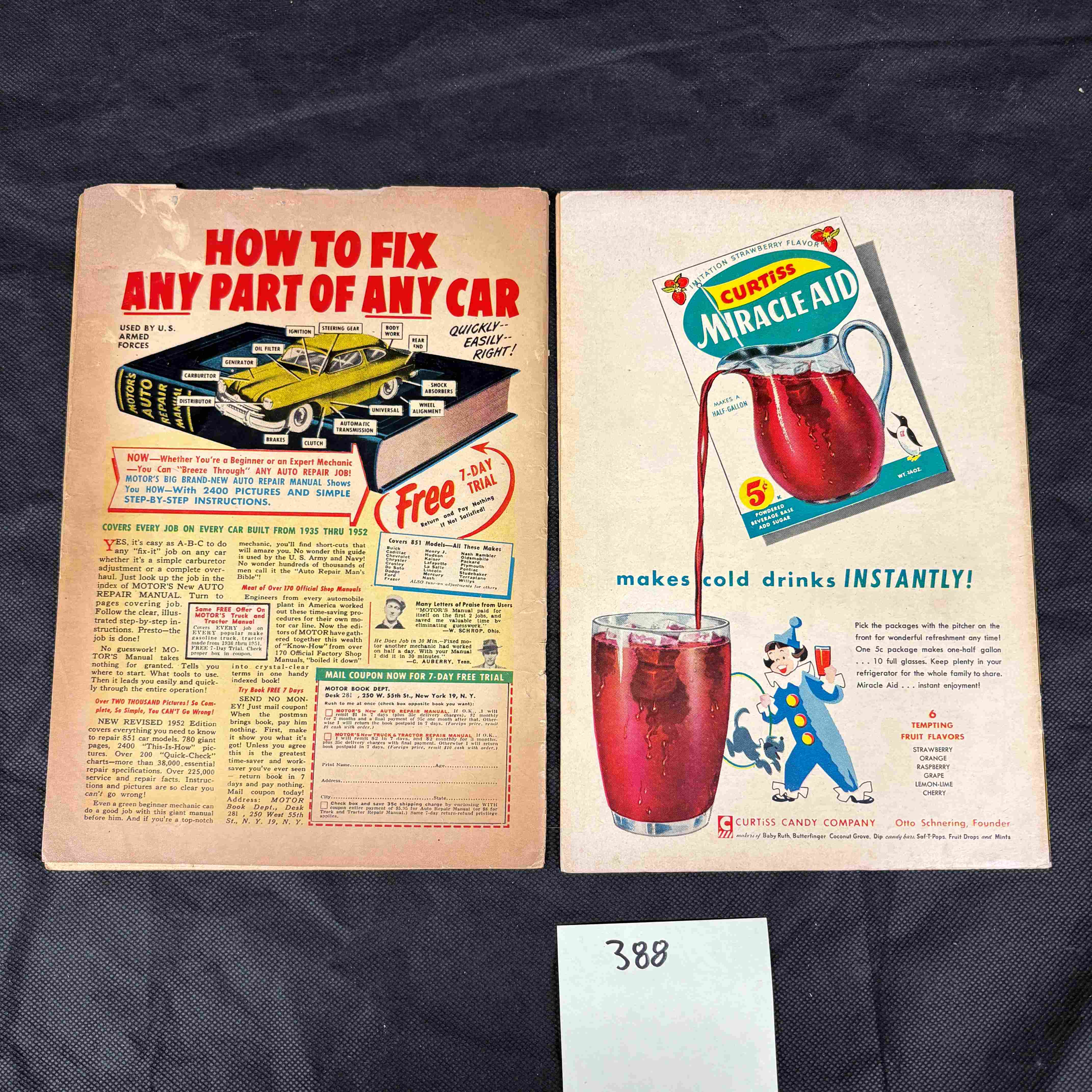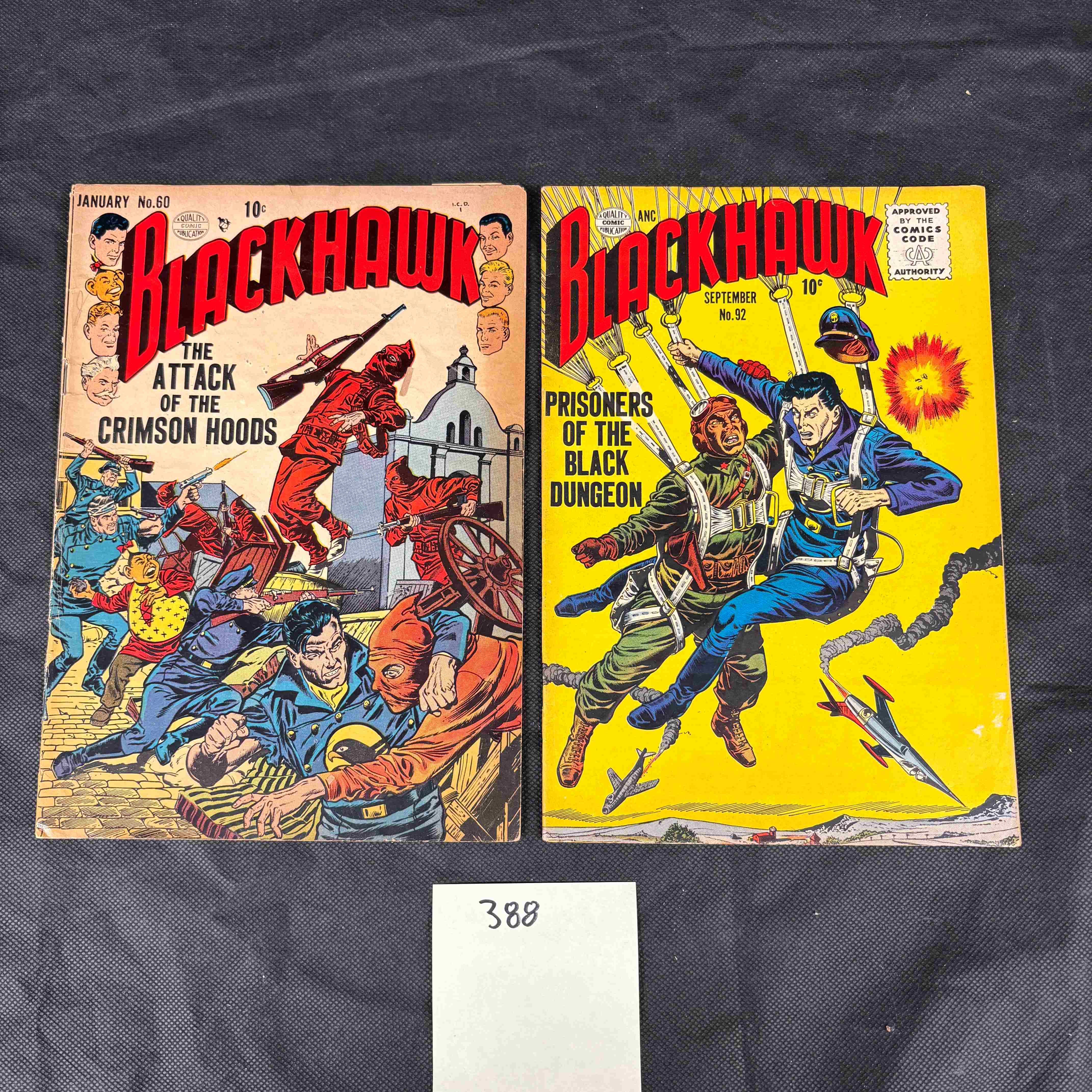 A pair of vintage American comic books from the Blackhawk series by Quality Comics. The first, Issue No. 60, published January 1953, features the story “THE ATTACK OF THE CRIMSON HOODS.” The second, Issue No. 92, published September 1955, features “PRISONERS OF THE BLACK DUNGEON” and bears the “APPROVED BY THE COMICS CODE AUTHORITY” seal. Both comics were originally priced at 10c. The back cover of Issue No. 60 displays an advertisement for a “HOW TO FIX ANY PART OF ANY CAR” manual, while Issue No. 92’s back cover advertises “CURTISS MIRACLE AID” (Strawberry flavor). Printed on paper. A handwritten lot number “388” is visible on a white slip beneath the items.