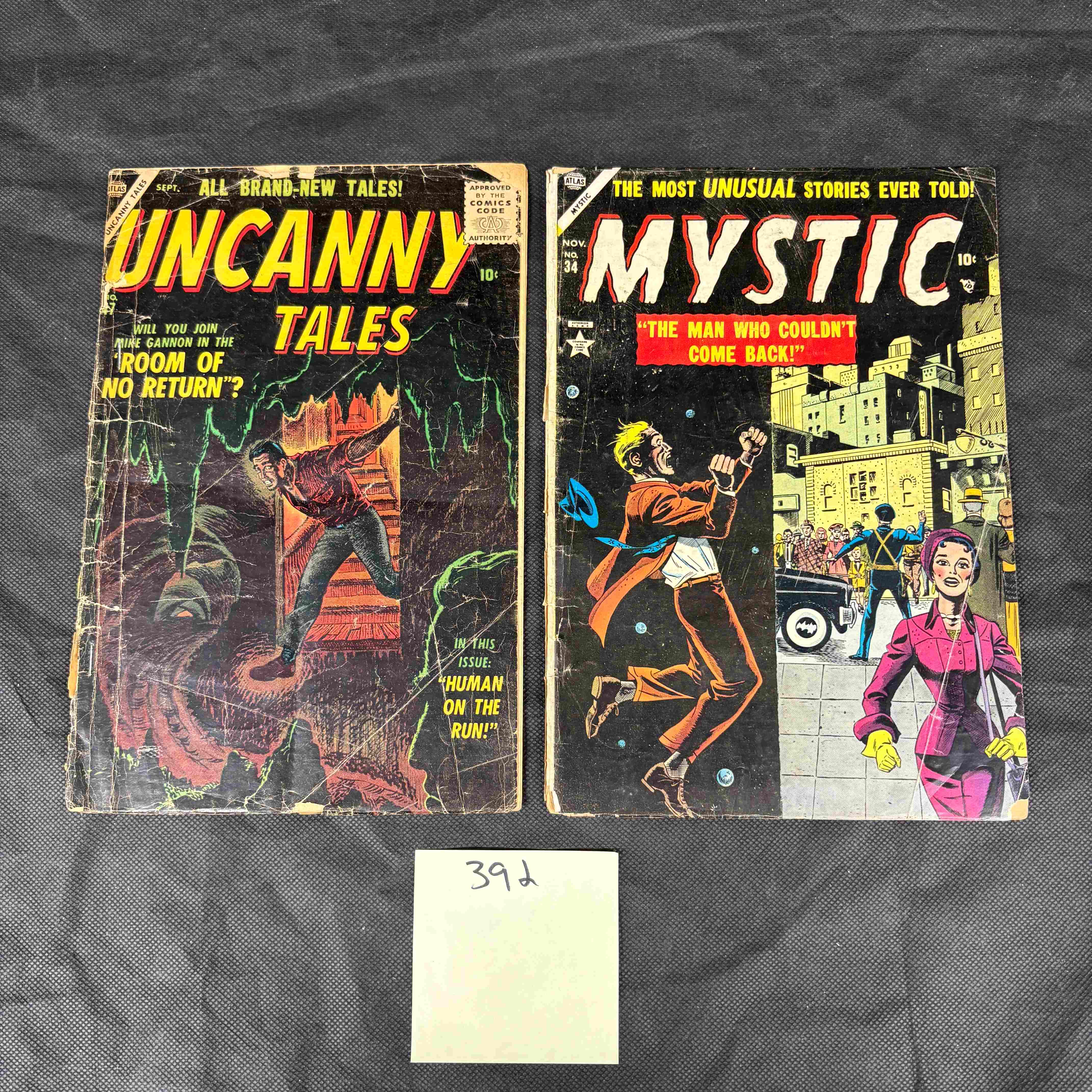 A pair of vintage American comic books, comprising Atlas Comics’ *Uncanny Tales No. 24* (September) and *Mystic No. 34* (November). Both are made of paper, likely from the mid-20th century, featuring horror, mystery, or science fiction themes.