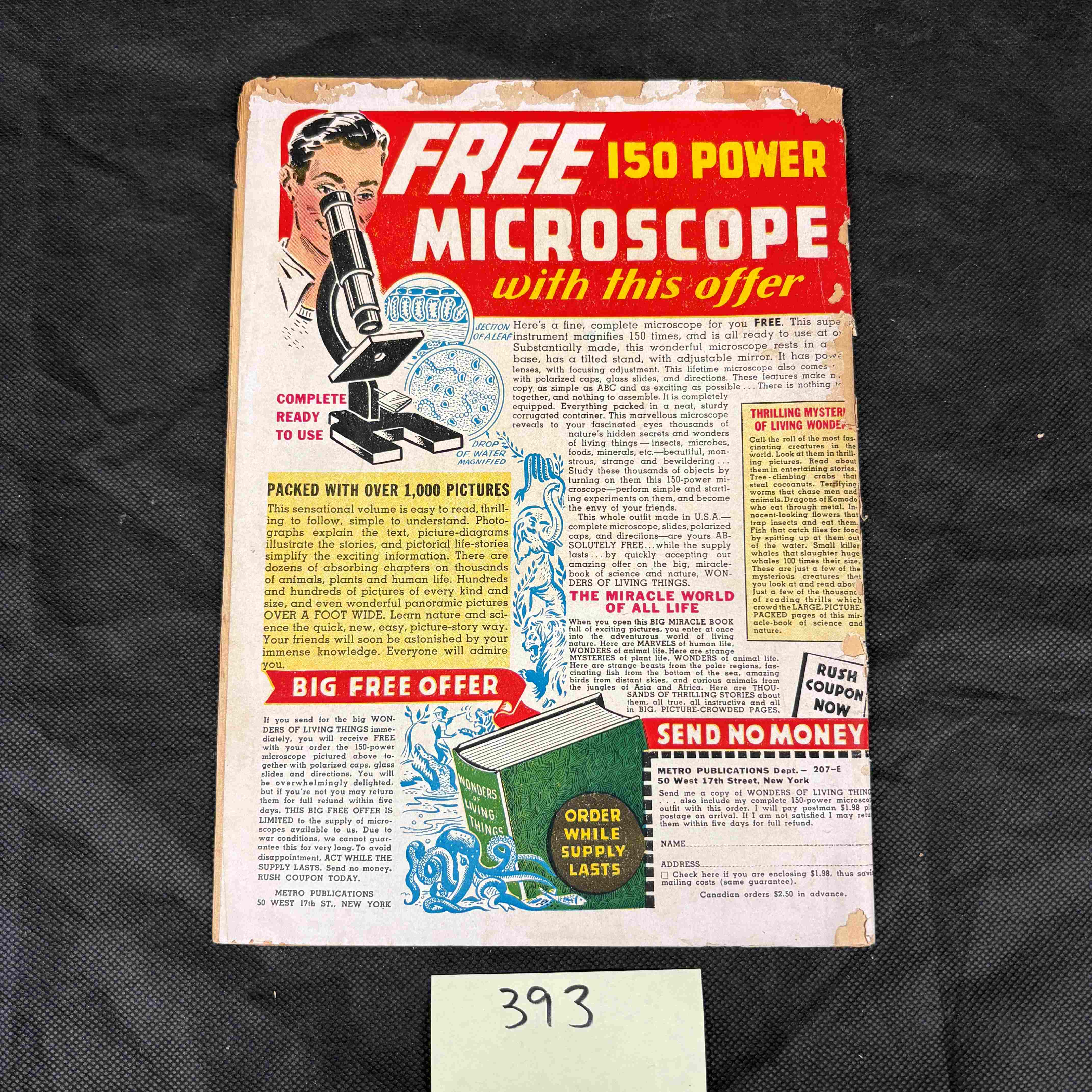 Blue Bolt Vol. 4 No. 2 Comic Book, July and August. This digest-sized, paper-bound publication is priced at 10c. The front cover features a vibrant illustration of a gold and orange-toned Liberty Bell, depicted as cracked, against a blue background. Prominent text includes “PROCLAIM LIBERTY THROUGHOUT ALL THE LAND UNTO ALL THE INHABITANTS THEREOF LEV. XXV X” and “PASSA PHILAD MDCCLIII” (Pass and Stow, Philadelphia, 1753). Additional visible text reads “FEATURING DICK COLE + EDISON BELL” and “LET FREEDOM RING.” The reverse side presents a full-page advertisement for a “FREE 150 POWER MICROSCOPE WITH THIS OFFER” from “METRO PUBLICATIONS.” A white inventory sticker marked “393” is affixed to the bottom of both the front and back covers.