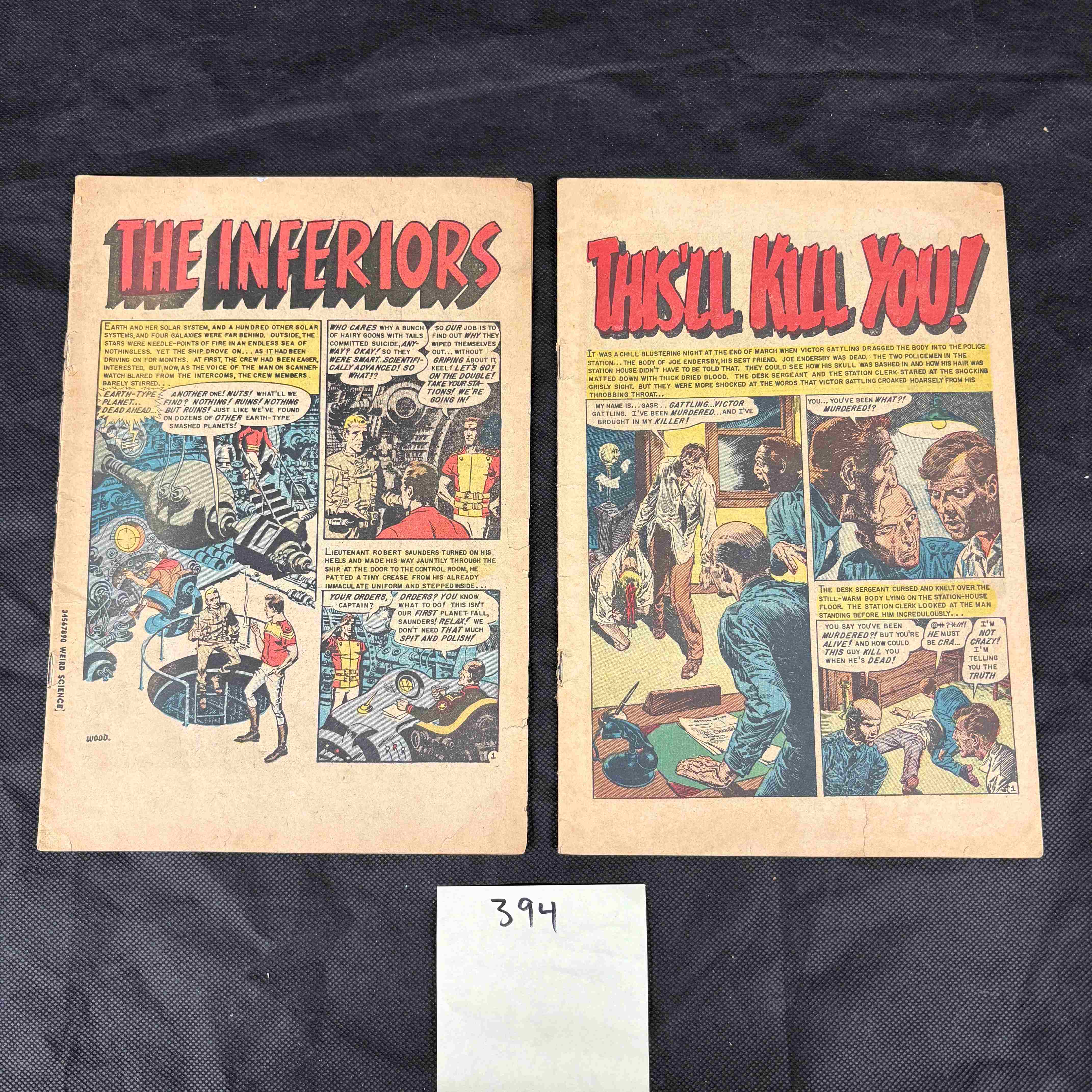 Both comics show considerable wear, including creasing, edge fraying, and general paper discoloration consistent with their age and use.