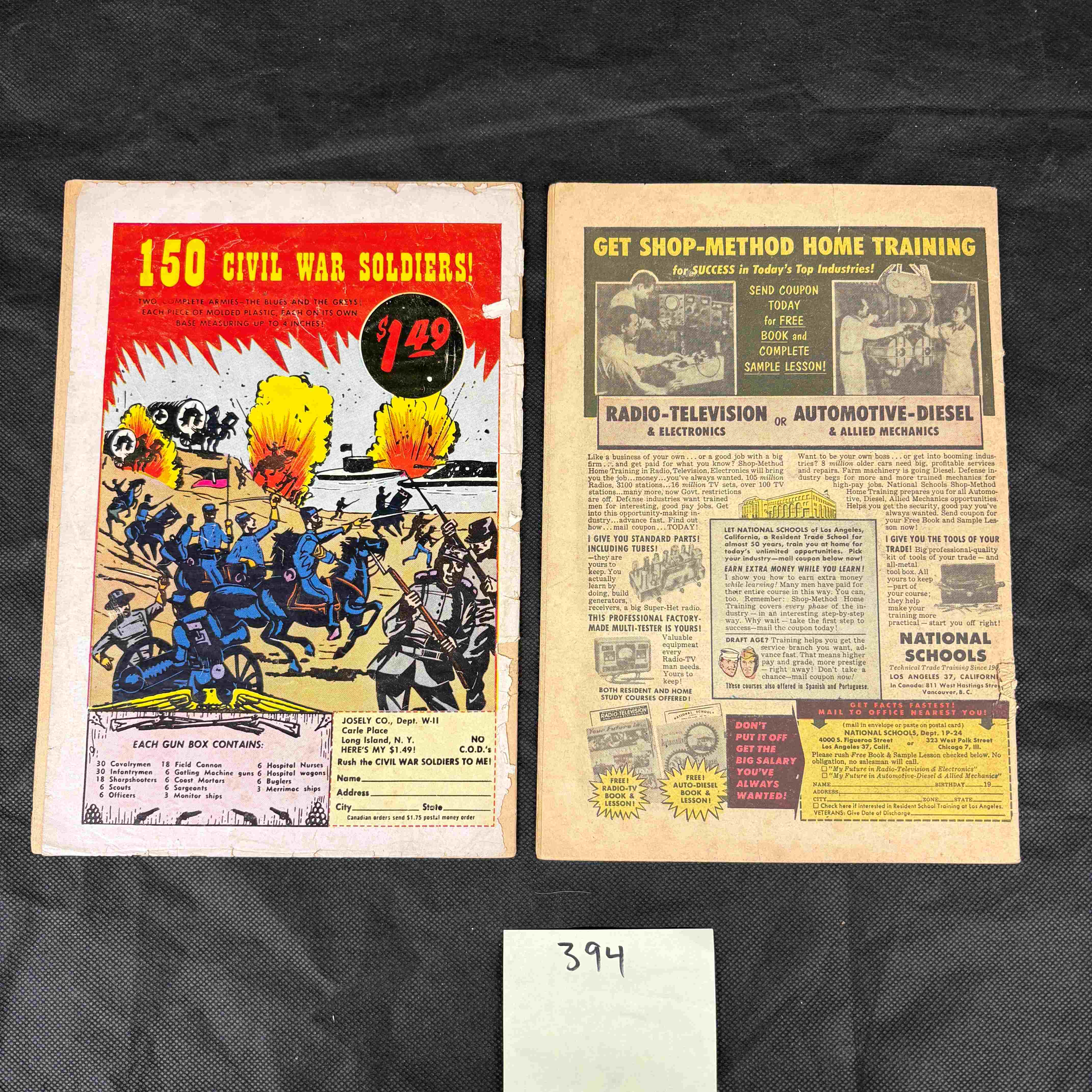 A pair of vintage American comic books from EC Comics’ ‘Crime Suspenstories’ series, comprising Issue #21 and Issue #23. The comic featuring the story ‘THE INFERIORS’ (Issue #23) has ‘SCHOLASTIC MAGAZINES’ printed along its left edge. Its reverse displays an advertisement for ‘150 CIVIL WAR SOLDIERS!’ priced at ‘$1.49’. The comic featuring the story ‘THIS’LL KILL YOU!’ (Issue #21) has an advertisement on its reverse for ‘GET SHOP-METHOD HOME TRAINING’ for ‘RADIO-TELEVISION & ELECTRONICS’ and ‘AUTOMOTIVE-DIESEL & ALLIED MECHANICS.’ Both comics are made of printed paper, consistent with mid-20th century production.
