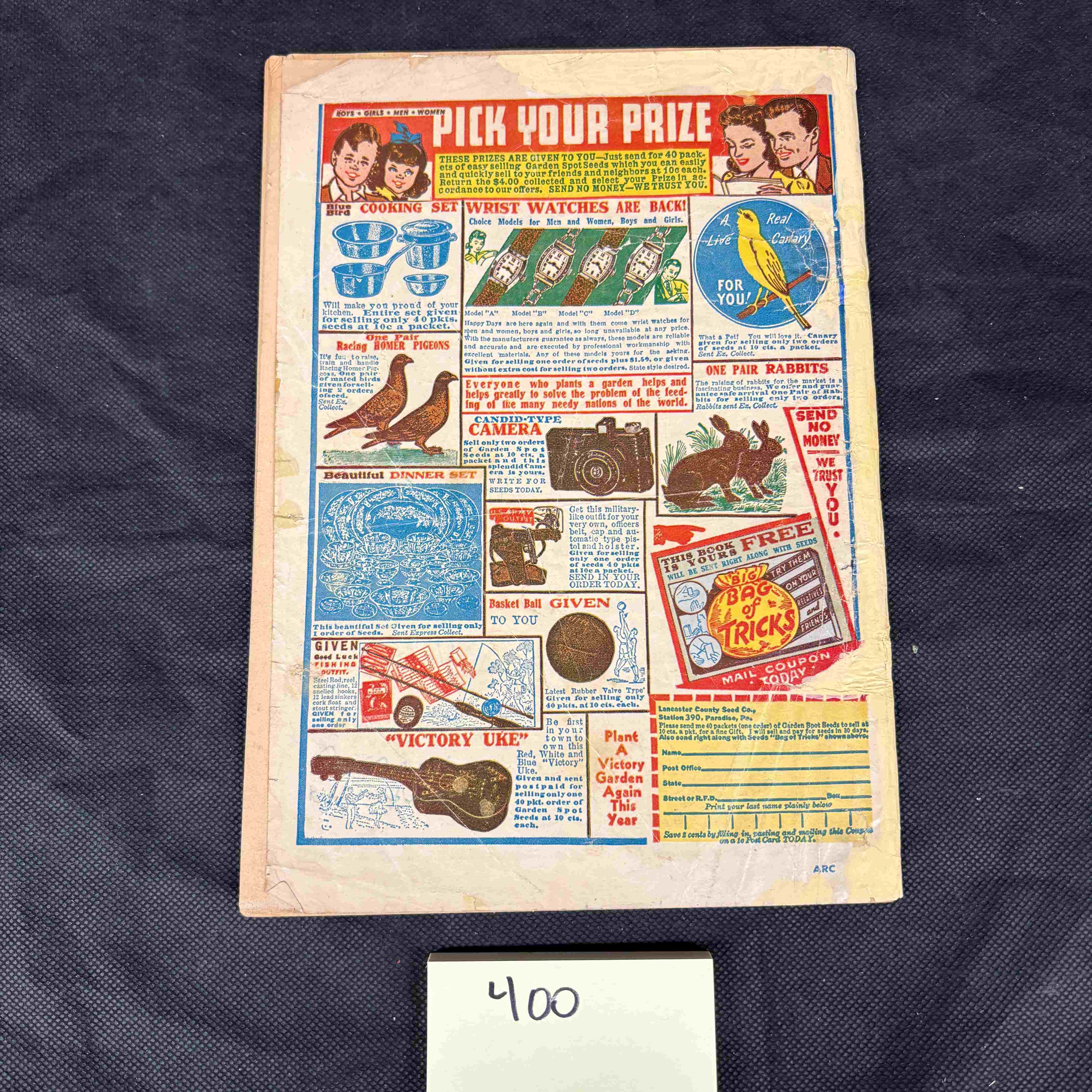 Good vintage condition, consistent with age and use. Exhibits creases, edge chipping, and minor tears to the covers and pages. Spine shows wear. General discoloration and toning to the paper. Cover colors remain relatively vibrant.