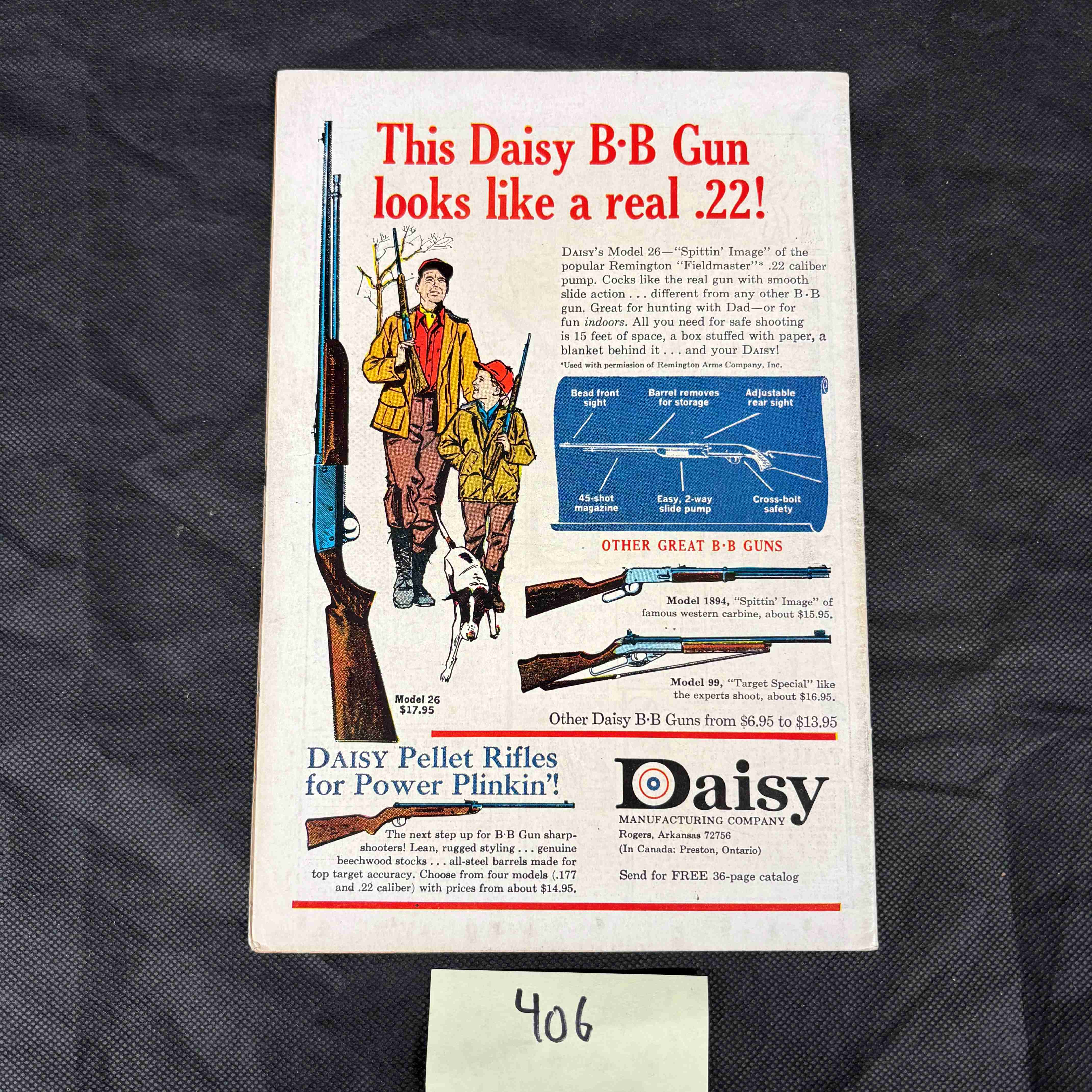 A copy of Harvey Thriller: Spyman Top Secret Adventures, Issue No. 3, published February 1966. This American comic book, characteristic of the Silver Age period, features a 12-cent price and the “APPROVED BY THE COMICS CODE AUTHORITY” seal. The colorful front cover, rendered in a classic comic art style, depicts the character Spyman in a red suit engaged in battle with a large purple “Electro-Robot.” The cover includes speech bubbles stating, “KNIFE BEHIND ME, SPYMAN! THE POWERFUL LURKING ELECTRO-ROBOT GAINS THE UPP HAND! HE… HE IS A MACHINE!” and a caption asking, “CAN THE AGENTS OF LIBERTY RESIST THE MACHINE THAT CONTROLS MEN’S MINDS?”. A detailed diagram labeling parts of “SPYMAN’S ELECTRO-ROBOT HAND” is also visible. The back cover features a full-page advertisement for Daisy B·B Guns and Pellet Rifles. Constructed from printed paper.