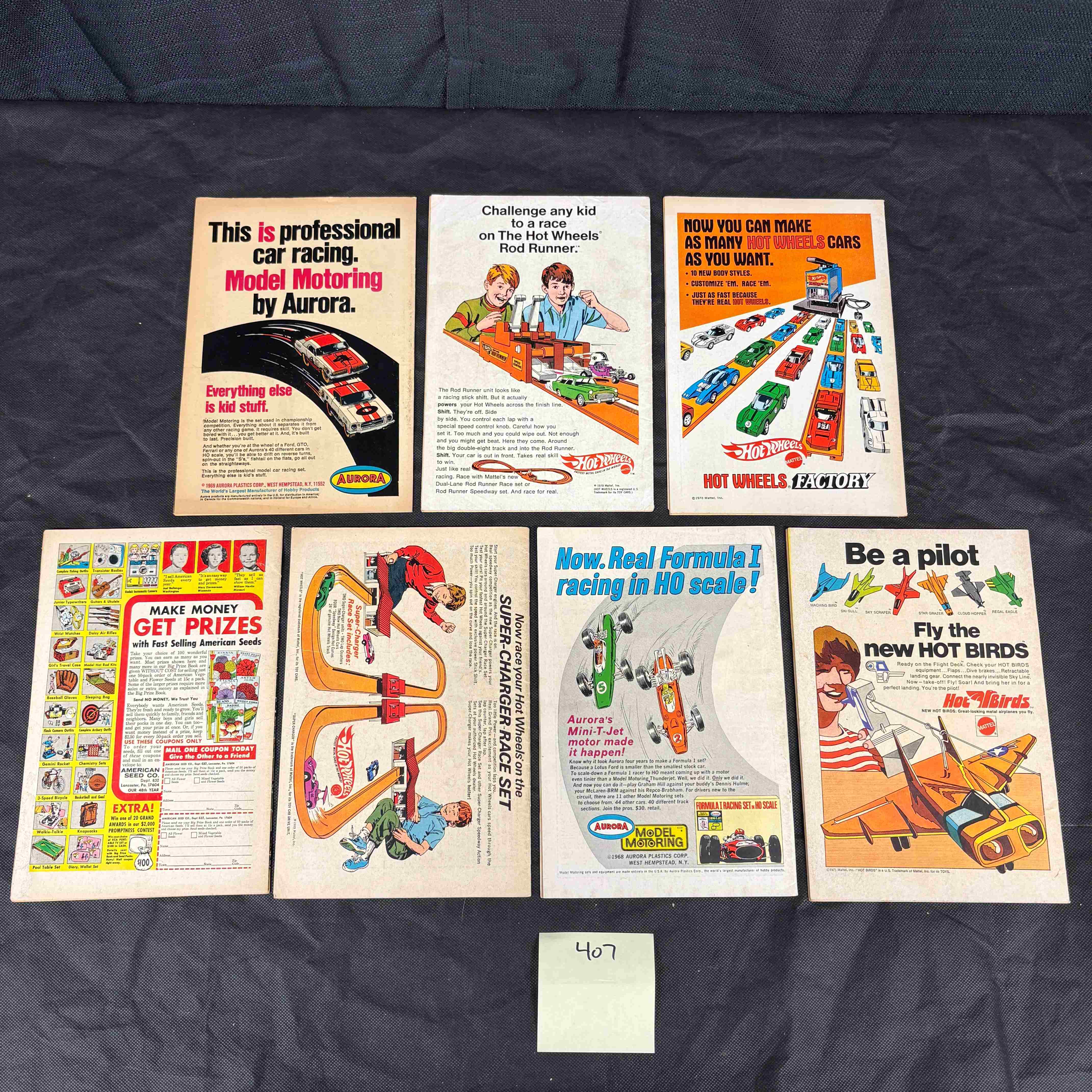 A group of 7 vintage DC Comics, featuring ‘The Brave and the Bold #85’ which marks the first appearance of Green Arrow’s new costume by Neal Adams. The lot includes issues #80, #81, #84, #85, #88, #89, #90, and #91 of ‘The Brave and the Bold’ series. These issues date from 1968 to 1970, and originally retailed for 12c or 15c. The comics predominantly feature Batman alongside other iconic characters such as Wonder Woman, Flash, Doom Patrol, Adam Strange, Black Canary, Aquaman, and Sgt. Rock. The comics showcase vibrant, illustrative covers typical of the Silver and early Bronze Age of comics, with visible titles including “The Widow-Maker!”, “You Only Die Twice!”, and “Welcome to Fun City!”. The reverse side of the lot features a collection of full-page comic book advertisements from the same period, promoting products such as Aurora Model Motoring slot car sets, Hot Wheels cars, and various mail-order items like “American Seeds” and “Hot Birds” flying models. All comics are printed on paper. A small green sticky note with “407” handwritten in black is visible on both sides of the lot.