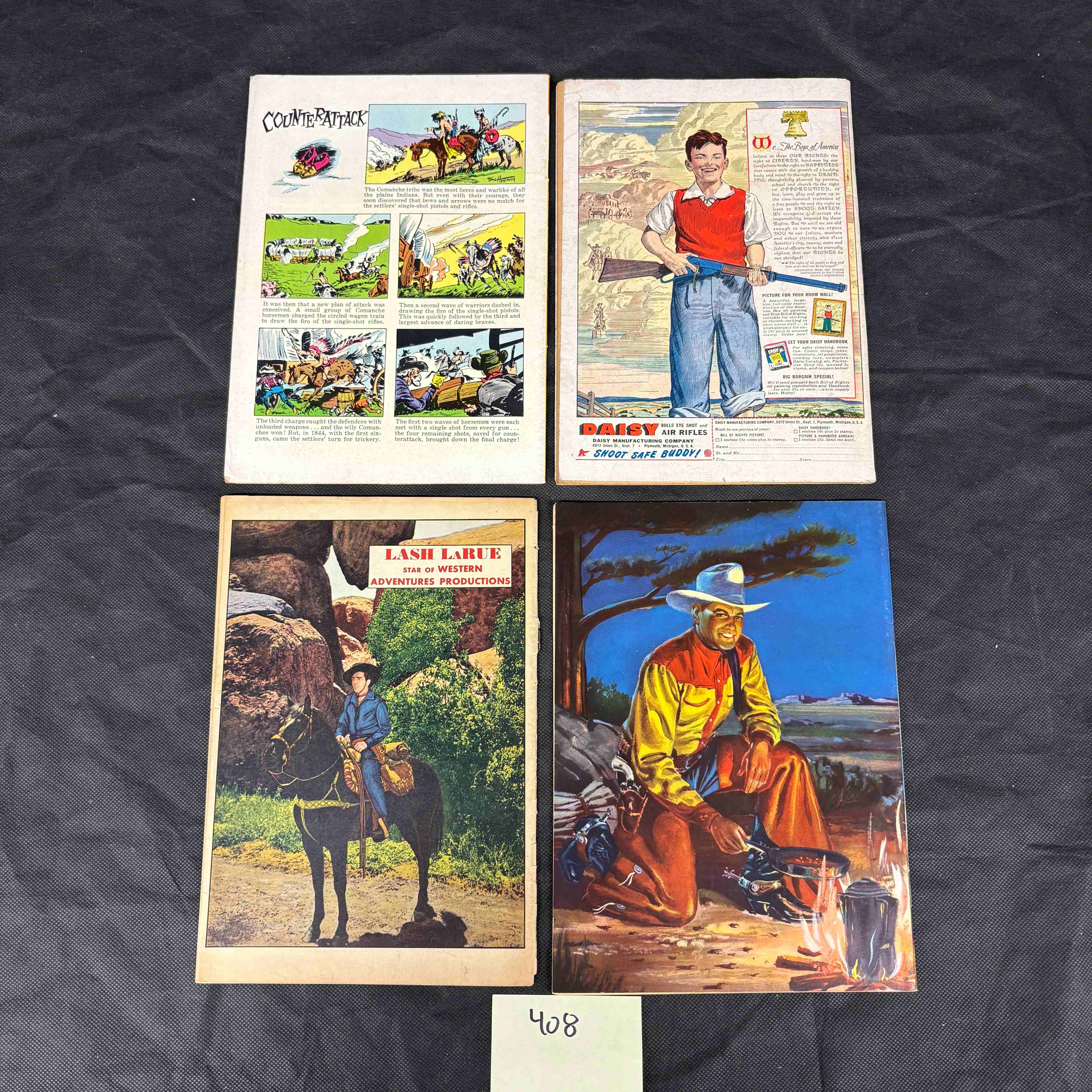 A group of four vintage American Western-themed comic books, likely dating to the mid-20th century, each originally priced at 10 cents with paper covers. The lot includes “RED RYDER Ranch Comics No. 124” by Dell, featuring the storyline ‘FEAR HID THE SECRET OF “THE EMPTY FORT!”‘. Also present is “HOPALONG CASSIDY No. 85” by Fawcett Publications, starring William Boyd, with the storyline ‘LAND OF THE LAWLESS!’. The group further comprises “LASH LARUE WESTERN No. 8” by Fawcett Publications, introducing ‘The AWFUL TRUTH ABOUT THE WORLD-FAMOUS TWO-GUN COWBOY OF THE SCREEN!’, and “BUCK JONES No. 2” by Dell, which web intelligence suggests is from approximately 1951. The back covers feature a ‘COUNTER ATTACK!’ comic strip, an advertisement for ‘DAISY AIR RIFLES,’ a promotional photo for ‘LASH LARUE ADVENTURES PRODUCTIONS,’ and a Western art scene.