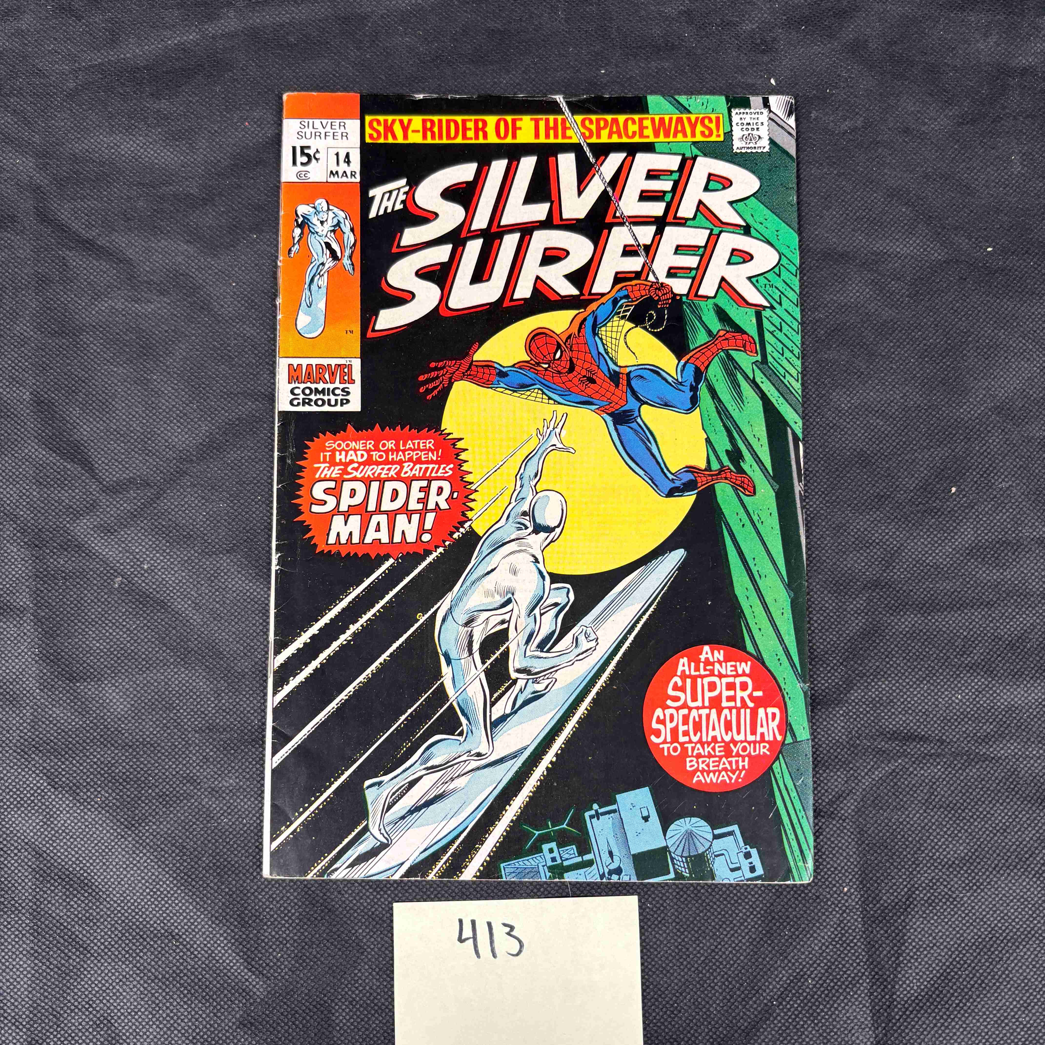 A vintage Marvel Comics Group ‘The Silver Surfer’ issue number 14, originally published in 1968. The front cover features vibrant artwork depicting the Silver Surfer and Spider-Man, with text stating ‘SKY-RIDER OF THE SPACEWAYS!’ and ‘THE SURFER BATTLES SPIDER-MAN!’. It bears the ‘APPROVED BY THE COMICS CODE AUTHORITY’ seal and is marked ‘MAK’ with an original price of 15¢. The back cover presents an advertisement for the ‘Famous Artists School’ titled ‘Do you have art talent worth developing? Take our free test and see’.